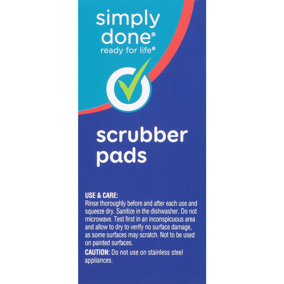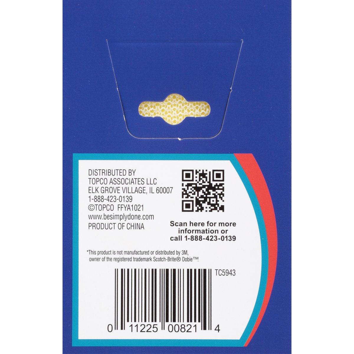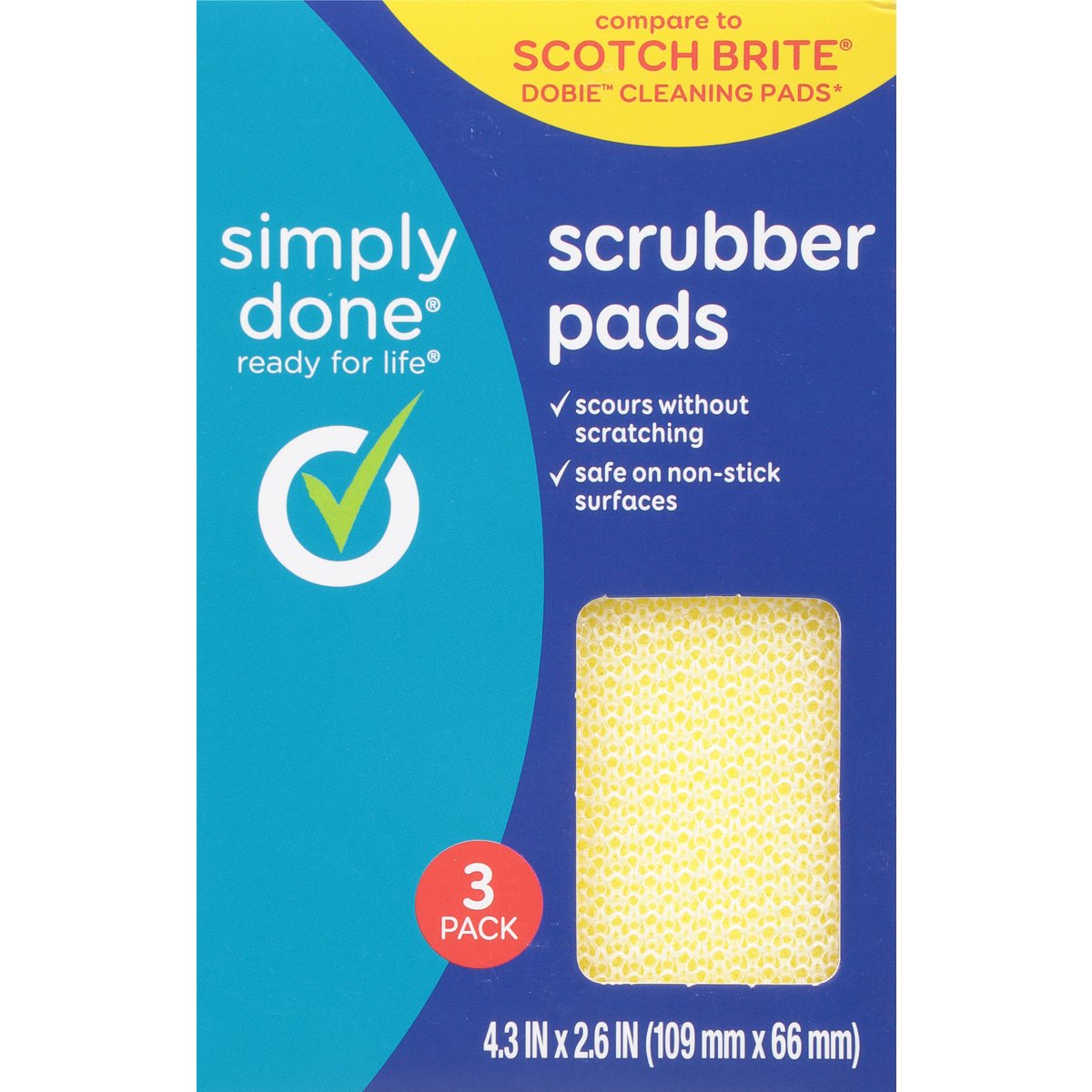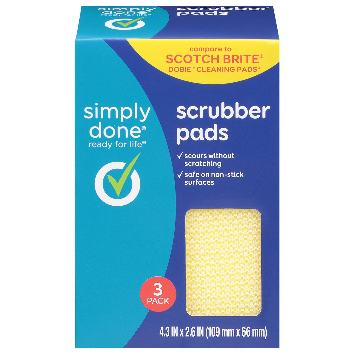 4.3 in x 2.6 in (109 mm x 66 mm). Ready for life. Compare to Scotch Brite Dobie Cleaning Pads (This product is not manufactured or distributed by 3M, owner of the registered trademark Scotch-Brite Dobie). Scours without scratching. Safe on non-stick surfaces. Quality Guarantee: If you are not 100% satisfied, return our product for a full refund. www.besimplydone.com. Scan for more information or call 1-888-423-0139. Product of China.