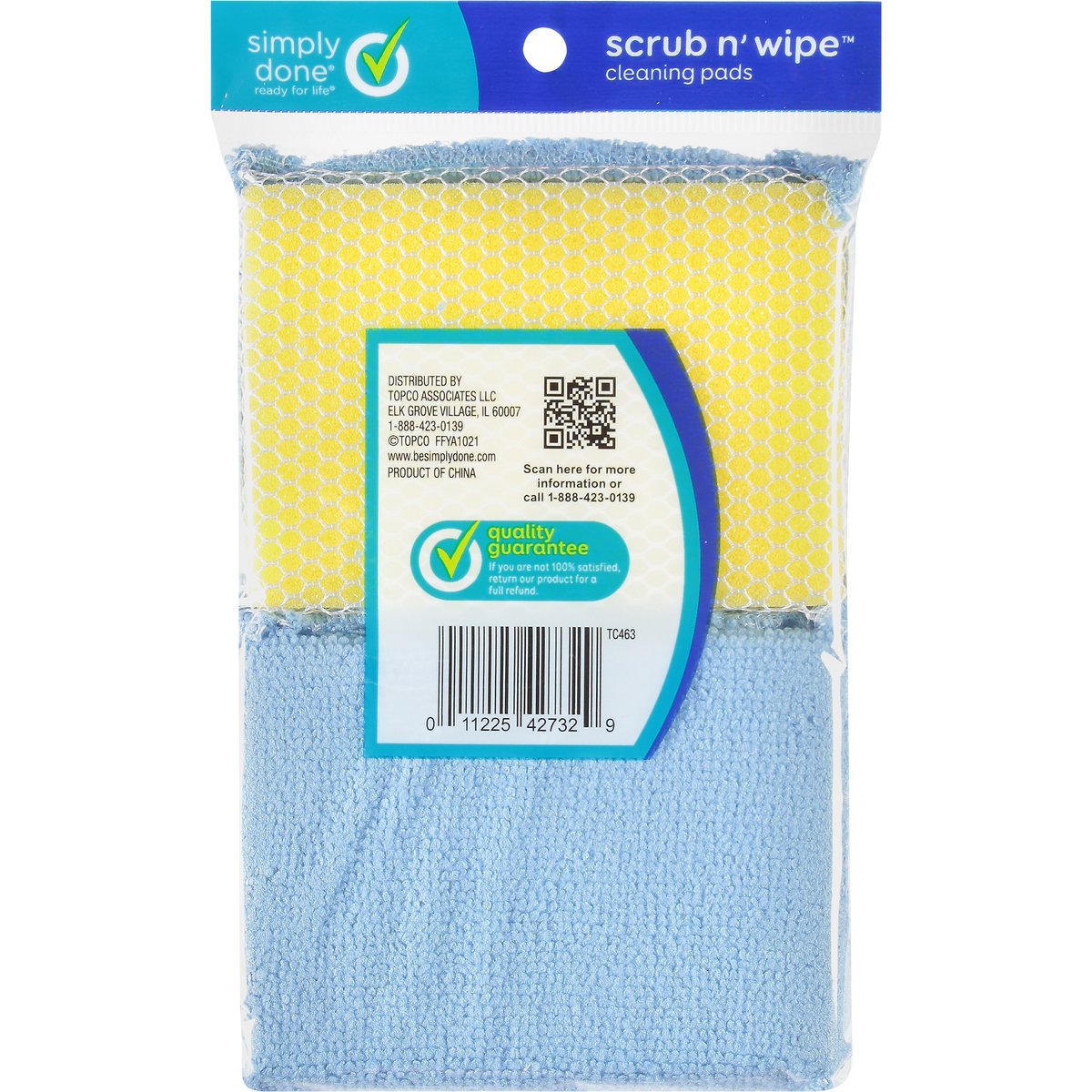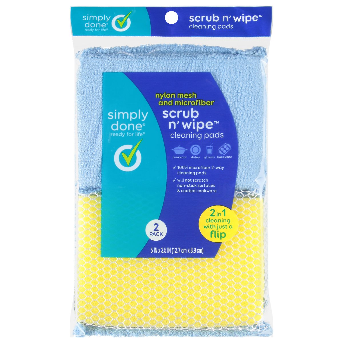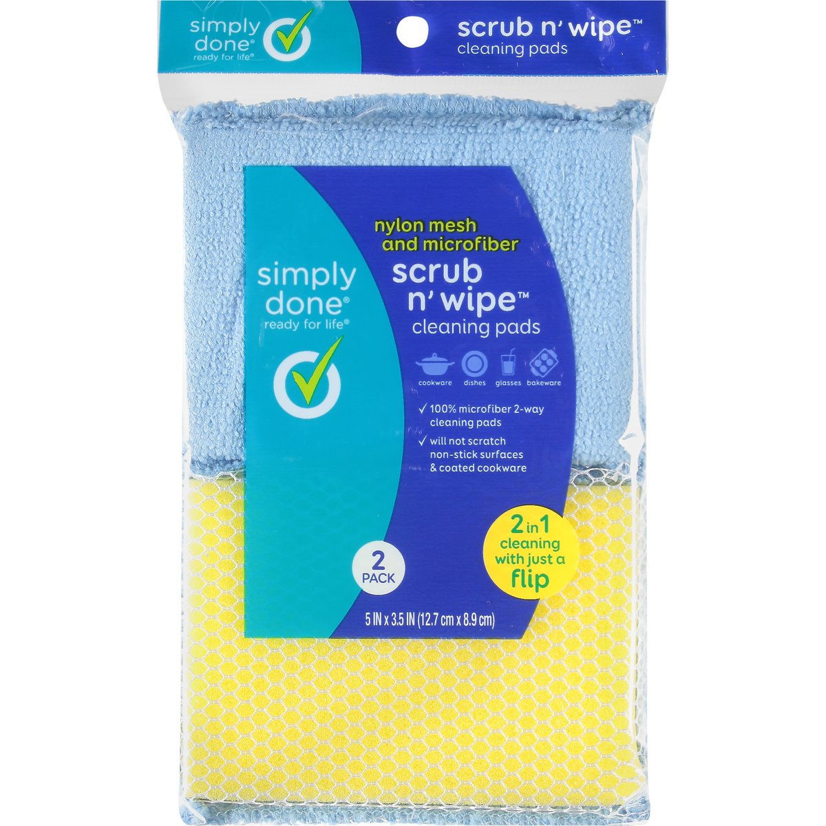 Nylon mesh and microfiber. 5 in x 3.5 in (12.7 cm x 8.9 cm). Ready for life. Cookware. Dishes. Glasses. Bakeware. 100% microfiber 2-way cleaning pads. Will not scratch non-stick surfaces & coated cookware. 2 in 1 cleaning with just a flip. Quality Guarantee: If you are not 100% satisfied, return our product for a full refund. www.besimplydone.com. Scan for more information or call 1-888-423-0139. Product of China.