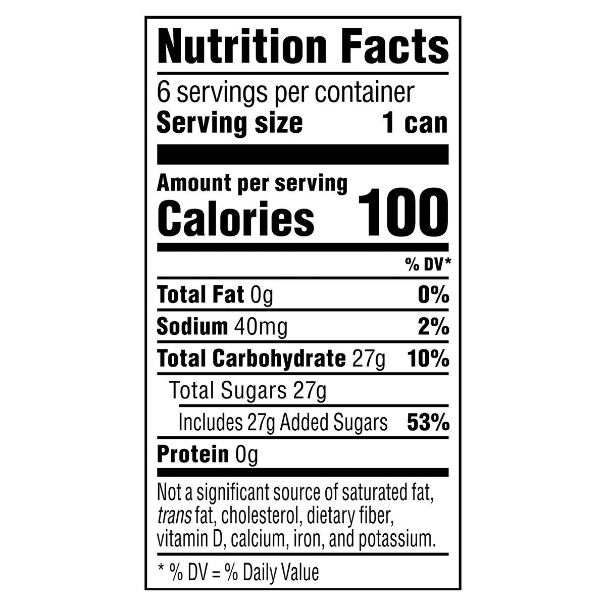 Per Can: 100 calories; 0 g sat fat (0% DV); 40 mg sodium (2% DV); 27 g added sugars. Mini. Little can. Big taste. See unit container for manufacturer's identity. how2recycle.info. SmartLabel; Scan here for more food information or call 1-800-433-2652 Refresh then recycle.