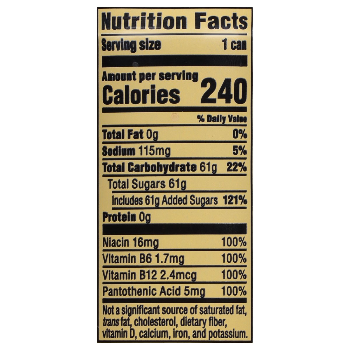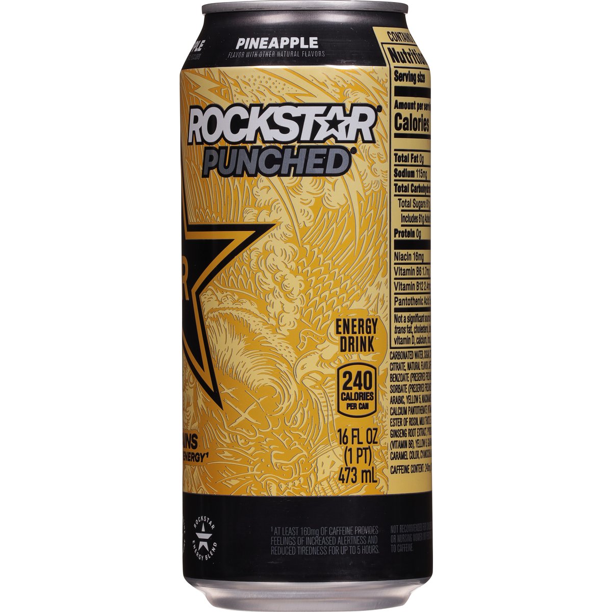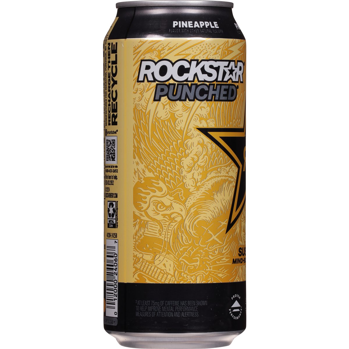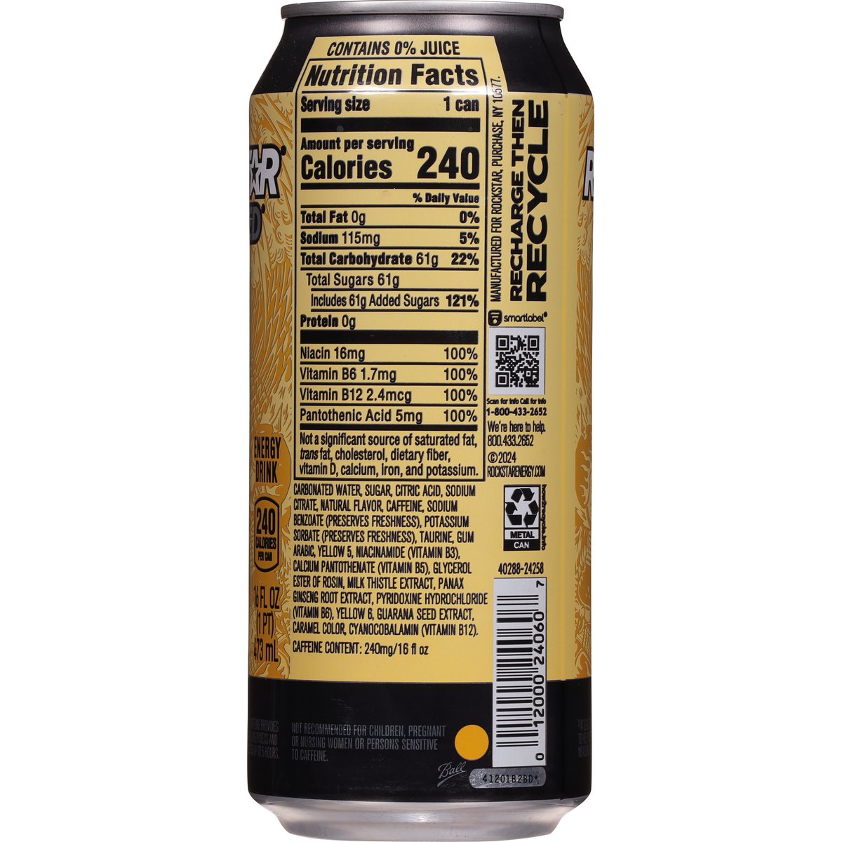 Flavor with other natural flavors. 240 calories per can. 240 mg caffeine. Caffeine Content: 240mg/16 fl oz. Sustains mind-body energy (1). Proven performance (2). Rockstar energy blend. (1) At least 160 mg of caffeine provides feeling of increased alertness and reduced tiredness for up to 5 hours. (2) At least 75 mg of caffeine has been shown to help improve mental performance measures of attention and alertness. rockstarenergy.com. how2recycle.info. Scan for info call for info 1-800-433-2652. We're here to help. 800.433.2652. Recharge then recycle.