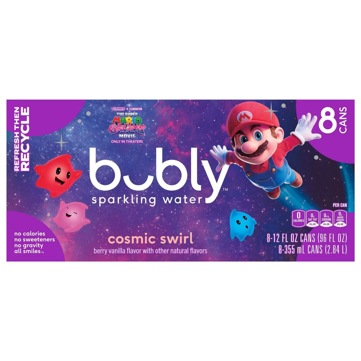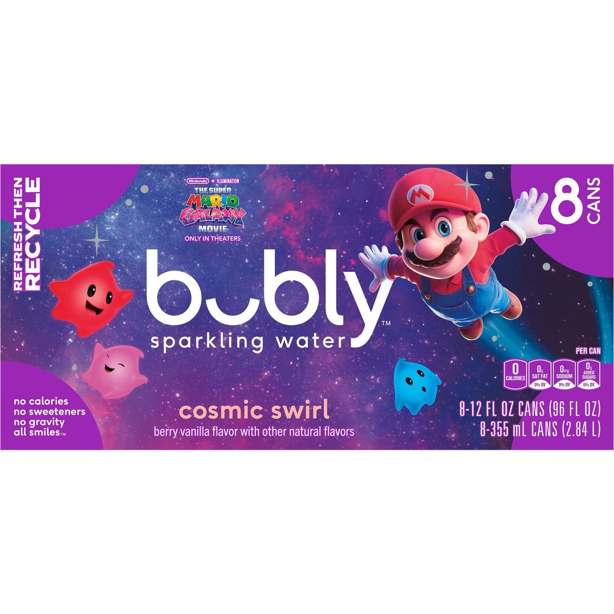 Berry vanilla flavor with other natural flavors. Natural flavors. Per Can: 0 calories; 0 g sat fat (0% DV); 0 mg sodium (0% DV); 0 g added sugars (0% DV). NinTendo + Illumination. The Super Mario Galaxy Movie. Only in theaters. No calories. No sweeteners. No gravity. All smiles. My taste buds are in orbits. Chill the can to reveal a color change! how2recycle.info. SmartLabel: Scan for more food information or call 800.433.2652. We're here to help. 800.433.2652. Find this special galaxy can inside for a chance to win a galaxy getaway. * See back panel for details. Galatic mission. Scan bubly cans to collect Star Bits for a chance to redeem for movie rewards and more! bubly.com/galacticmission. * See back panel for details. * No purchase necessary. For free code via email, send name, address, phone, email, and date of birth postmarked by 5/8/26 to: bubly Galactic Mission Promotion, PO Box 90365, Nashville, TN 37209. Open to 50 US & DC, 18+ (19 in AL & NE). Void where prohibited. Rules at bubly.com/galacticmission. Ends 5/8/26. Limit ten (10) Game Play per day. per household. Sponsor: Pepsi-Cola Company, 700 Anderson Hill Road, Purchase, NY 10577. Refresh then recycle.