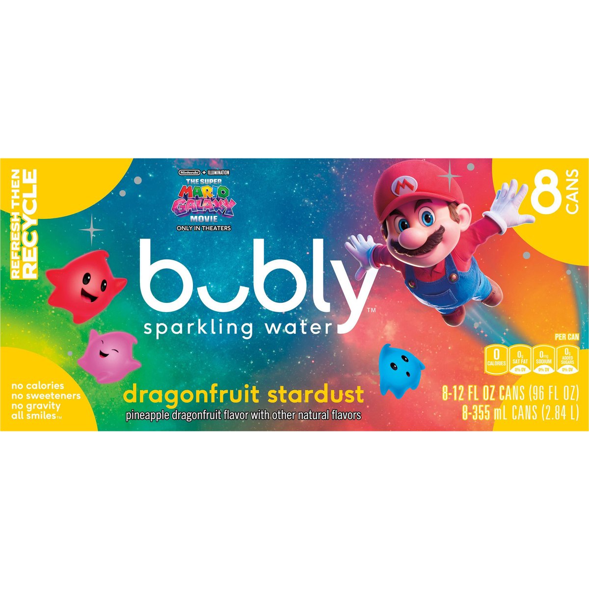 Pineapple dragonfuit flavor with other natural flavors. Natural flavors. Per Can: 0 calories; 0 g sat fat (0% DV); 0 mg sodium (0% DV); 0 g added sugar (0% DV). NinTendo + Illumination. The Super Mario Galaxy Movie. Only in theaters. No calories. No sweeteners. No gravity. All smiles. You're out of this galaxy. how2recycle.info. SmartLabel: Scan for more food information or call 800.433.2652. We're here to help. 800.433.2652. Find this special galaxy can inside for a chance to win a galaxy getaway. See back panel for details. Galatic mission. Scan bubly can to collect Star Bits for a chance to redeem for movie rewards and more! bubly.com/galacticmission. * See back panel for details. * No purchase necessary. For free code via email, send name, address, phone, email, and date of birth postmarked by 5/8/26 to: bubly Galactic Mission Promotion, PO Box 90365, Nashville, TN 37209. Open to 50 US & DC, 18+ (19 in AL & NE). Void where prohibited. Rules at bubly.com/galacticmission. Ends 5/8/26. Limit ten (10) Game Play per day, per household. Sponsor: Pepsi-Cola Company, 700 Anderson Hill Road, Purchase, NY 10577. Refresh then recycle.