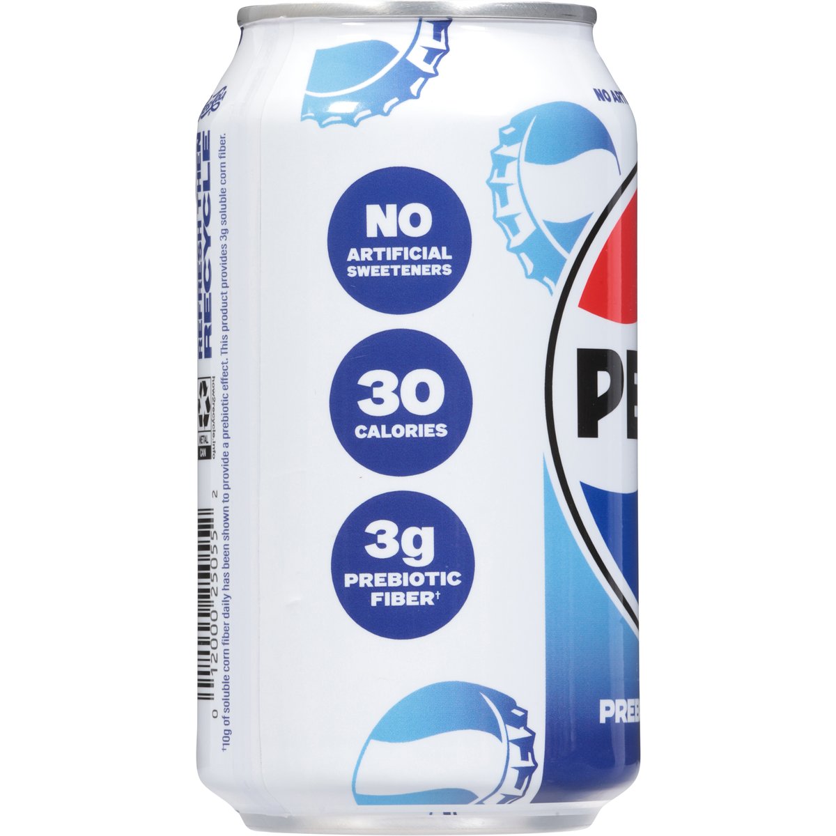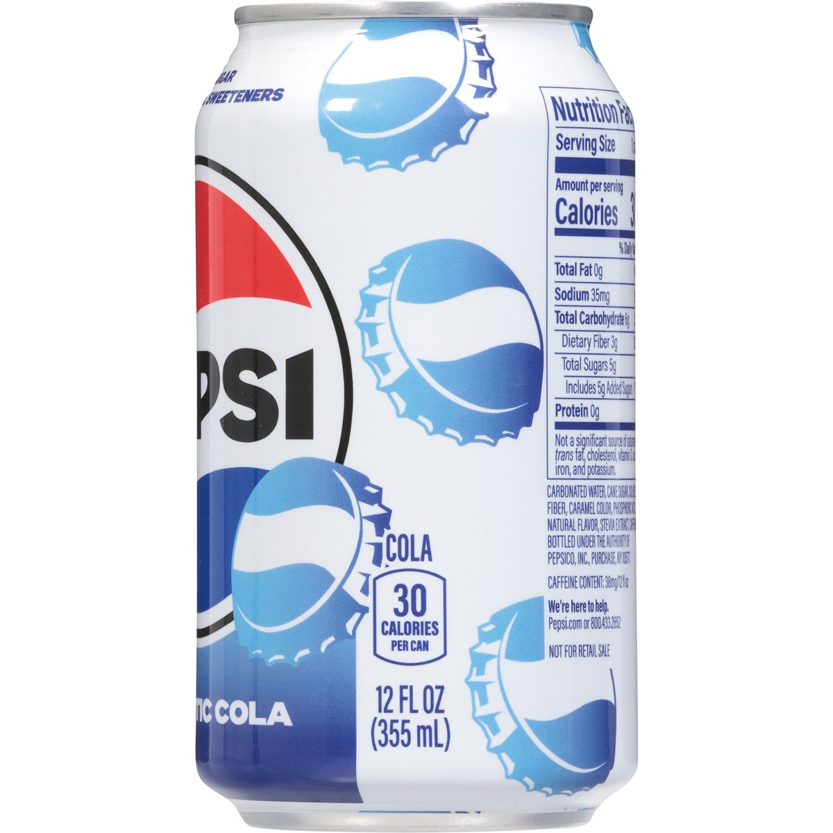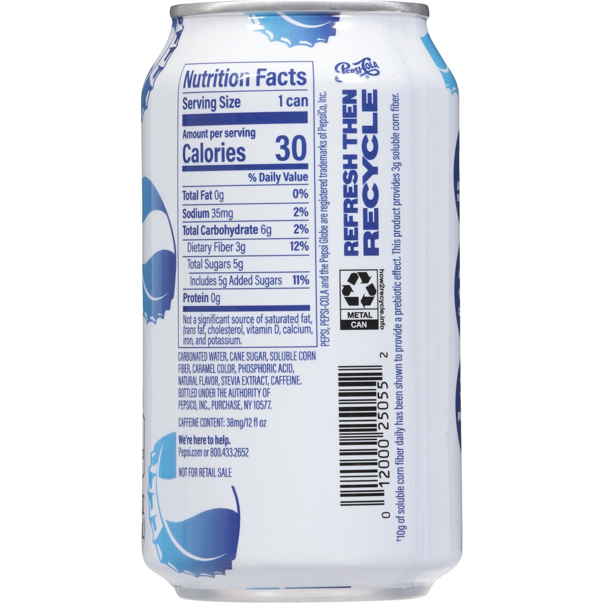 5 g sugar. 30 calories per can. 3 g prebiotic fiber(a). (a) 10g of soluble corn fiber daily has been shown to provide a prebiotic effect. This product provides 3 g soluble corn fiber. Caffeine Content: 38 mg/12 fl oz. No artificial sweeteners. Not for retail sale. Pepsi.com. how2recycle.info. We're here to help. Pepsi.com or 800.433.2652. Refresh then recycle.