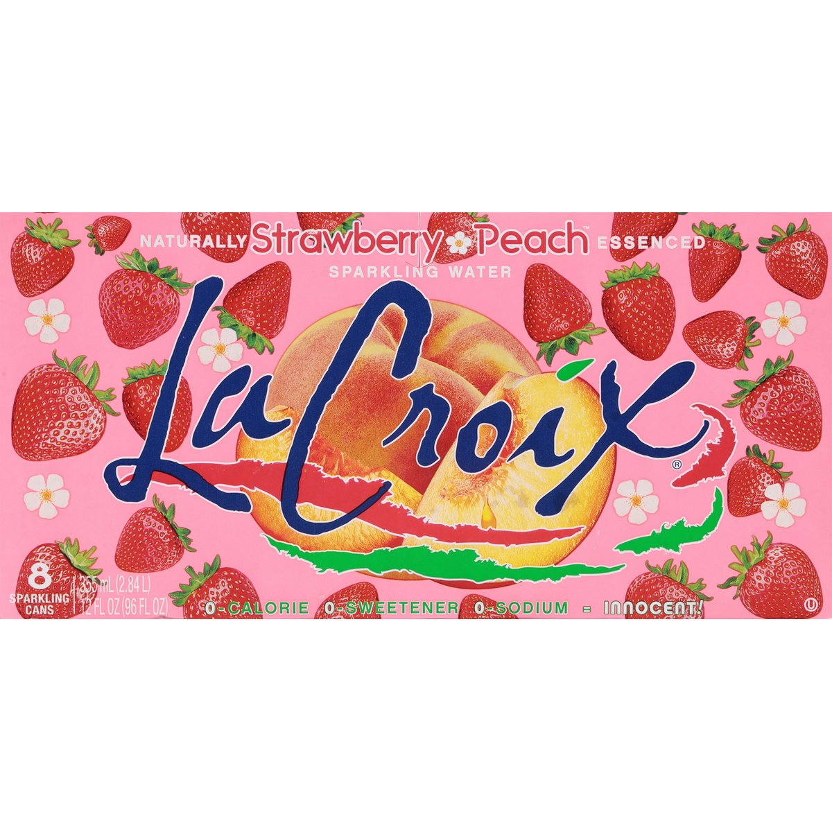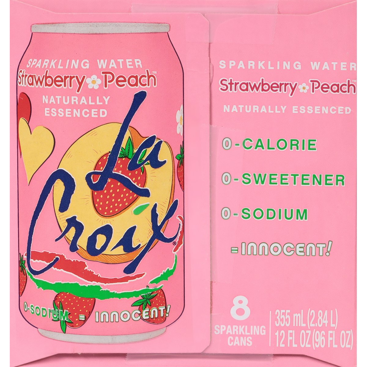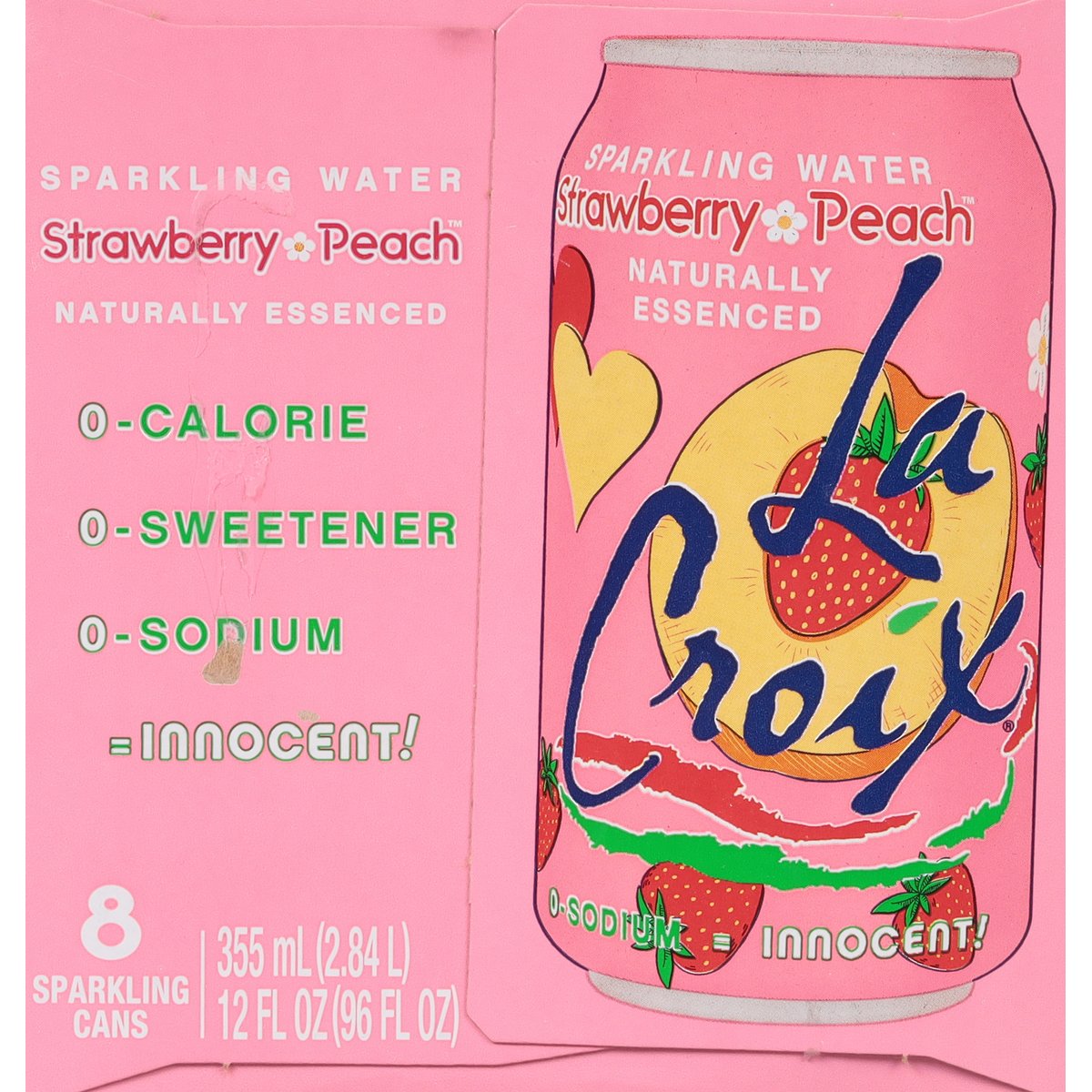 Naturally strawberry peach essenced sparkling water. 0 - Calorie; 0 - Sweetener; 0 - Sodium = Innocent! Naturally essenced. Whole 30 Approved. lacroixwater.com. 1-888-241-7360. 100% recyclable. Please recycle. 100% recyclable. Product of USA.