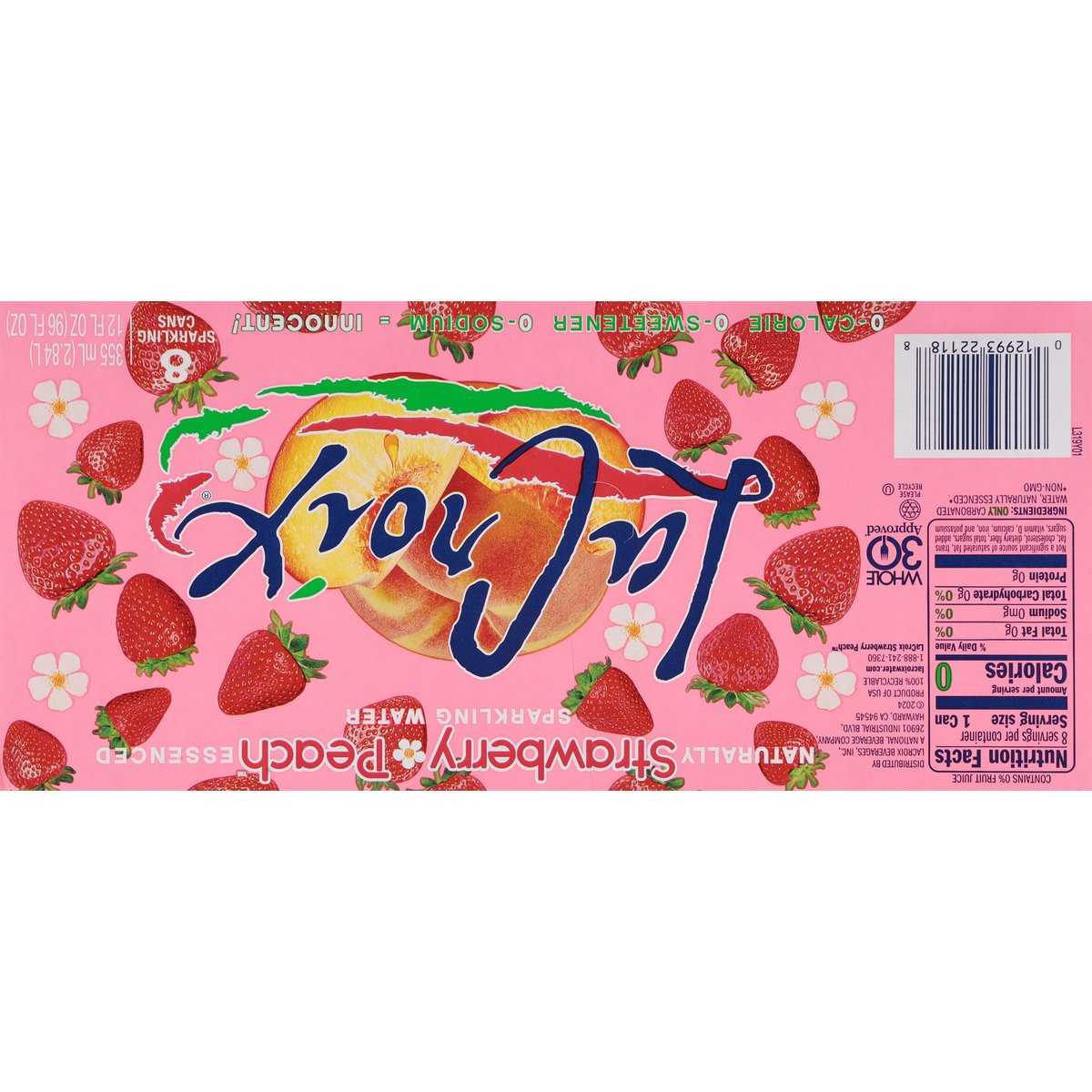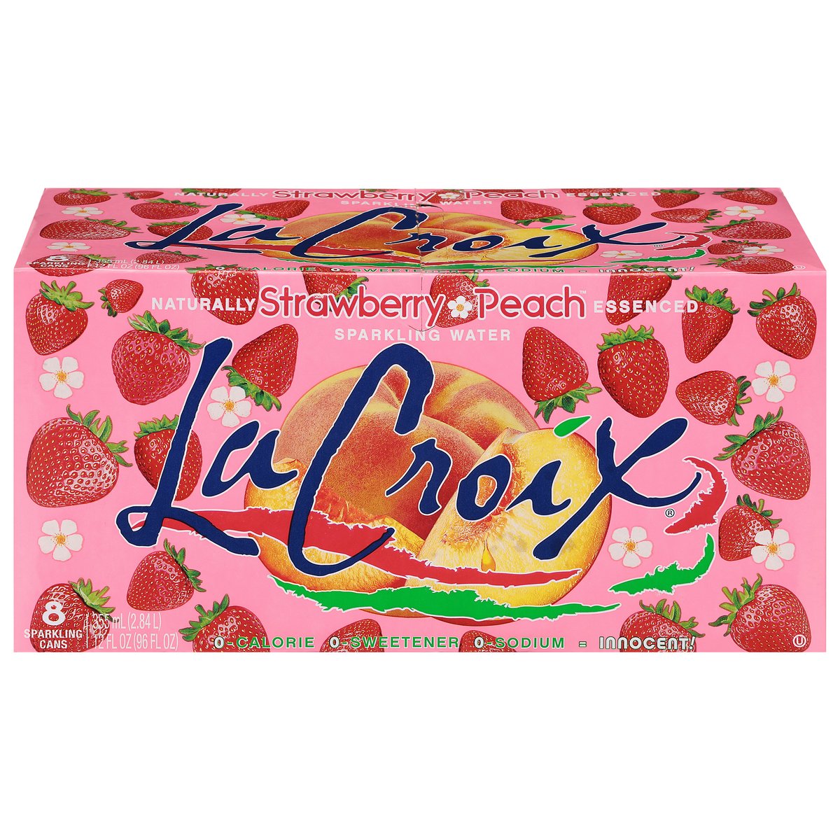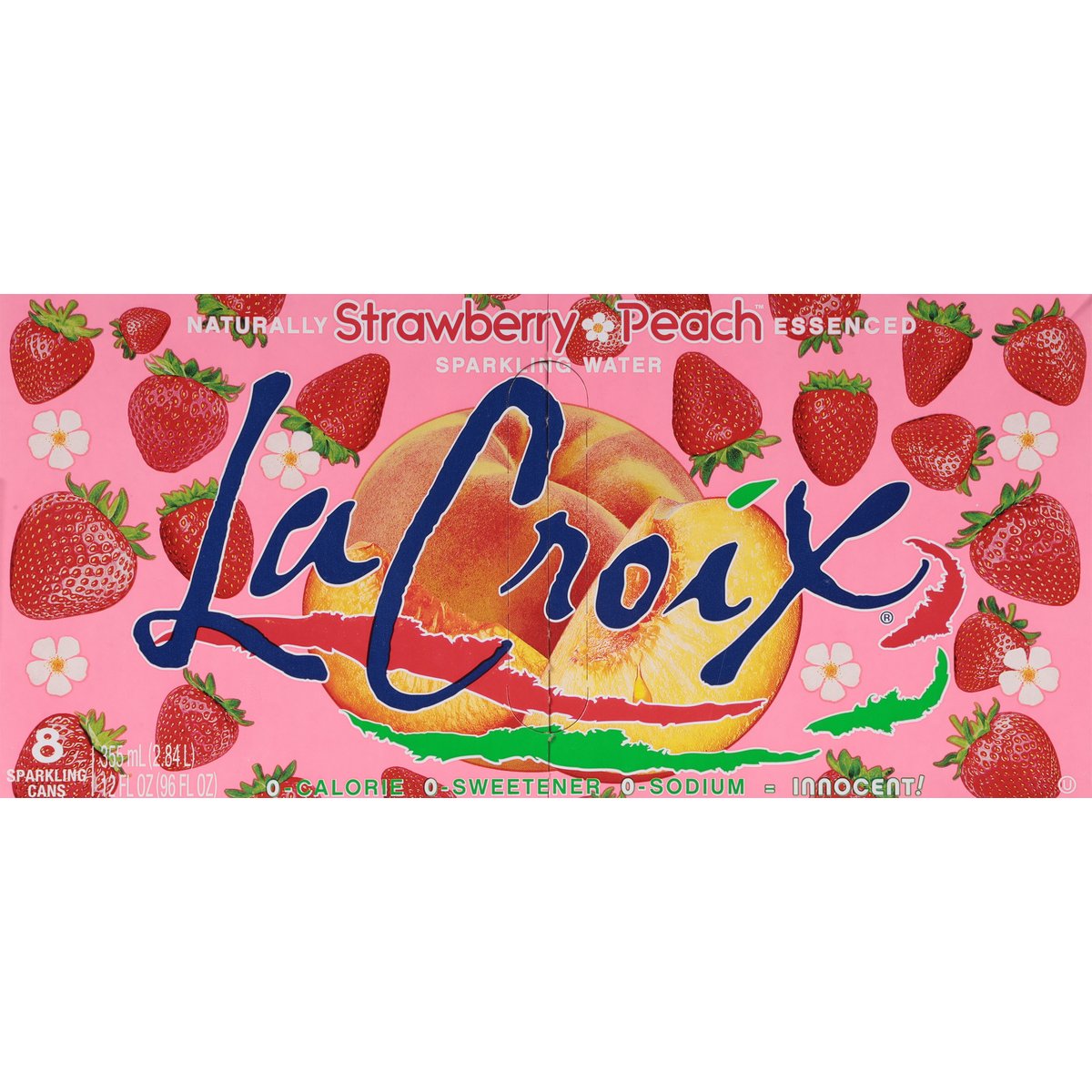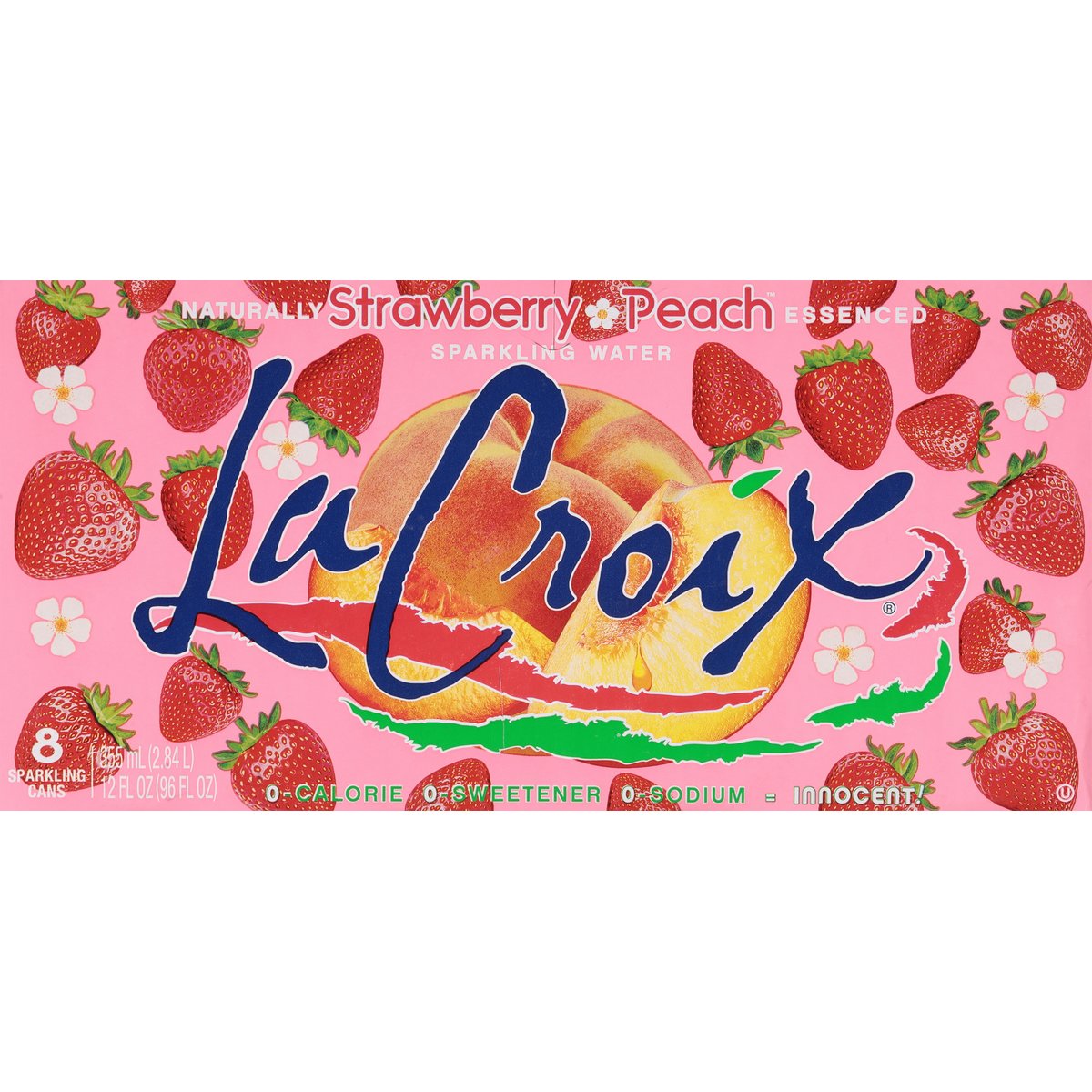 Naturally strawberry peach essenced sparkling water. 0 - Calorie; 0 - Sweetener; 0 - Sodium = Innocent! Naturally essenced. Whole 30 Approved. lacroixwater.com. 1-888-241-7360. 100% recyclable. Please recycle. 100% recyclable. Product of USA.