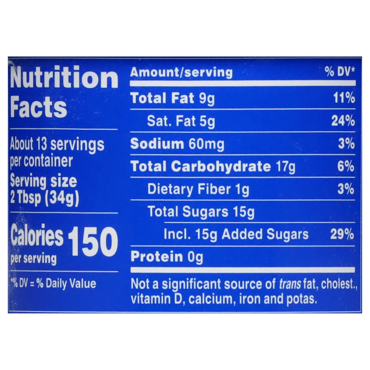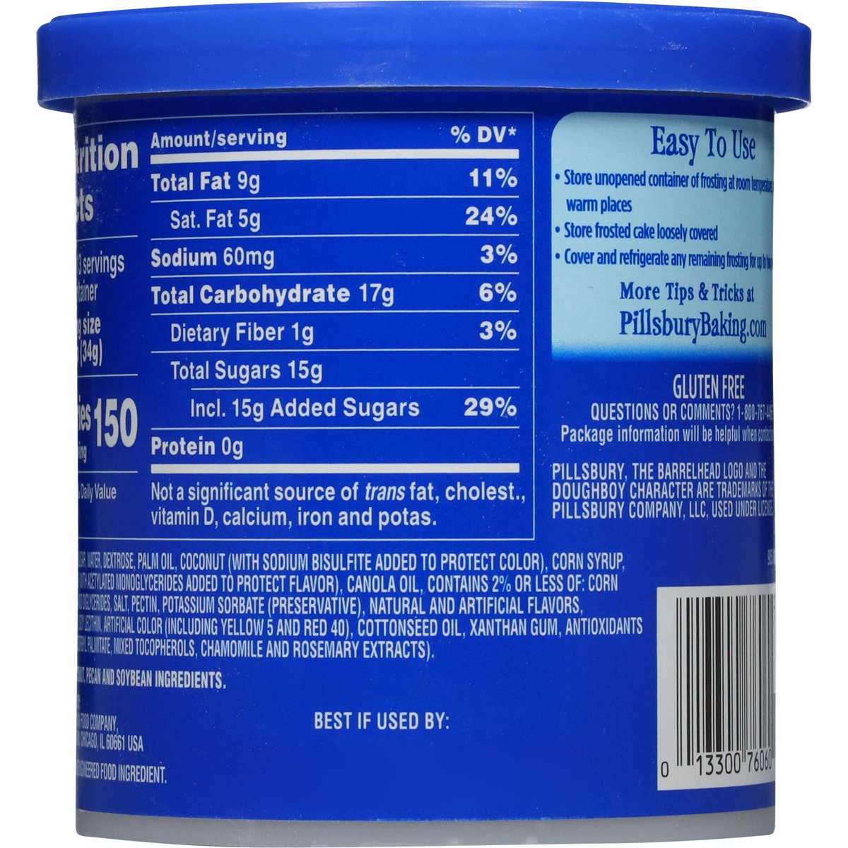 Per 2 Tbsp: 150 calories; 5 g sat fat (24% DV); 60 mg sodium (3% DV); 15 g total sugars. Gluten free. Contains a bioengineered food ingredient. PillsburyBaking.com. Questions or comments? 1-800-767-4466. Package information will be helpful when contacting us. More tips & tricks at PillsburyBaking.com.
