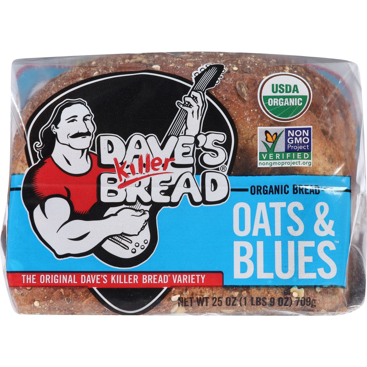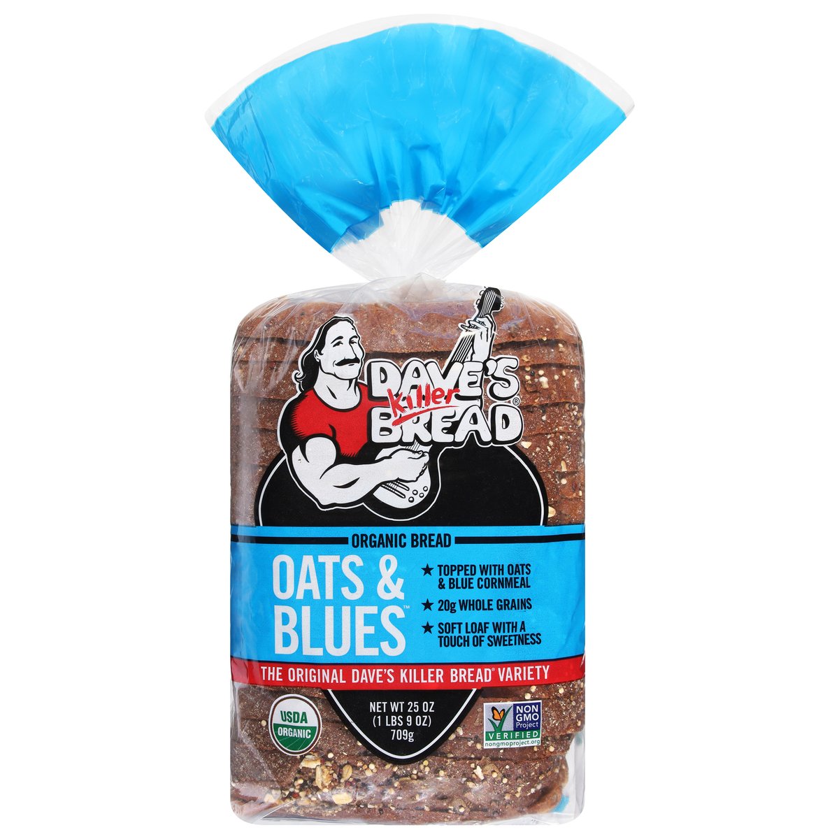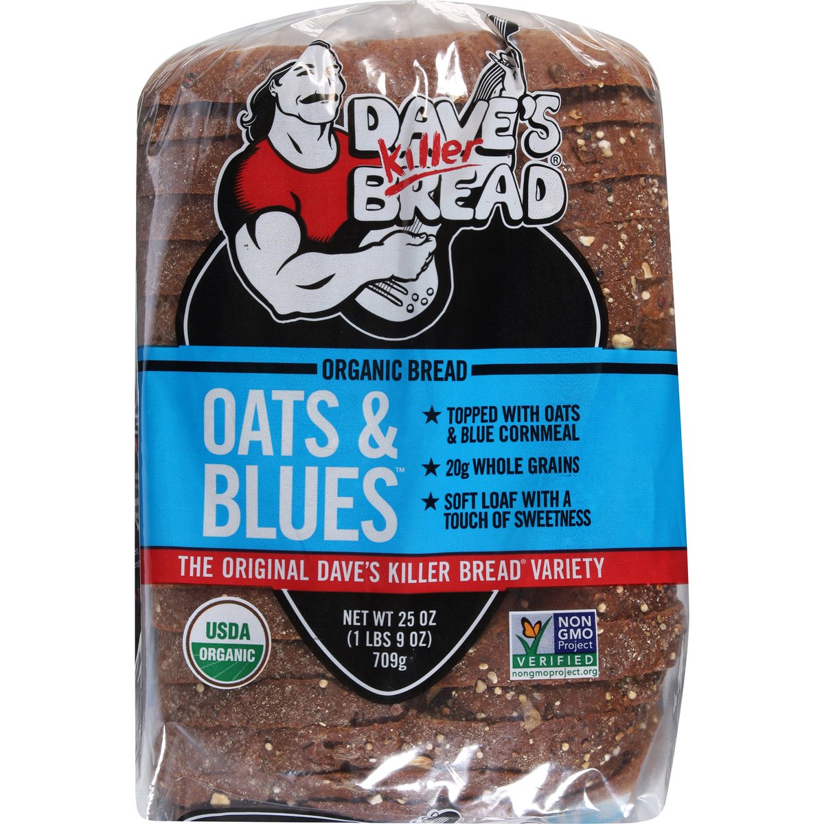 Topped With Oats & Blue Cornmeal. 20 g whole grains. Always USDA Organic; QAI: Quality Assurance International. Certified Organic. Certified Organic by: QAI Inc; Whole Grain: Whole Grain 12g or more per serving. Eat 48g or more of whole grains daily. WholeGrainsCouncil.org. Non-GMO Project verified. nongmoproject.org. Always Non-GMO. Topped with oats & blue cornmeal. Soft loaf with a touch of sweetness. No high fructose corn syrup. No artificial preservatives. No artificial ingredients. Always power-packed with whole grains. Always USDA Organic. Always Non-GMO. Always made with killer taste and texture. 15 years in prison. That's a tough way to find yourself. Dave Dahl realized he was in the wrong game and knew he had more to offer. His brother, Glenn, saw a change in him and gave Dave a second chance by welcoming him back to the family bakery. Dave set out to make a loaf like no other - the most nutritious, organic whole grain bread - and the result is what he called "killer" bread. Dave's Killer Bread is built on the belief that everyone is capable of greatness. What began as one man's journey has turned into so much more. Today, one third of the employees at our Oregon bakery have a criminal background, and we have witnessed first-hand how stable employment sparks personal transformation. Oat & Blues is back for a limited time to celebrate DKB's 20th anniversary! The original Dave's Killer Bread variety, this loaf is topped with oats and blue cornmeal, giving it a slightly sweet flavor and crunchy crust. It's perfect for sandwiches, toast, or straight out of the bag. daveskillerbread.com. daveskillerbread.com/contact. Spread the love! Facebook. Twitter. Instagram. YouTube. Questions or comments? daveskillerbread.com/contact. Learn more at: daveskillerbread.com. Stand behind. Second chances. Everyone is capable of greatness. Dave's Killer Bread has witnessed first-hand how stable employment sparks transformation in people with criminal backgrounds. Pledge your support and motivate more companies to harness the power of Second Chance Employment. Please recycle or reuse this bag.