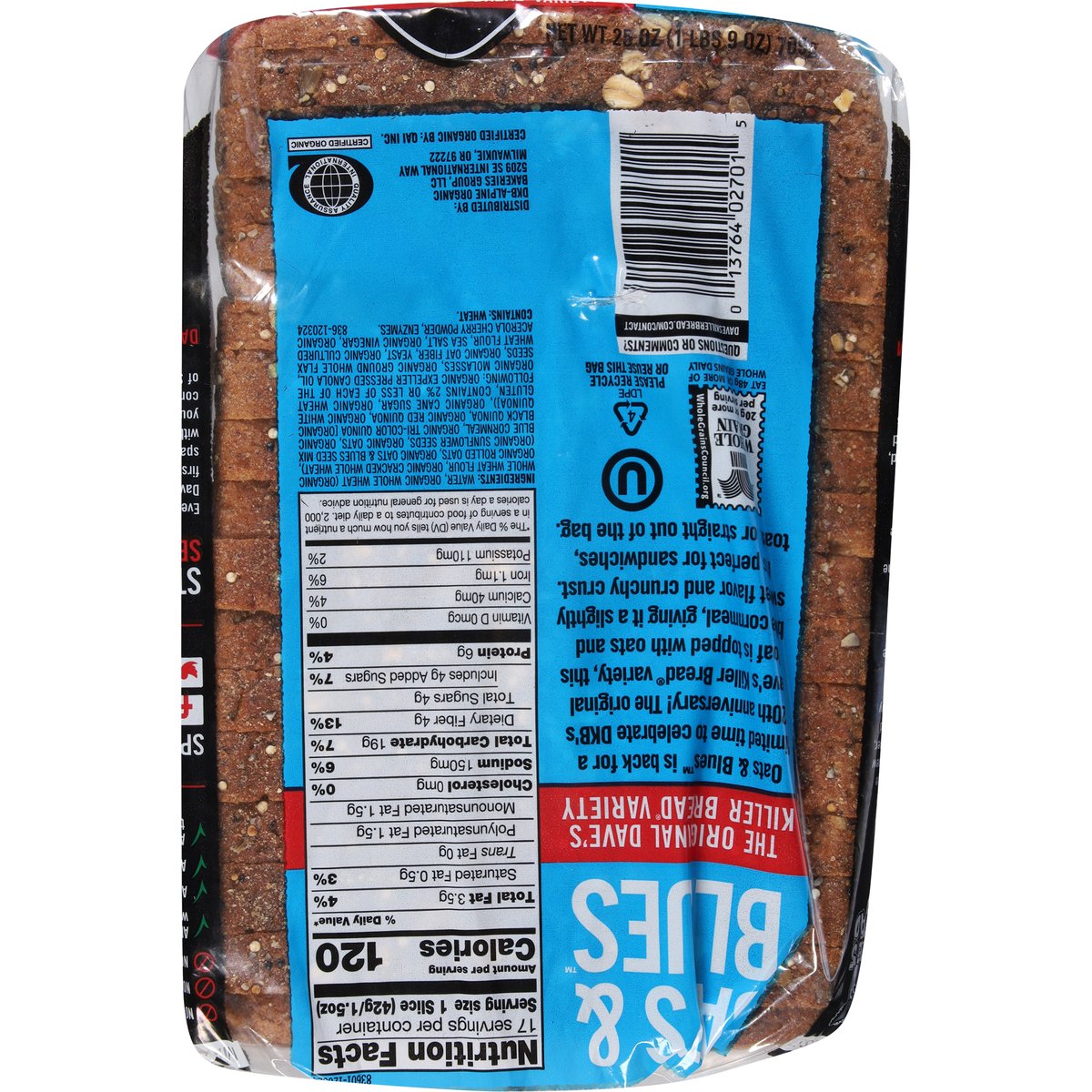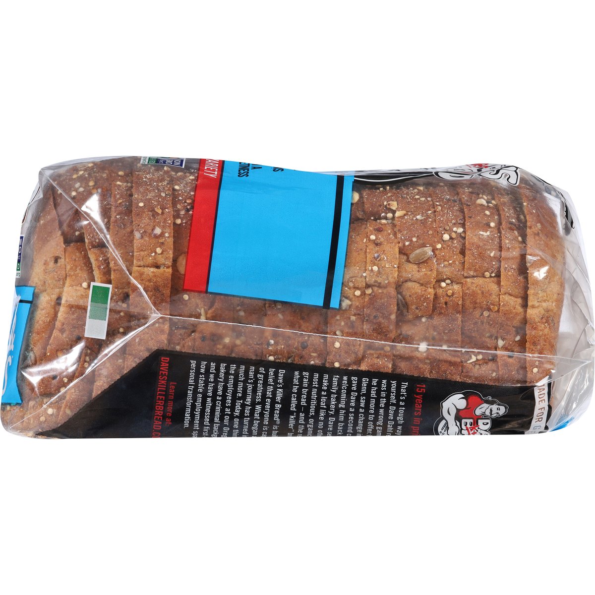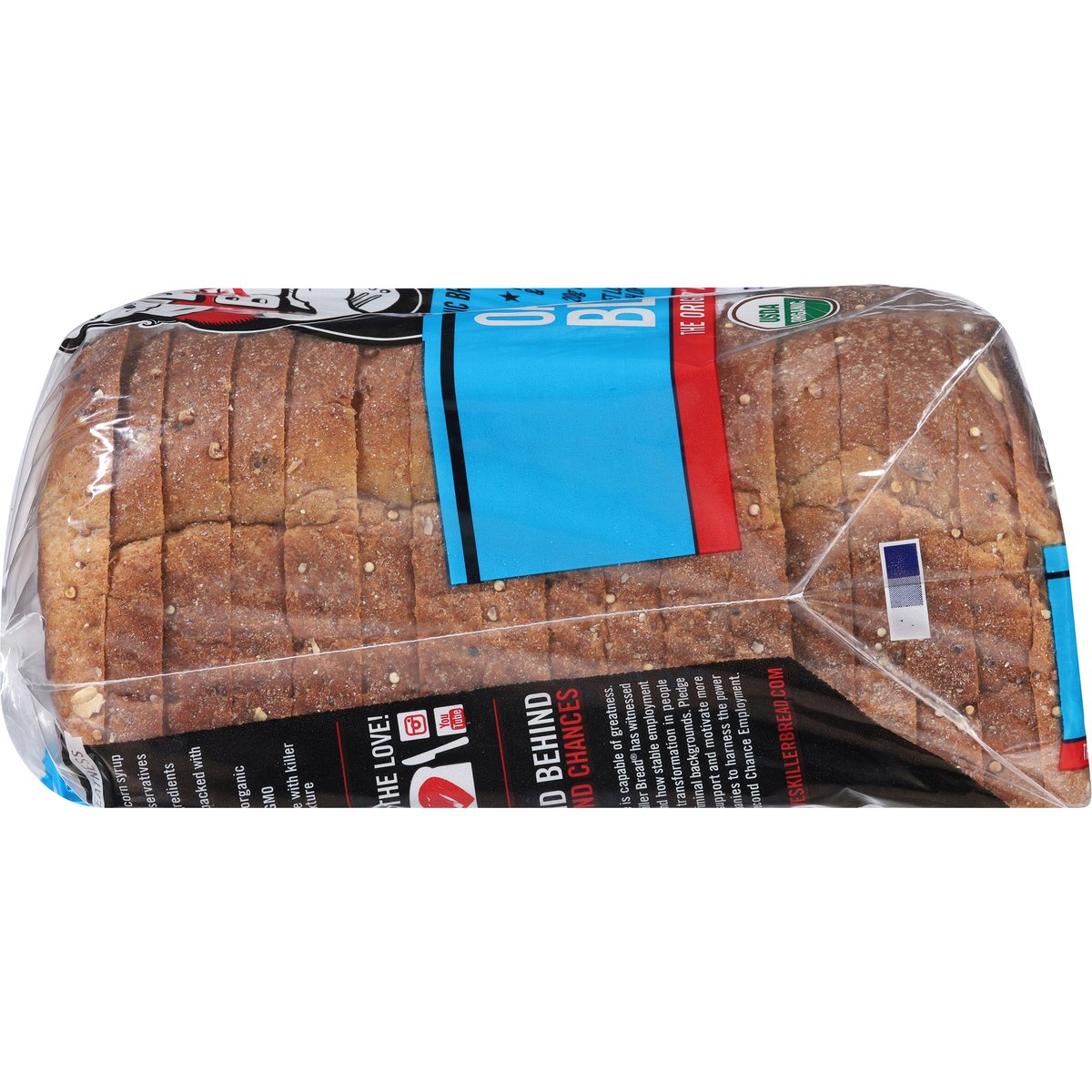 Topped With Oats & Blue Cornmeal. 20 g whole grains. Always USDA Organic; QAI: Quality Assurance International. Certified Organic. Certified Organic by: QAI Inc; Whole Grain: Whole Grain 12g or more per serving. Eat 48g or more of whole grains daily. WholeGrainsCouncil.org. Non-GMO Project verified. nongmoproject.org. Always Non-GMO. Topped with oats & blue cornmeal. Soft loaf with a touch of sweetness. No high fructose corn syrup. No artificial preservatives. No artificial ingredients. Always power-packed with whole grains. Always USDA Organic. Always Non-GMO. Always made with killer taste and texture. 15 years in prison. That's a tough way to find yourself. Dave Dahl realized he was in the wrong game and knew he had more to offer. His brother, Glenn, saw a change in him and gave Dave a second chance by welcoming him back to the family bakery. Dave set out to make a loaf like no other - the most nutritious, organic whole grain bread - and the result is what he called "killer" bread. Dave's Killer Bread is built on the belief that everyone is capable of greatness. What began as one man's journey has turned into so much more. Today, one third of the employees at our Oregon bakery have a criminal background, and we have witnessed first-hand how stable employment sparks personal transformation. Oat & Blues is back for a limited time to celebrate DKB's 20th anniversary! The original Dave's Killer Bread variety, this loaf is topped with oats and blue cornmeal, giving it a slightly sweet flavor and crunchy crust. It's perfect for sandwiches, toast, or straight out of the bag. daveskillerbread.com. daveskillerbread.com/contact. Spread the love! Facebook. Twitter. Instagram. YouTube. Questions or comments? daveskillerbread.com/contact. Learn more at: daveskillerbread.com. Stand behind. Second chances. Everyone is capable of greatness. Dave's Killer Bread has witnessed first-hand how stable employment sparks transformation in people with criminal backgrounds. Pledge your support and motivate more companies to harness the power of Second Chance Employment. Please recycle or reuse this bag.