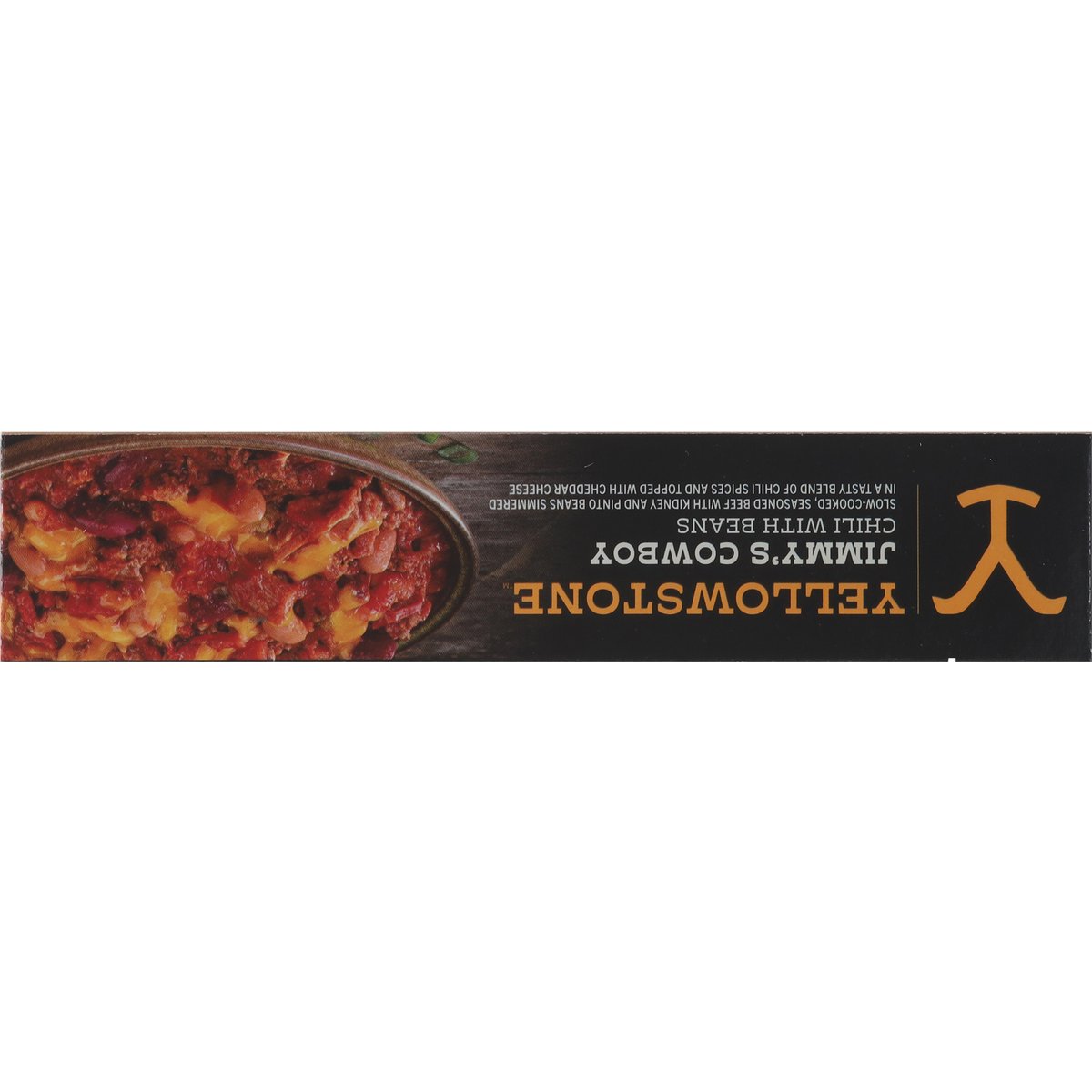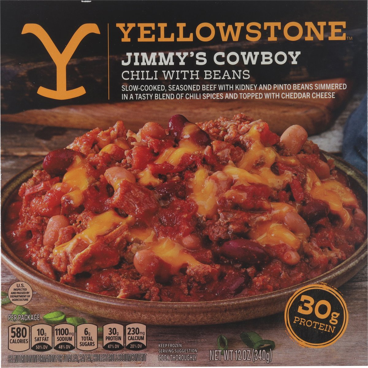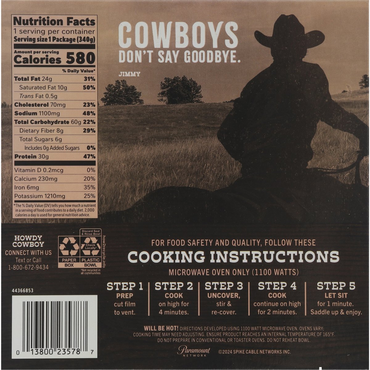 Slow-cooked, seasoned beef with kidney and pinto beans simmered in a tasty blend of chili spices and topped with cheddar cheese. Per Package: 580 calories; 10 g sat fat (50% DV); 1100 mg sodium (48% DV); 6 g total sugars; 30 g protein (47% DV); 230 mg calcium (20% DV). 30 g protein. See nutrition information for total fat, sat fat, cholesterol & sodium content. Contains a bioengineered ingredient. Cowboys don't say goodbye. Jimmy. U.S. inspected and passed by Department of Agriculture. how2recycle.info. Howdy Cowboy Connect with us. Text or call 1-800-672-9434.