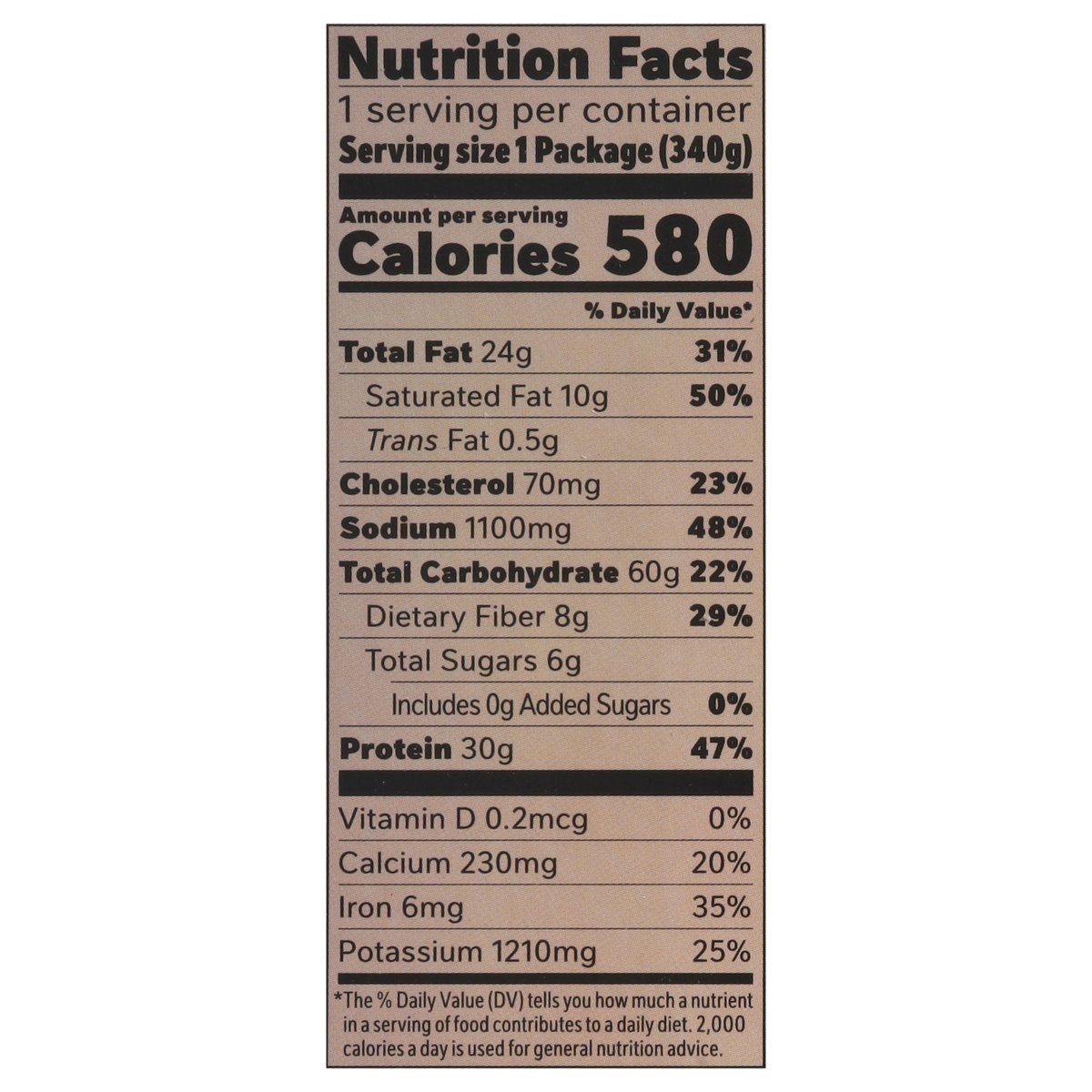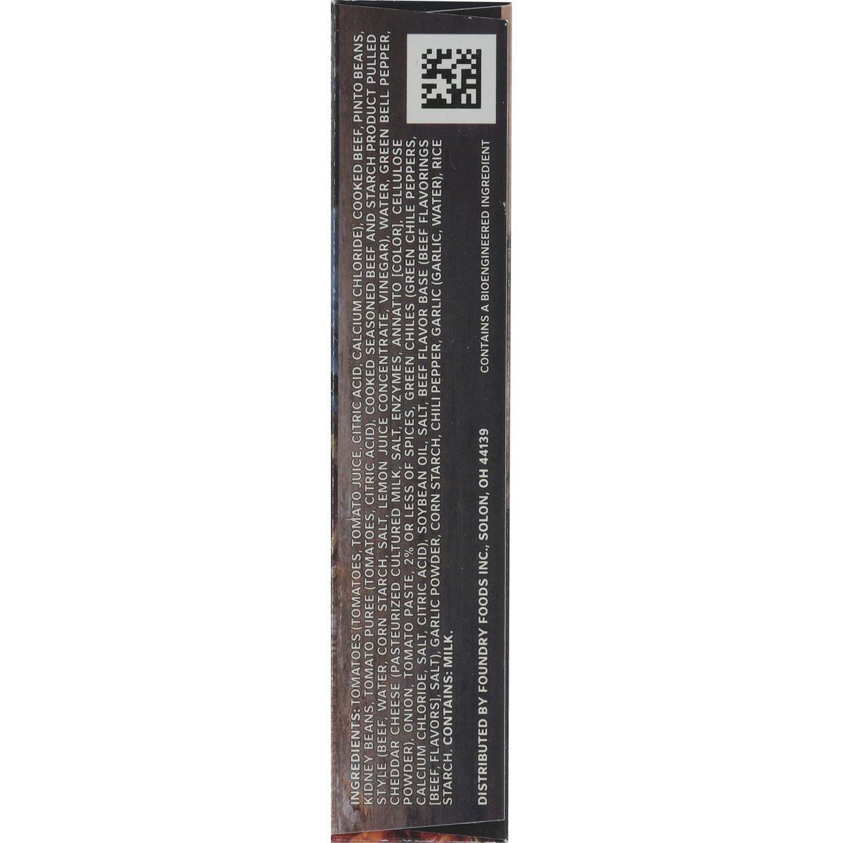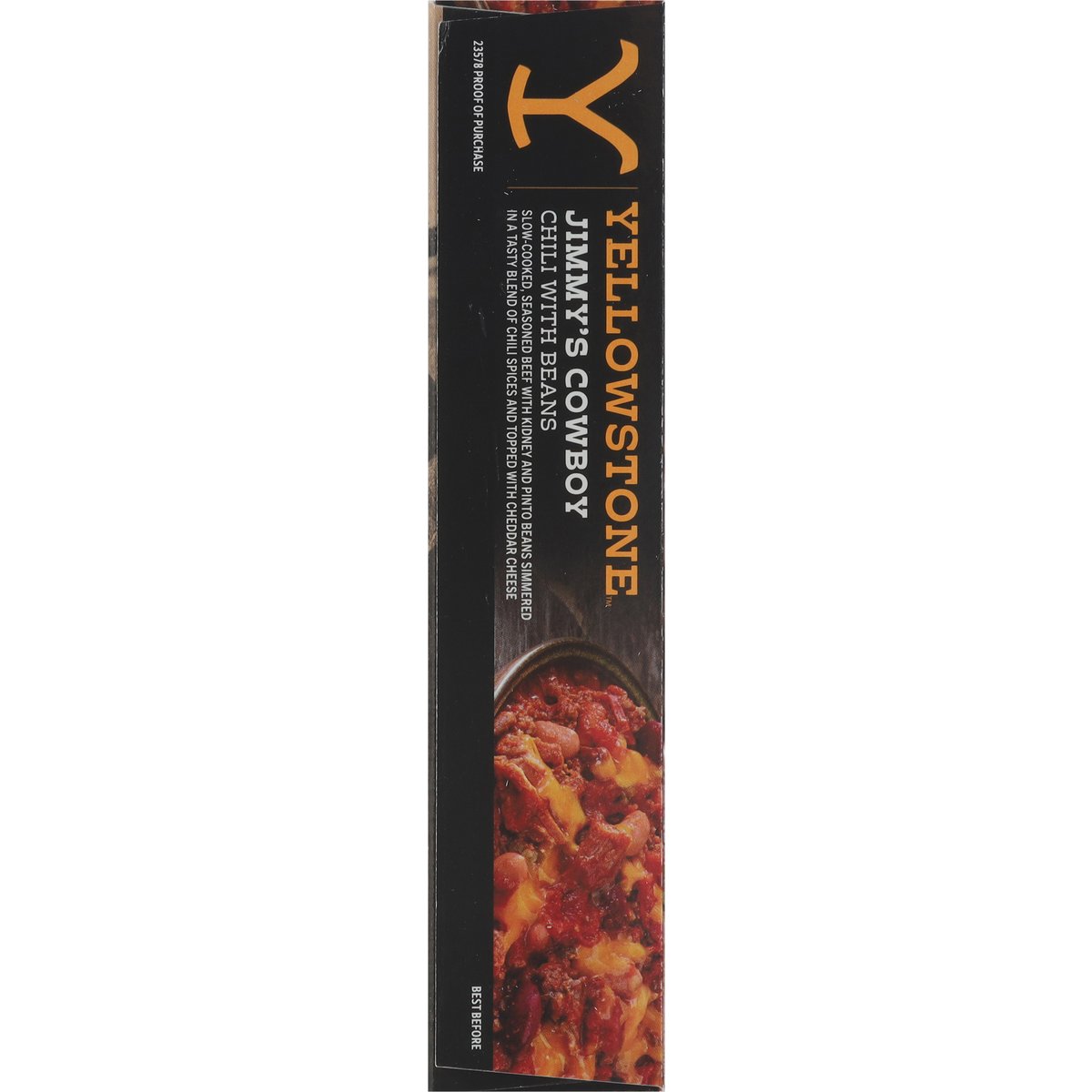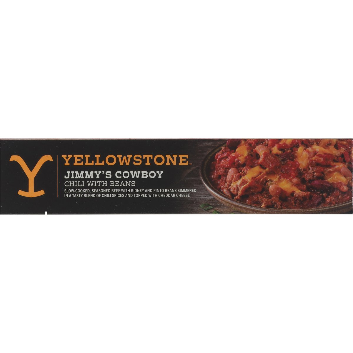 Slow-cooked, seasoned beef with kidney and pinto beans simmered in a tasty blend of chili spices and topped with cheddar cheese. Per Package: 580 calories; 10 g sat fat (50% DV); 1100 mg sodium (48% DV); 6 g total sugars; 30 g protein (47% DV); 230 mg calcium (20% DV). 30 g protein. See nutrition information for total fat, sat fat, cholesterol & sodium content. Contains a bioengineered ingredient. Cowboys don't say goodbye. Jimmy. U.S. inspected and passed by Department of Agriculture. how2recycle.info. Howdy Cowboy Connect with us. Text or call 1-800-672-9434.