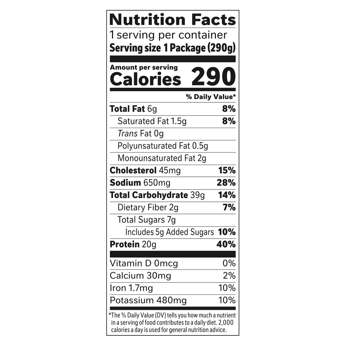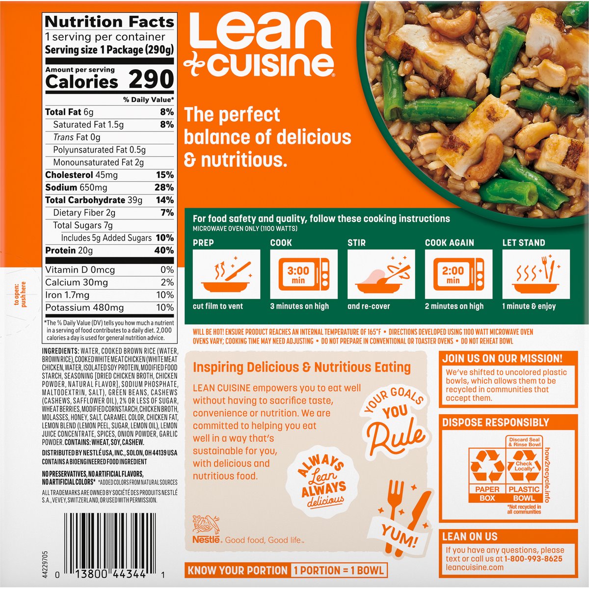 White meat chicken with brown rice, green beans & cashews in a savory sauce. No artificial flavors. 290 Calories. 20 g Protein. 26 g Whole grains. Per Package: 290 calories; 1.5 g sat fat (8% DV); 650 mg sodium (28% DV); 7 g total sugars; 20 g protein (40% DV). Nestle - Good food, good life. Inspiring Delicious & Nutritious Eating: Lean Cuisine empowers you to eat well without having to sacrifice taste, convenience or nutrition. We are committed to helping you eat well in a way that's sustainable for you, with delicious and nutritious food. Always lean, always delicious. Your goals, you rule. Yum! Know Your Portion: 1 portion = 1 bowl. Join Us on Our Mission! We’ve shifted to uncolored plastic trays, which allows them to be recycled in communities that accept them. Lean On Us: If you have any questions, please text or call us at 1-800-993-8625. See nutrition information for sodium content. The perfect balance of delicious & nutritious. No preservatives. No artificial colors (Added colors from natural sources). High protein. High satisfaction. A high protein meal has at least 20% of the daily value of protein you need daily. Inspected for wholesomeness by U.S. Department of Agriculture. how2recycle.info. leancuisine.com.