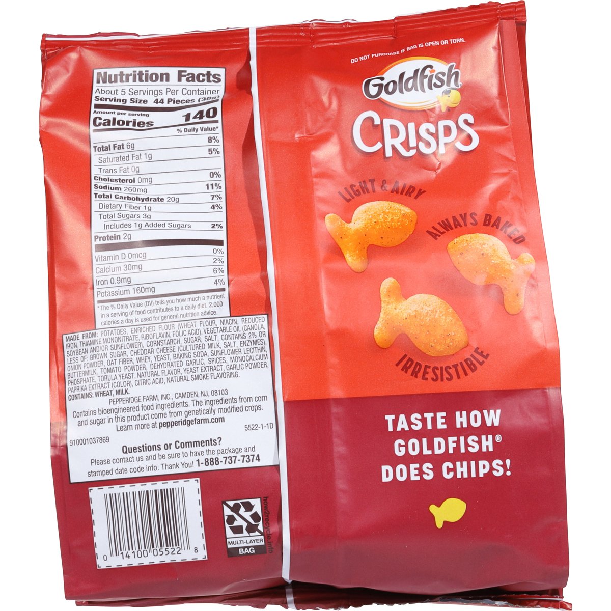 Contains bioengineered food ingredients. The ingredients from corn and sugar in this product come from genetically modified crops. Learn more at pepperidgefarm.com. New. Light & airy. Always baked. Irresistible. Taste how Goldfish does chips! pepperidgefarm.com. how2recycle.info. Questions or Comments? Please contact us and be sure to have the package and stamped date code info. Thank You! 1-888-737-7374. Learn more at pepperidgefarm.com.