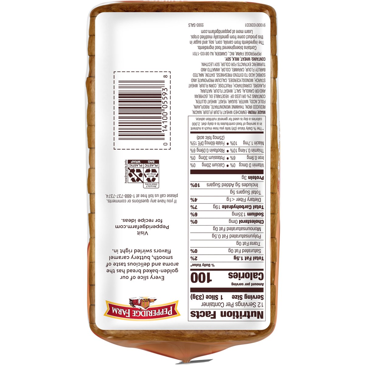 Flavor with other natural flavors. Contains bioengineered food ingredients. The ingredients from canola, corn, soy, and sugar in this product come from genetically modified crops. Learn more at pepperidgefarm.com. No high fructose corn syrup. Every slice of our golden-bake bread has the aroma and delicious taste of smooth, buttery caramel flavors swirled right in. pepperidgefarm.com. how2recycle.info. Visit pepperidgefarms.com for recipe ideas. If you have any questions or comments, please call us toll free at 1-888-737-7374. Double wrapped for freshness.