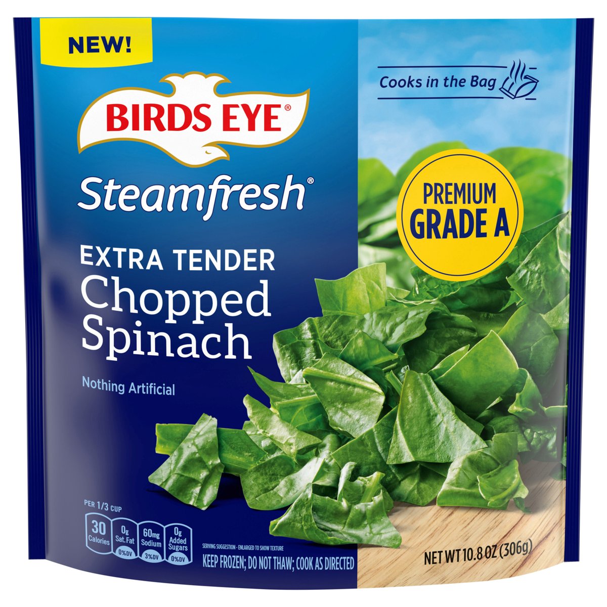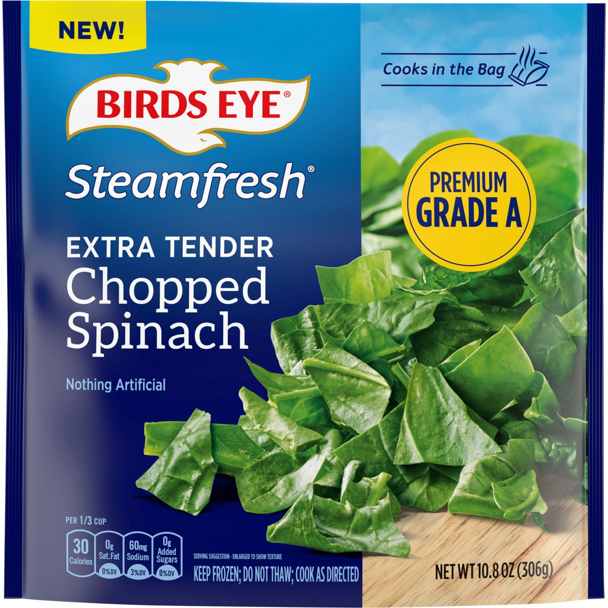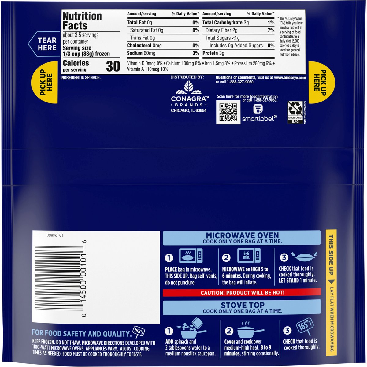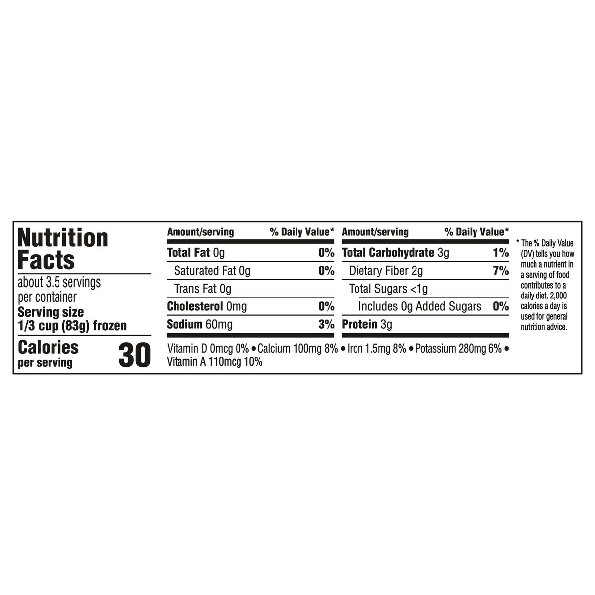 Per 1/3 Cup: 30 calories; 0 g sat fat (0% DV); 60 mg sodium (3% DV); 0 g added sugars (0% DV). New! Cooks in the bag. Nothing artificial. Premium grade A. www.birdseye.com. how2recycle.info. SmartLabel: Scan for more food information or call 1-888-327-9060. Questions or comments, visit us at www.birdseye.com or call 1-888-327-9060.