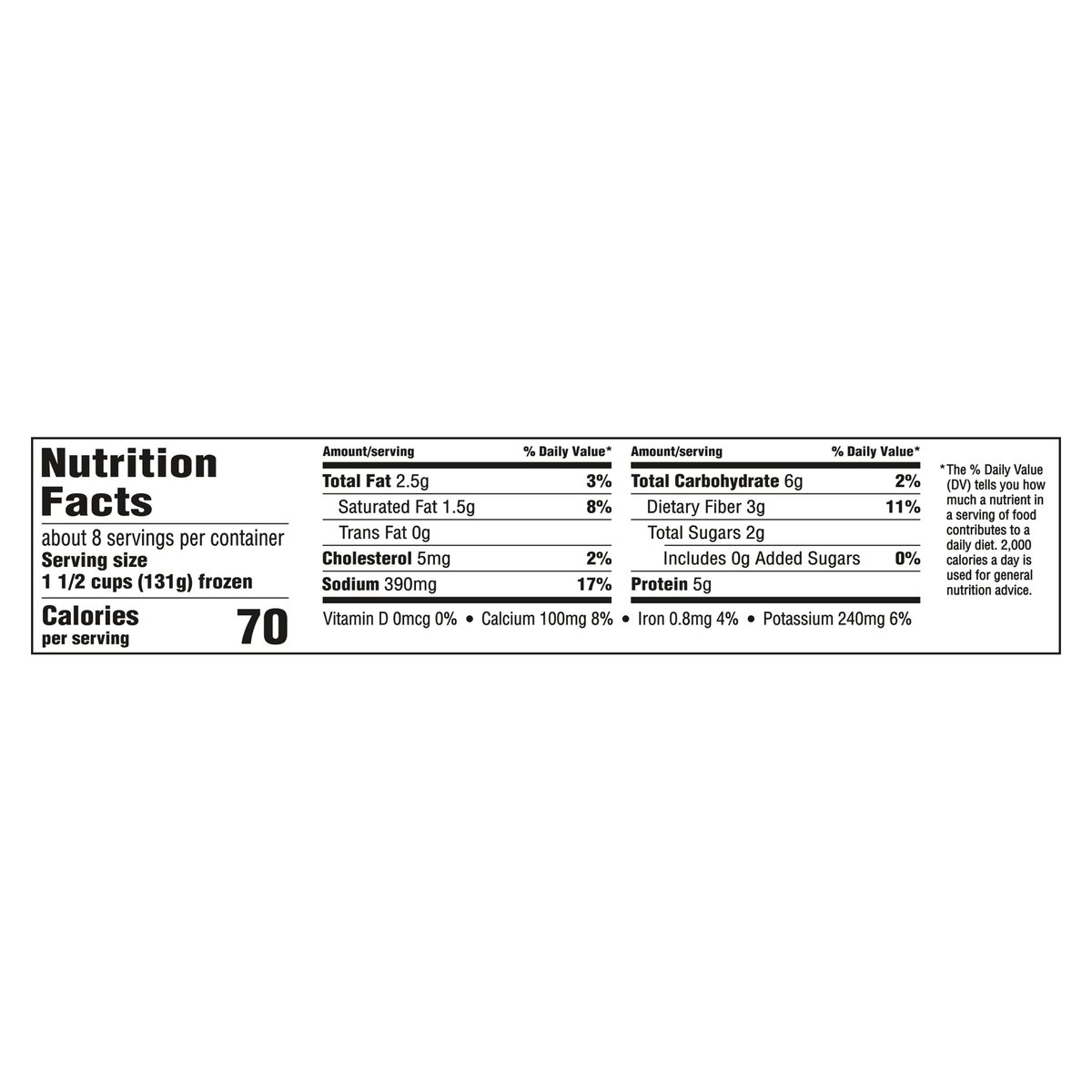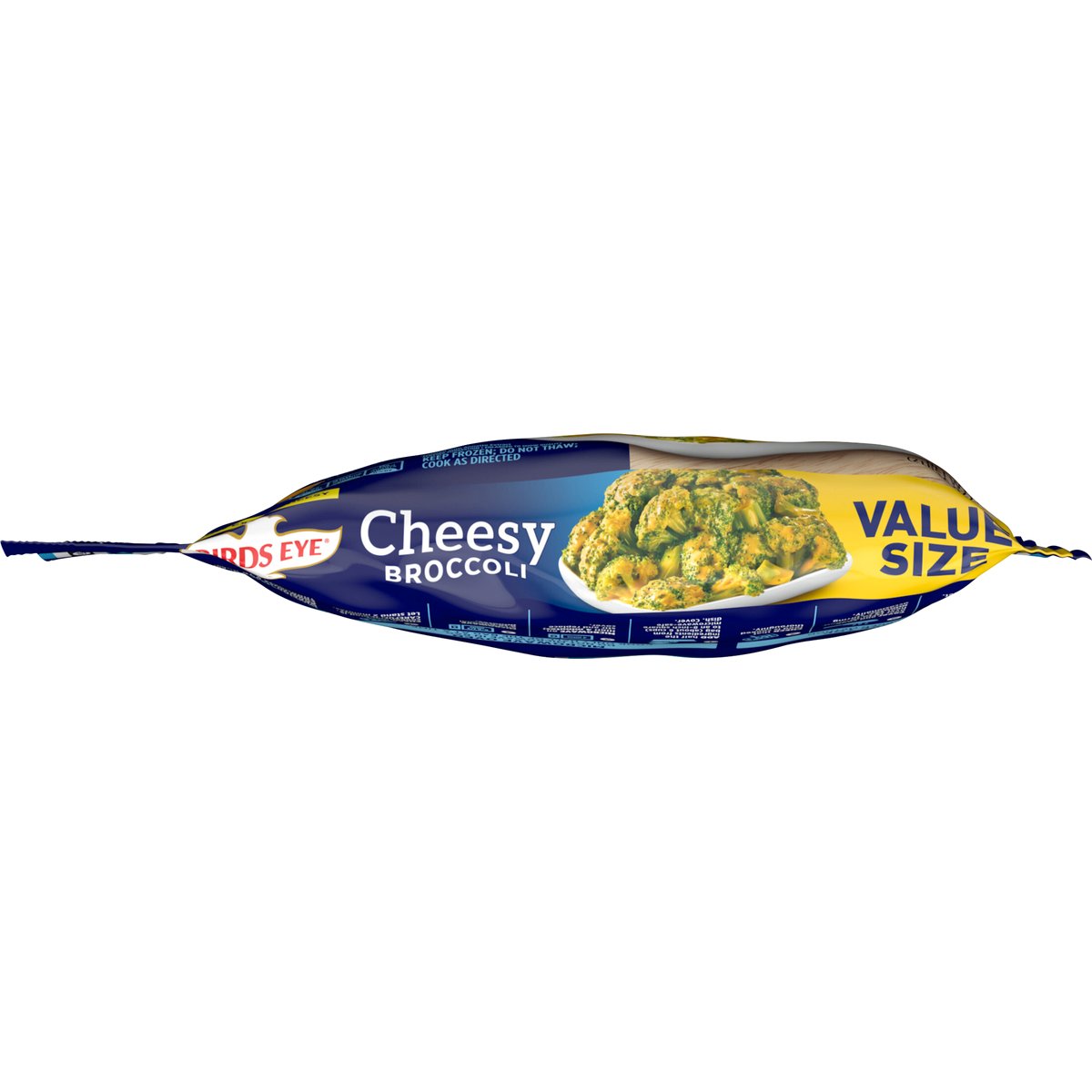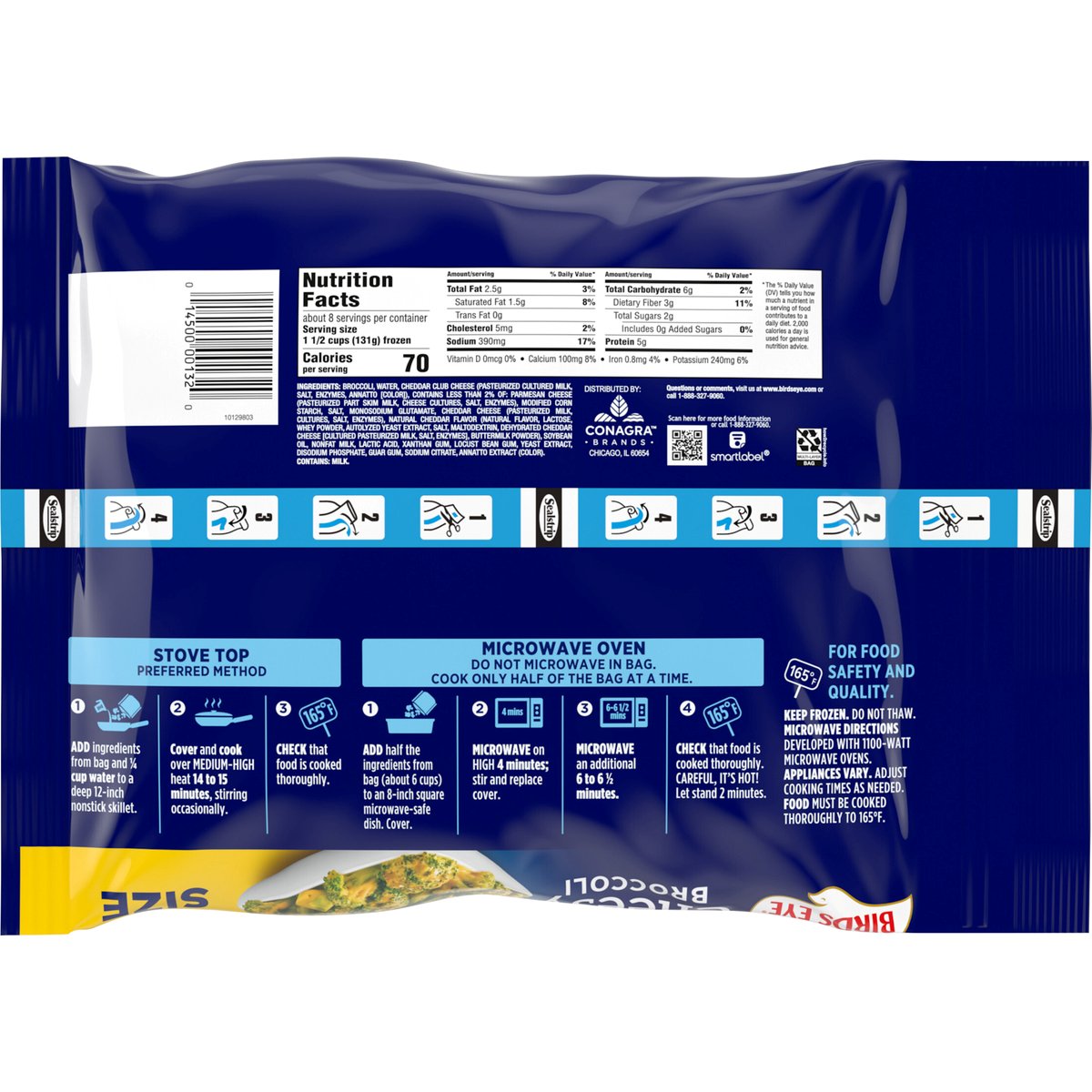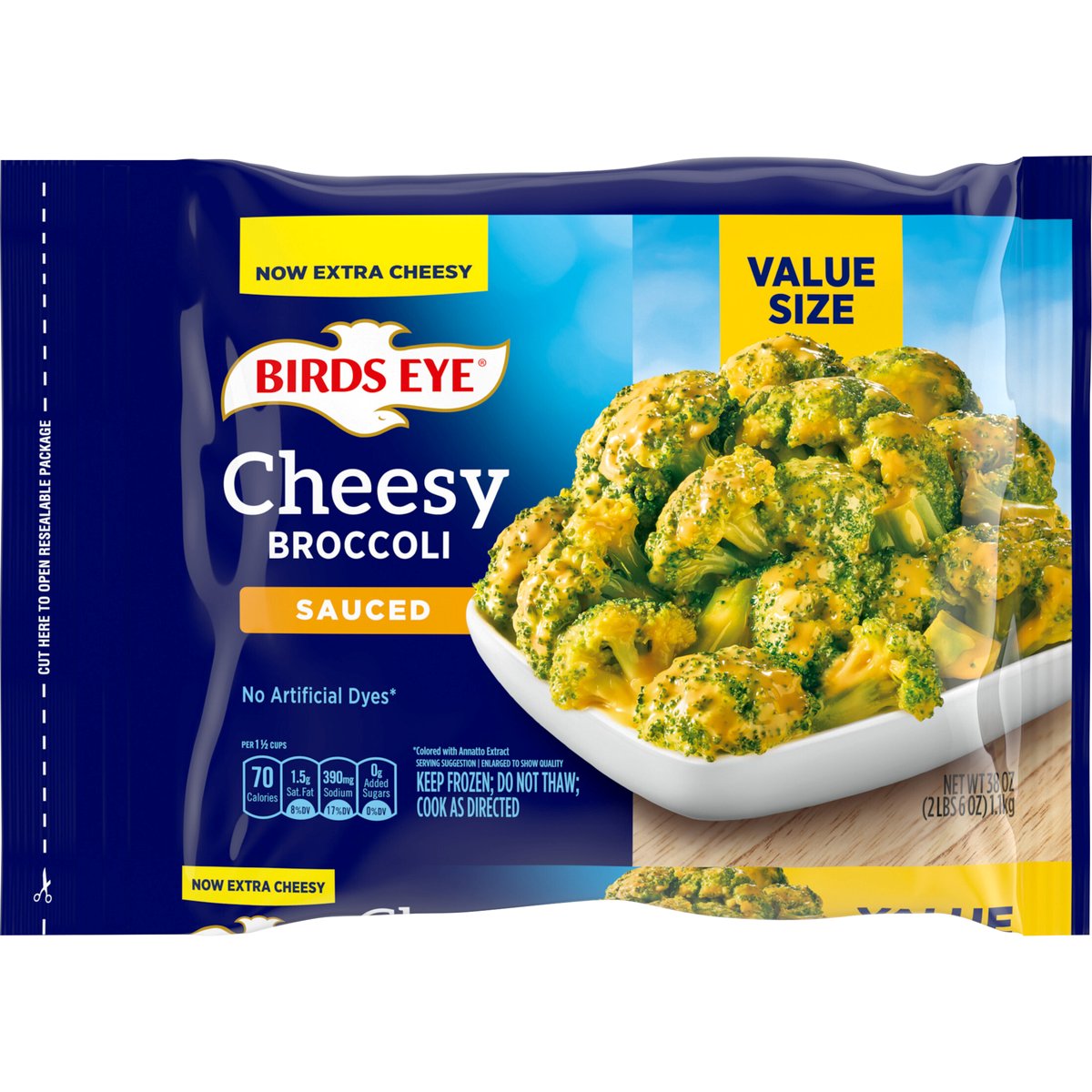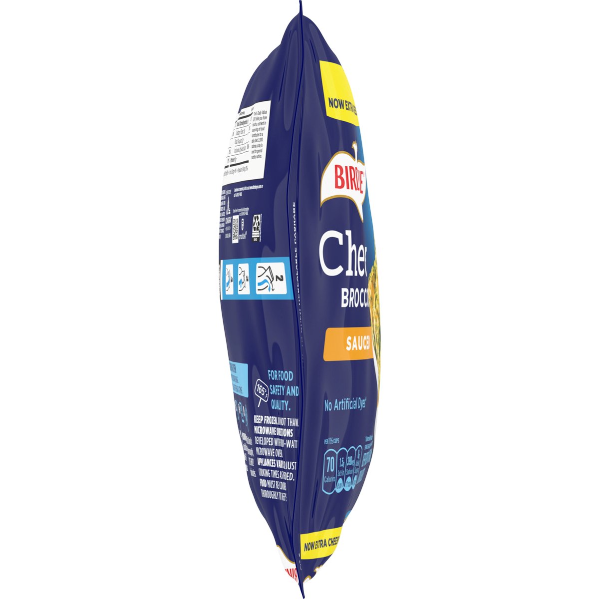 Per 1 1/2 Cups: 70 calories; 1.5 g sat. fat (8% DV); 390 mg sodium (17% DV); 0 g added sugars (0% DV). Now extra cheesy. No artificial dyes*. * Colored with annatto extract. www.birdseye.com. how2recycle.info. SmartLabel: Scan for more food information or call 1-888-327-9060. Questions or comments, visit us at www.birdseye.com or call 1-888-327-9060. Resealable package.
