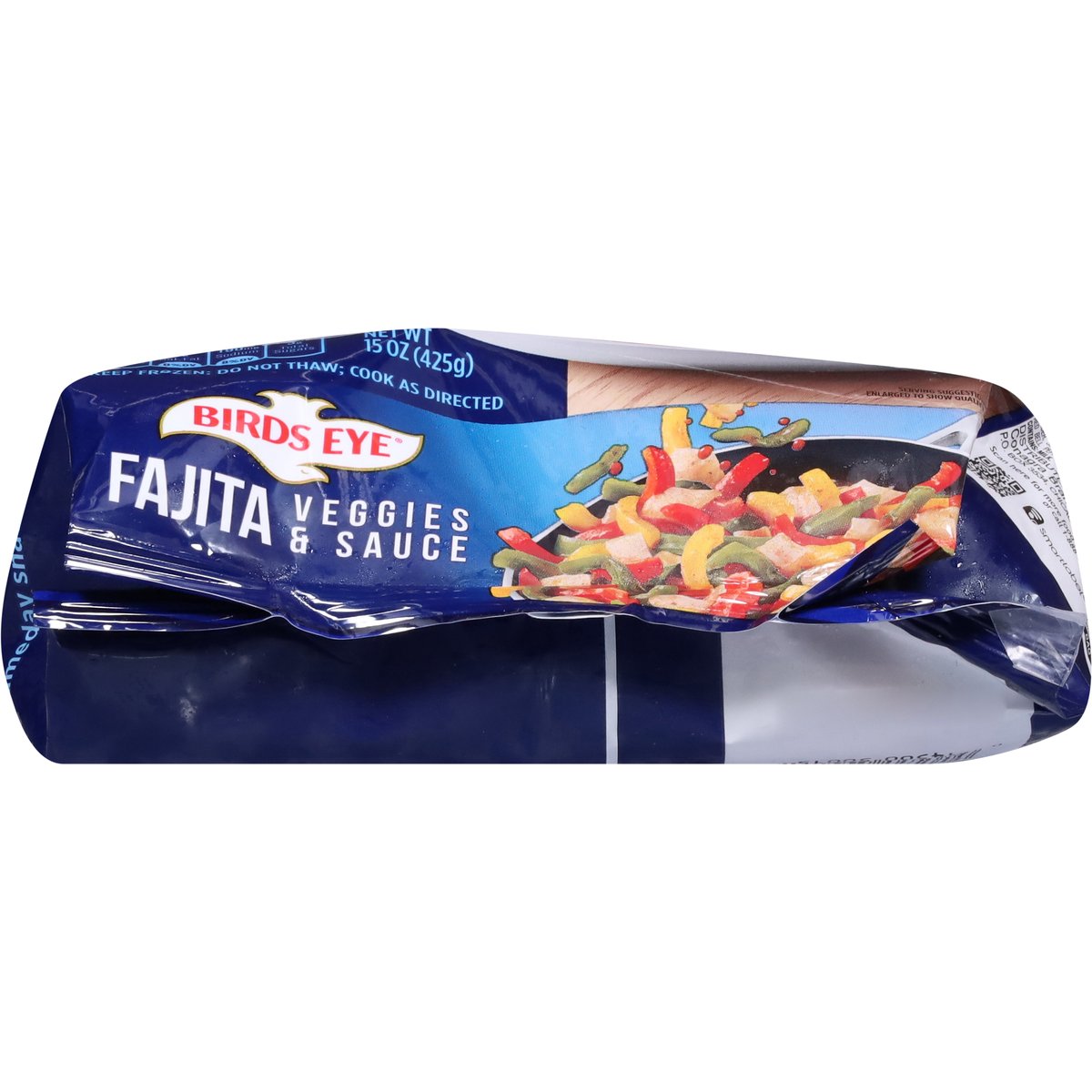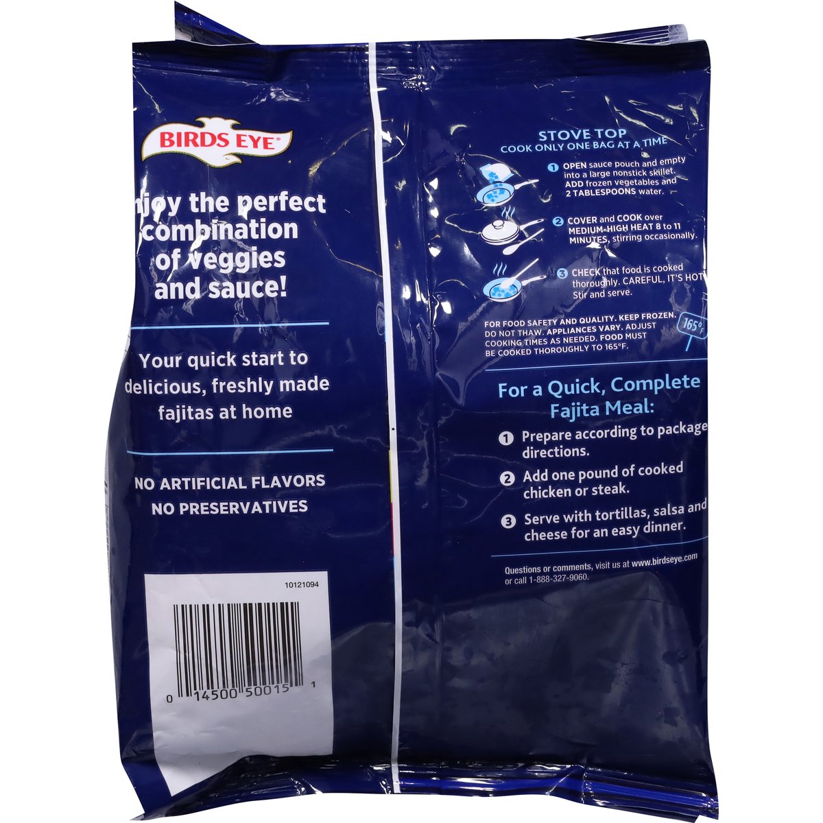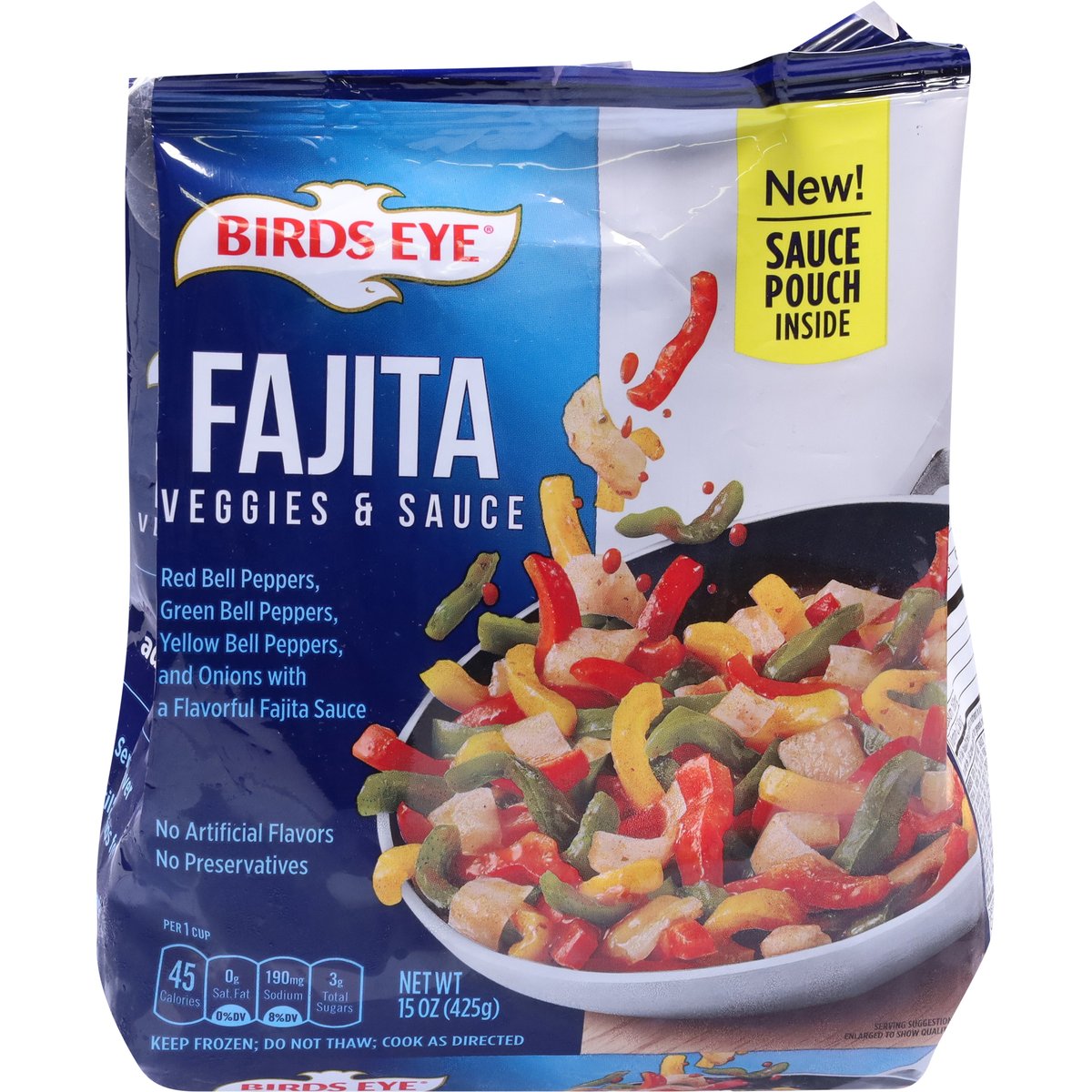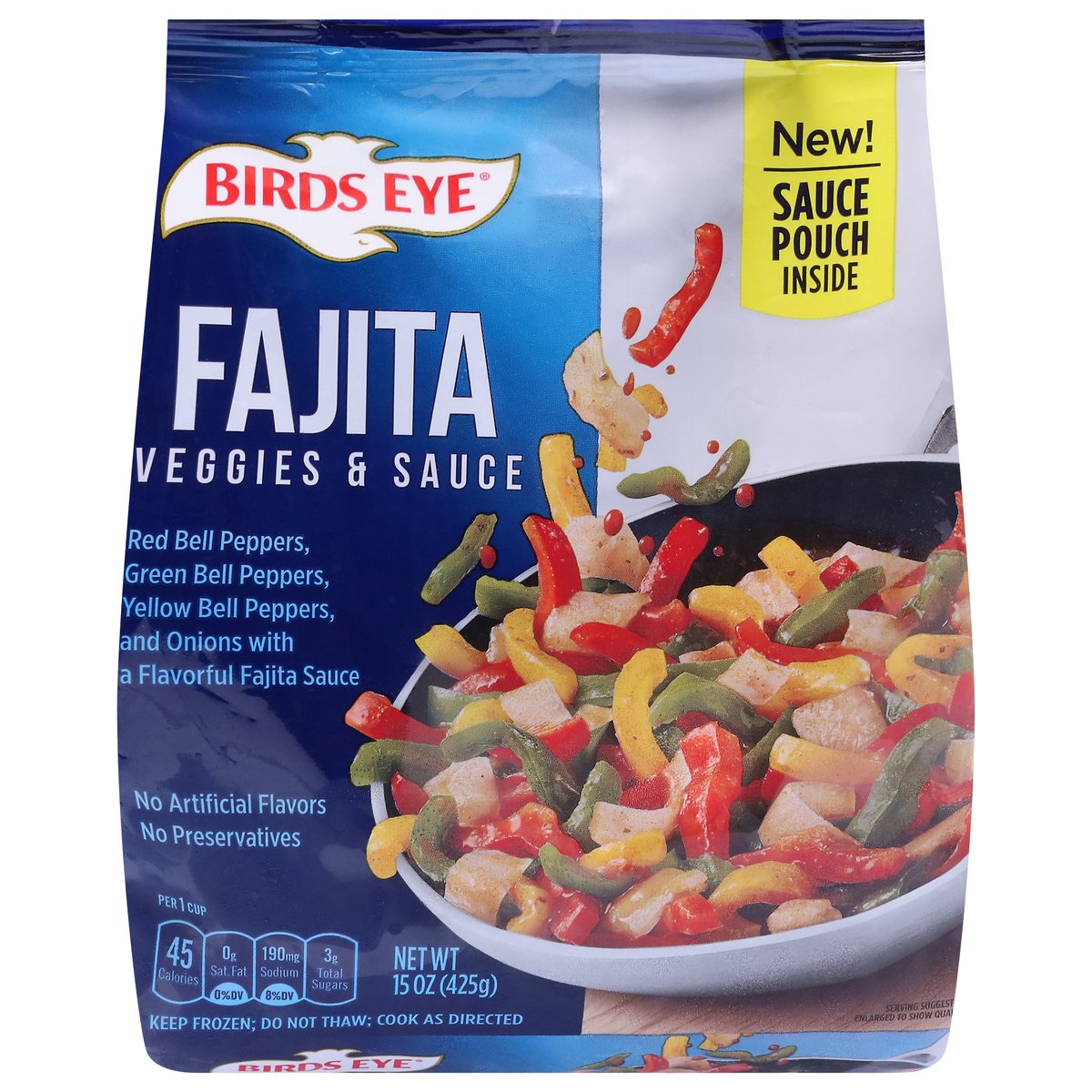 Red bell peppers, green bell peppers, yellow bell peppers, and onions with a flavorful fajita sauce. No artificial flavors. Per 1 Cup: 45 calories; 0 g sat fat (0% DV); 190 mg sodium (8% DV); 3 g total sugars. New! Sauce pouch inside. Enjoy the perfect combination of veggies and sauce! Your quick sauce to delicious, freshly made fajitas at home. www.birdseye.com. how2recycle.info. SmartLabel: Scan for more food information or call 1-888-327-9060. Questions or comments, visit us at www.birdseye.com or call 1-888-327-9060.