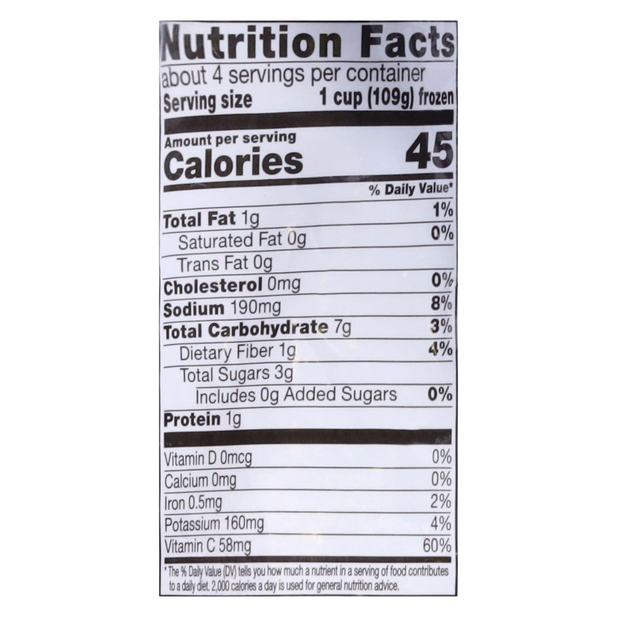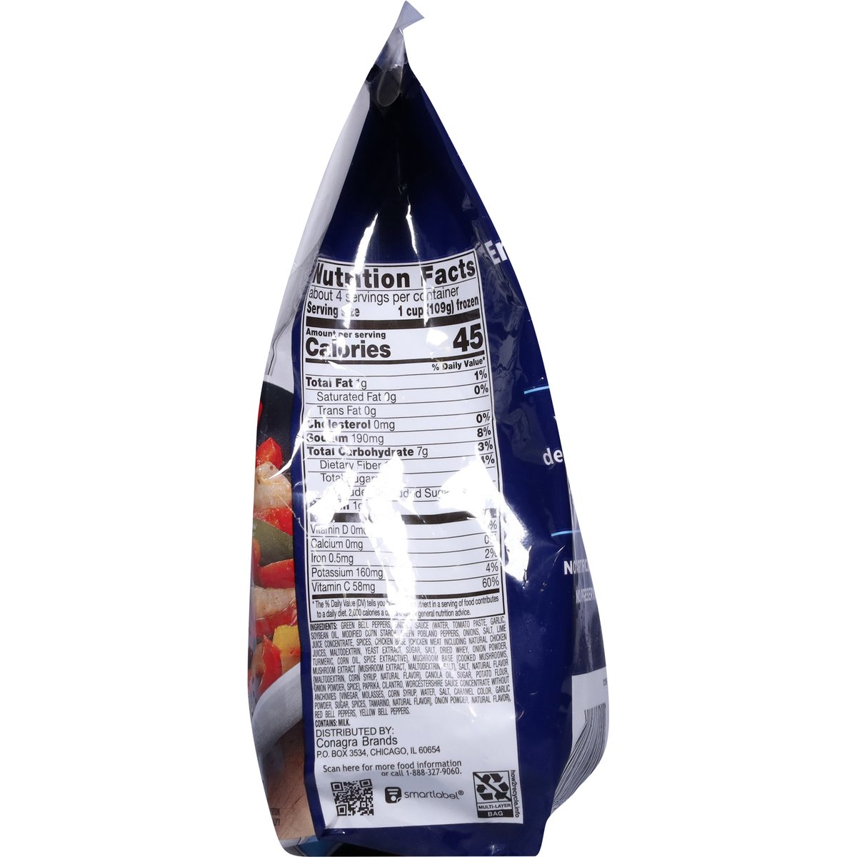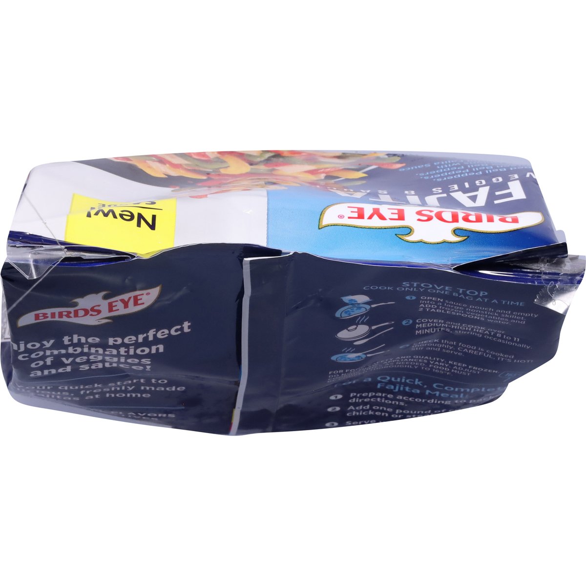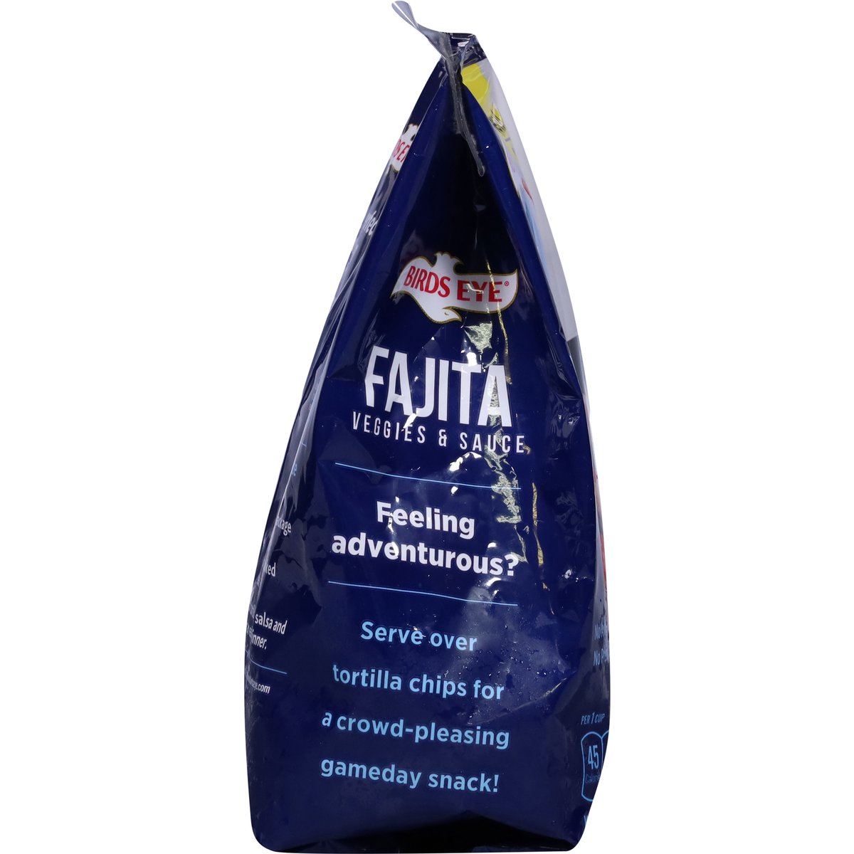 Red bell peppers, green bell peppers, yellow bell peppers, and onions with a flavorful fajita sauce. No artificial flavors. Per 1 Cup: 45 calories; 0 g sat fat (0% DV); 190 mg sodium (8% DV); 3 g total sugars. New! Sauce pouch inside. Enjoy the perfect combination of veggies and sauce! Your quick sauce to delicious, freshly made fajitas at home. www.birdseye.com. how2recycle.info. SmartLabel: Scan for more food information or call 1-888-327-9060. Questions or comments, visit us at www.birdseye.com or call 1-888-327-9060.