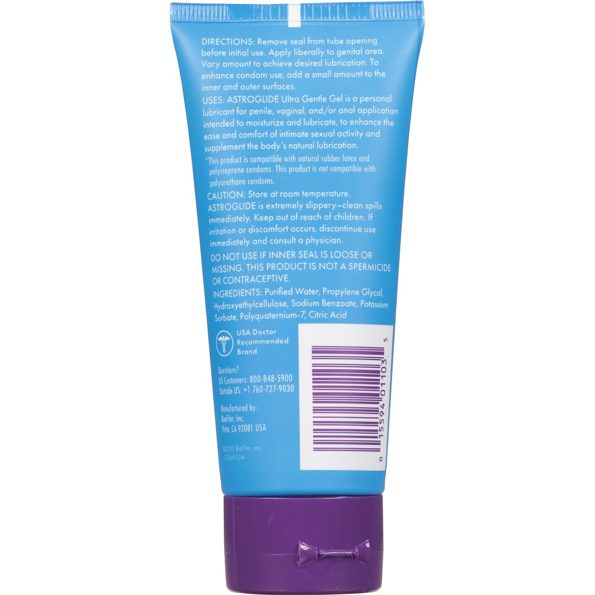 Slip into pleasure. Water-based. Not made with glycerin or parabens. Condom compatible (This product is compatible with natural rubber latex and polyisoprene condoms, This product is not compatible with polyurethane condoms). Hypoallergenic. No drip. Uses: Astroglide ultra gentle gel is a personal lubricant for penile, vaginal, and/or anal application intended to moisturize and lubricate, to enhance the ease and comfort of intimate sexual activity and supplement the body's natural lubrication. USA doctor recommended brand. 100% satisfaction guarantee. www.astroglide.com. Questions? US Customers: 800-848-5900. Outside US: +1 760-727-9030.