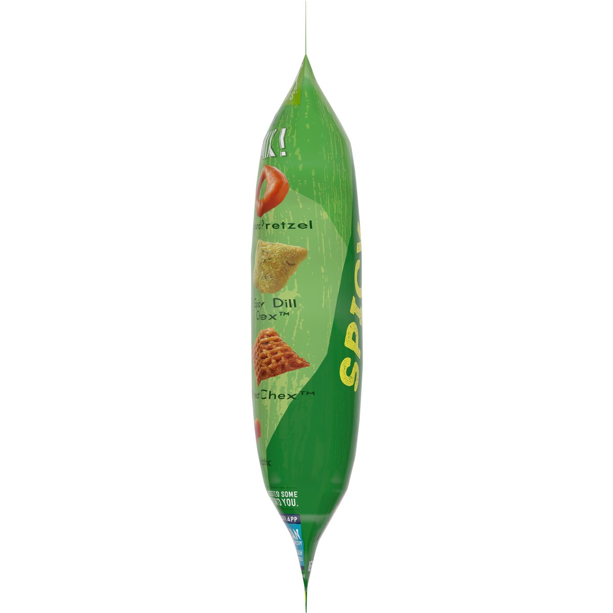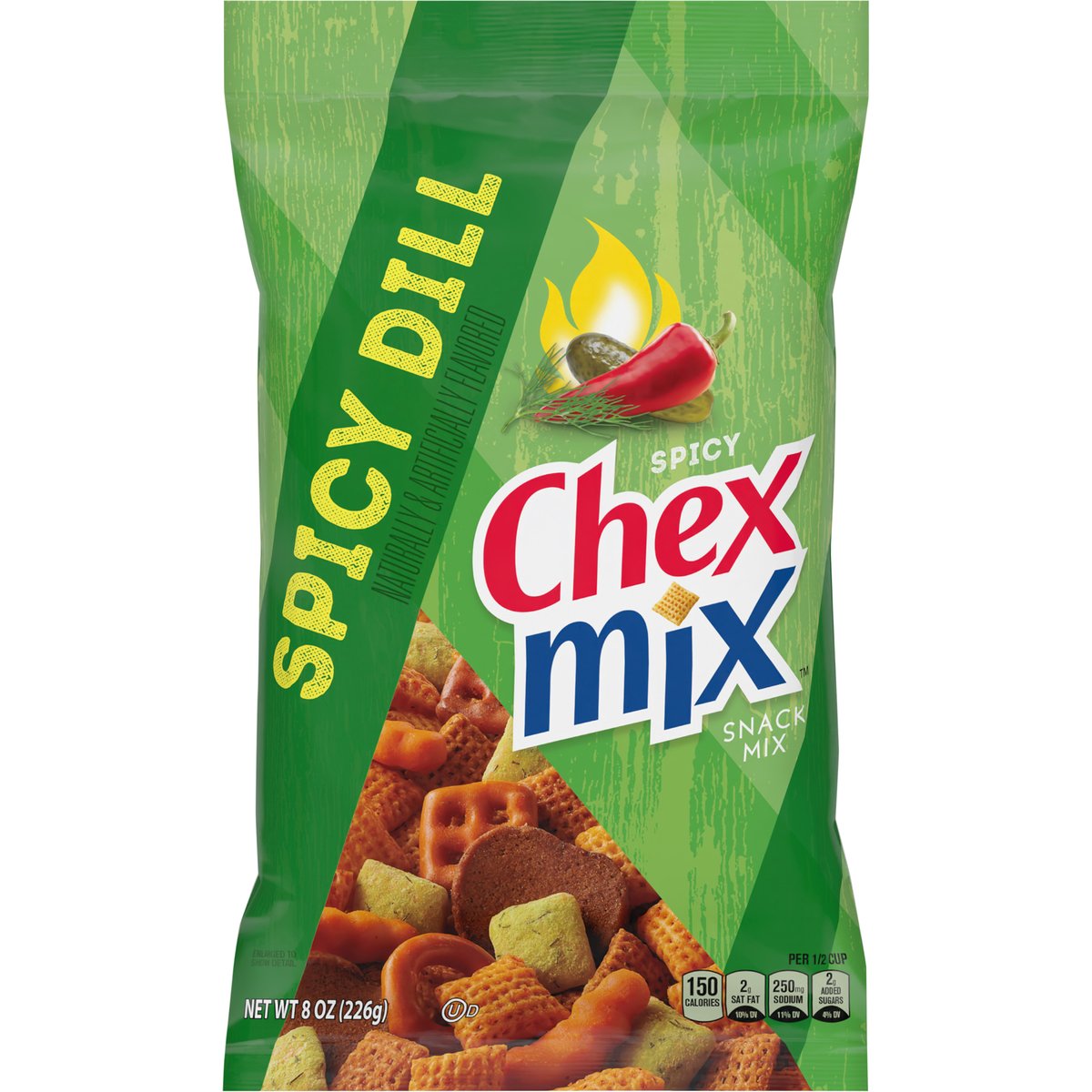 Naturally & artificially flavored. Per 1/2 Cup: 150 calories; 2 g sat fat (10% DV); 250 mg sodium (11% DV); 2 g added sugars (4% DV). 50% less fat than regular potato chips*. * Chex Mix Spicy Dill (5 g fat per 34 g serving) has 50% less fat than regular potato chips (11 g per 34 g serving). Contains bioengineered food ingredients. Learn more at Ask.GeneralMills.com. Just the right mix! Corn Chex. Round Pretzel. Rye Chip. Square Pretzel. Wheat Chex. Spicy Dill Chex. Squiggle Breadstick. Mix it up! May have settled some on its way to you. Facebook. Instagram. Twitter. 1-800-231-0308. Box Tops for Education: Download the app. Scan your receipt. Earn cash for schools.