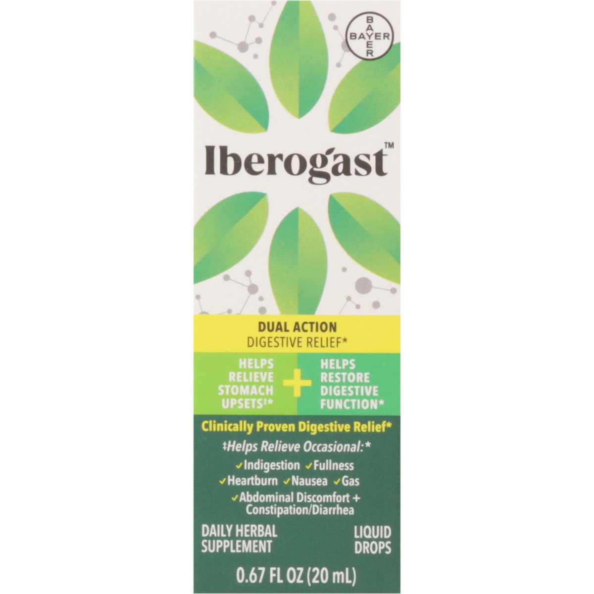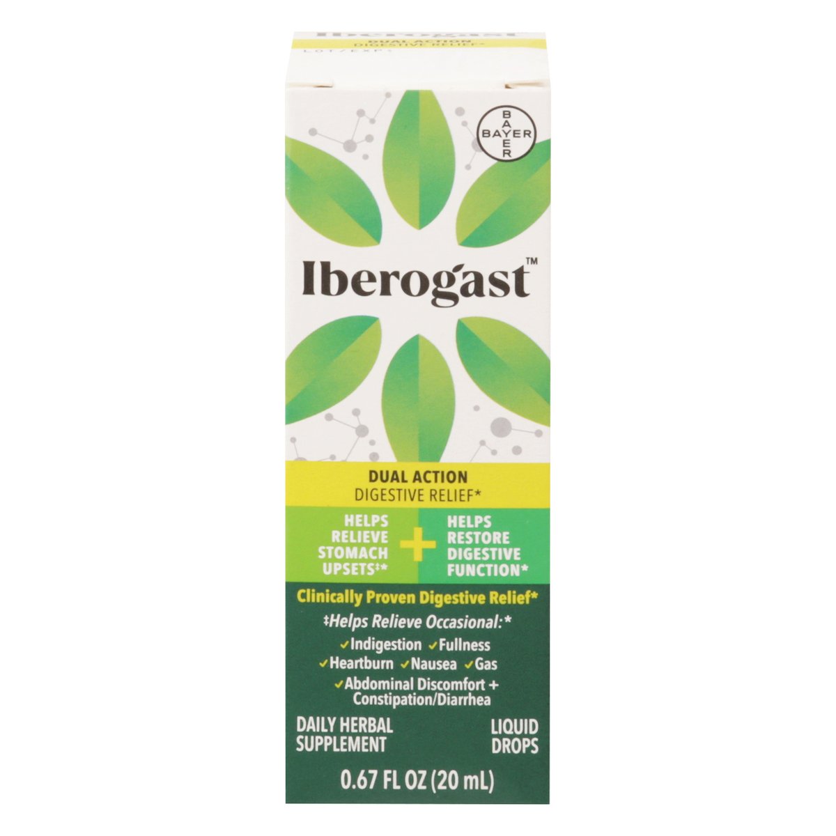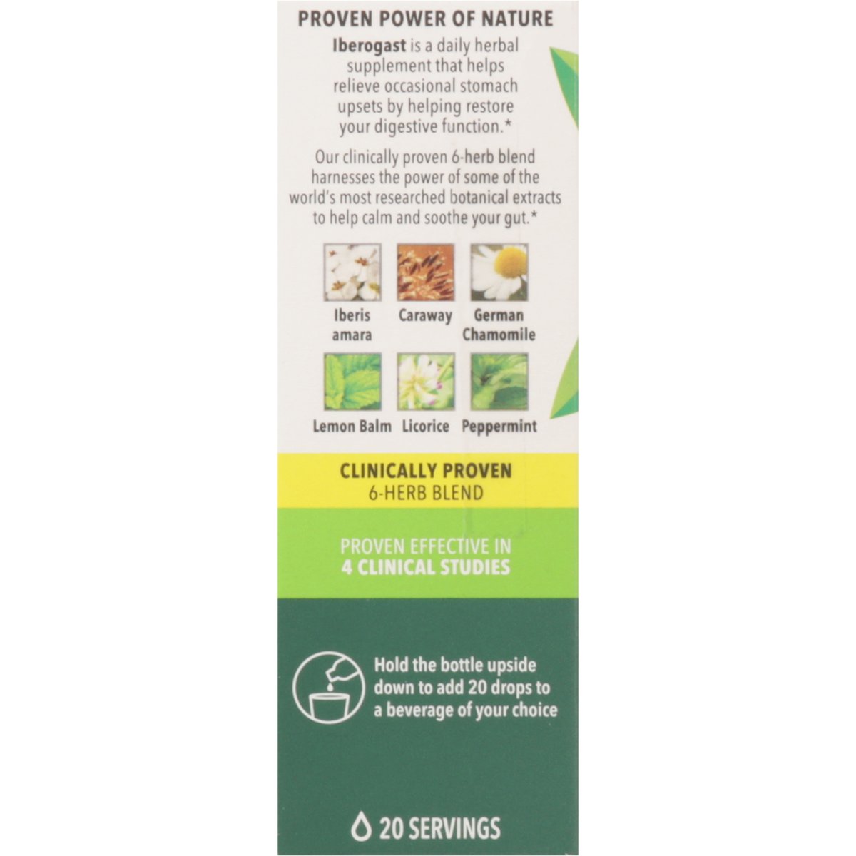 Daily Herbal Supplement. Dual action. Digestive relief. Helps relieve stomach upsets (Helps relieve occasional) + helps restore digestive function. Clinically proven digestive relief. Indigestion. Fullness. Heartburn. Nausea. Gas. Abdominal discomfort + constipation/diarrhea. Proven power of nature. Iberogast is a daily herbal supplement that helps relieve occasional stomach upsets by helping restore your digestive function. Our clinically proven 6-herb blend harnesses the power of some of the world's most researched botanical extracts to help calm and soothe your gut. Iberis amara. Caraway German. Chamomile. Lemon balm. Licorice. Peppermint. Clinically proven 6-herb blend. Proven effective in 4 clinical studies. 20 servings. how2recycle.info. Questions or comments? Call 1-800-800-4793 (Monday - Friday 8AM - 8PM EST). (These statement has not been evaluated by the Food and Drug Administration. This product is not intended to diagnose, treat, cure, or prevent any disease.) Product of Germany.