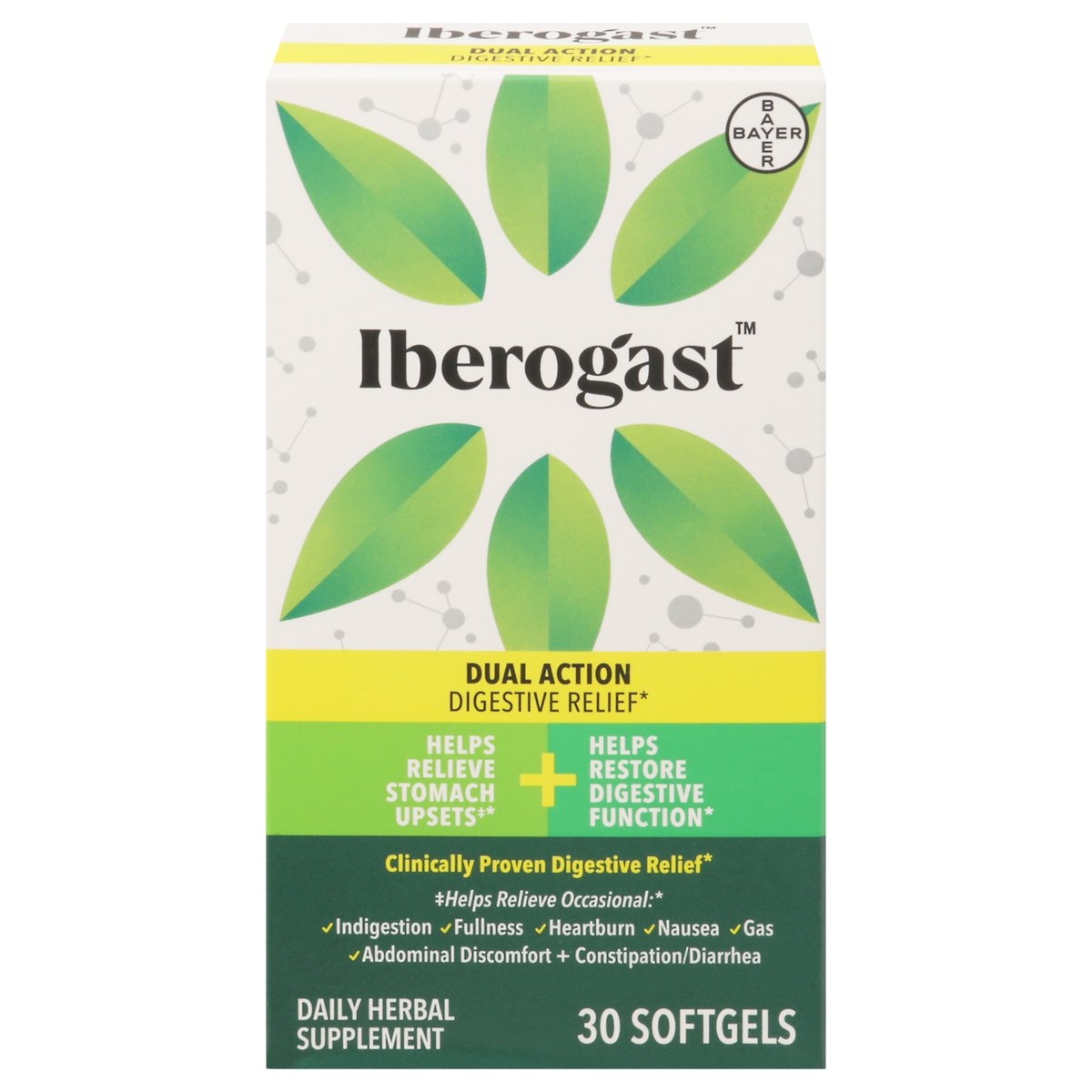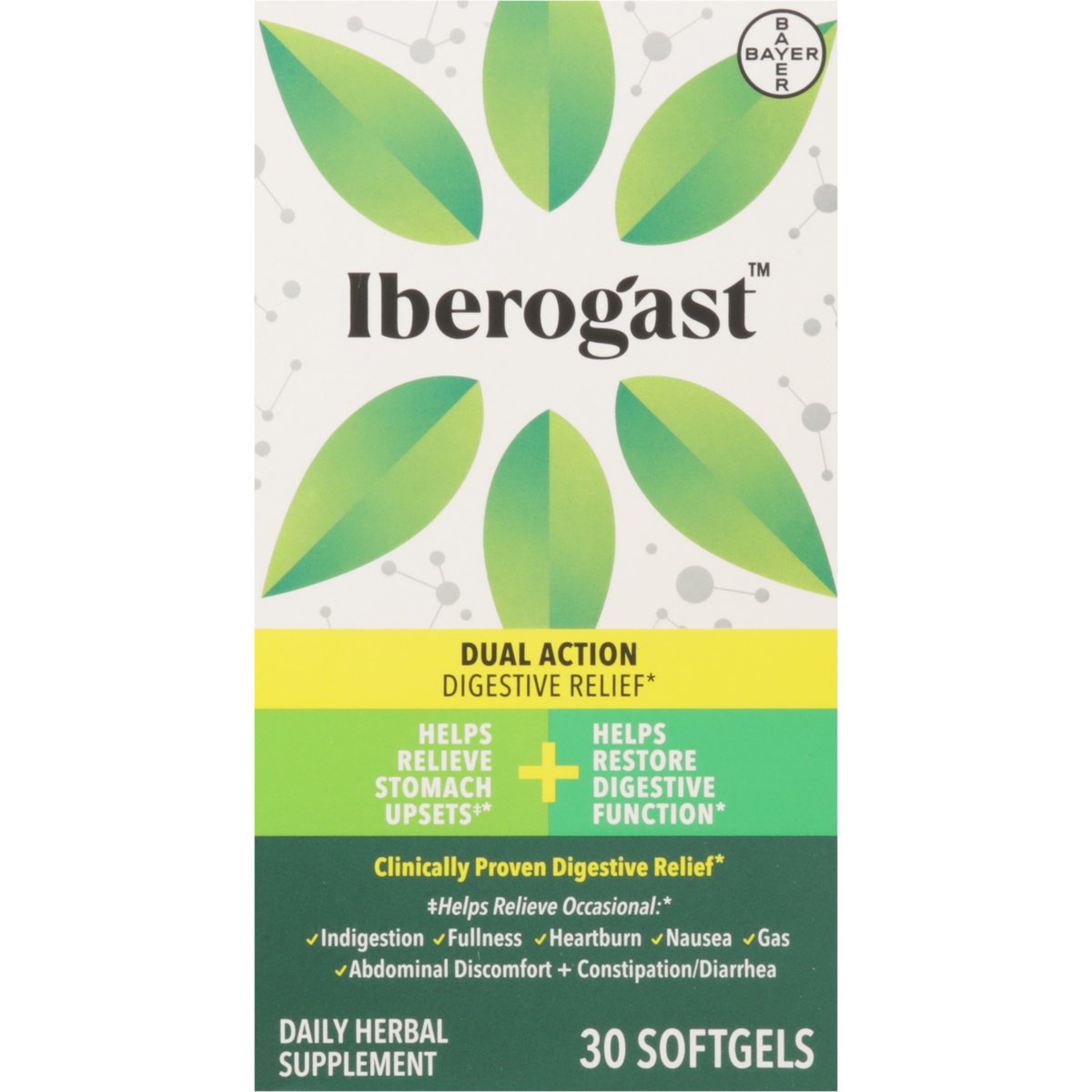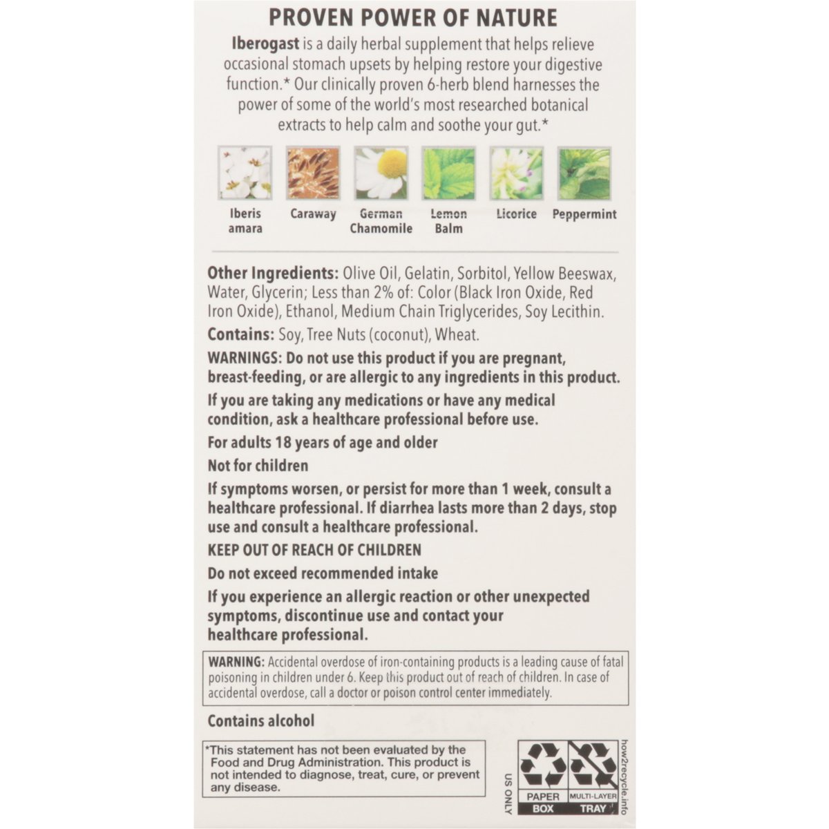 Daily Herbal Supplement. Dual action. Digestive relief. Helps relieve stomach upsets (Helps Relieve Occasional: indigestion; fullness; heartburn; nausea; gas; abdominal discomfort + constipation/diarrhea) + Helps restore digestive function. Clinically proven digestive relief. Proven Power of Nature: Iberogast is a daily herbal supplement that helps relieve occasional stomach upsets by helping restore your digestive function. Our clinically proven 6-herb blend harnesses the power of some of the world's most researched botanical extracts to help calm and soothe your gut. Iberis amara. Caraway. German chamomile. Lemon balm. Licorice. Peppermint. Clinically proven 6-herb blend. Proven effective in 4 clinical studies. how2recycle.info. Questions or comments? Call 1-800-800-4793 (Monday - Friday 8AM - 8PM EST). (This statement has not been evaluated by the Food and Drug Administration. This product is not intended to diagnose, treat, cure, or prevent any disease.) Product of Germany.