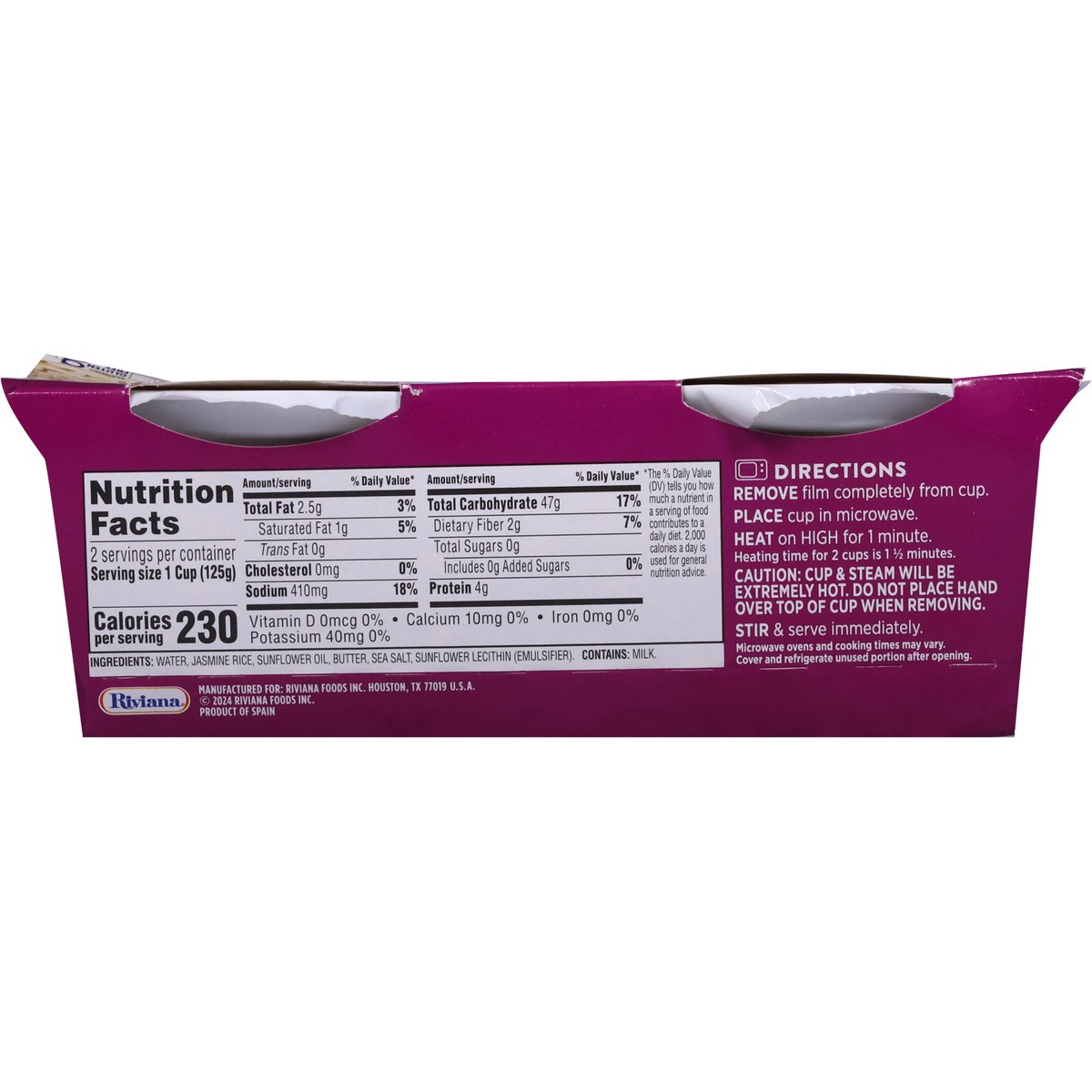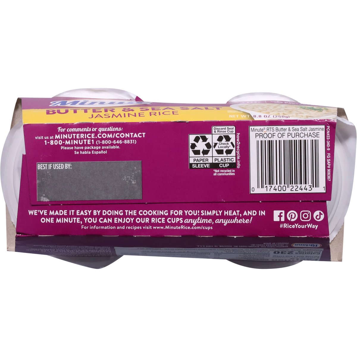 Gluten free. Ready in 1 minute. No preservatives. We've made it easy by doing the cooking for you! Simply heat, and in one minute, you can enjoy our rice cups anytime, anywhere! Our Guarantee: If you are not completely satisfied with this Minute product, we'll refund the full purchase price. Limit one refund per household. Just send proof of purchase seal and best if used by box with your specific reason for the refund to: Minute Consumer Relations P.O. Box 2636 Houston, TX 77252. minuteruce.com/cups. how2recycle.info. Facebook. Twitter. Pinterest. Instagram. (hashtag)RiceYourWay. Minuterice.com/cups. 1-800-Minute1 (1-800-646-8831). Please have package available. For information and recipes visit www.MinuteRice.com/cups. BPA free. Product of Spain.