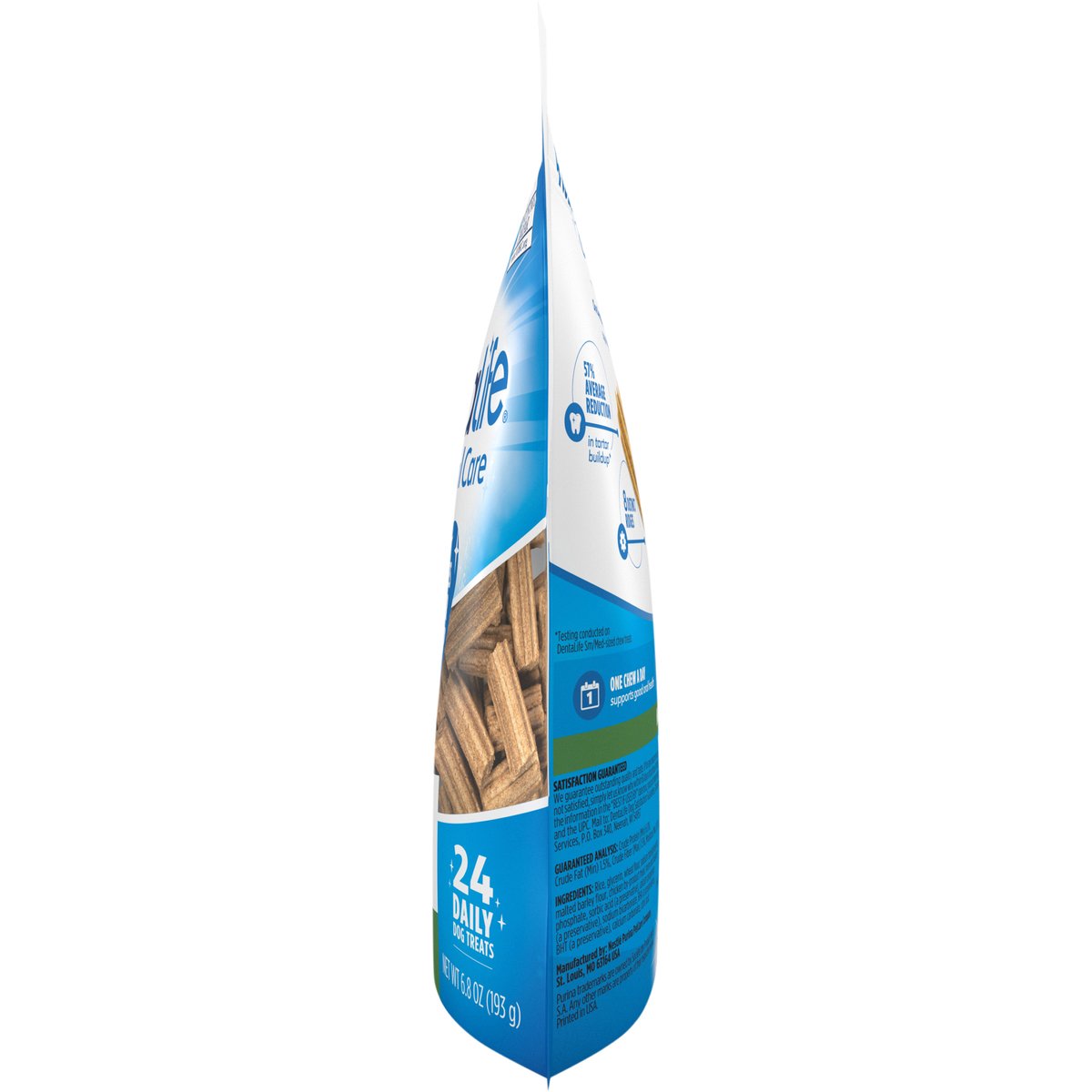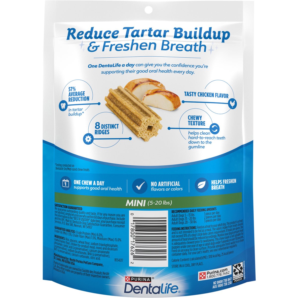 Calorie Content (calculated)(ME): 3110 kcal/kg, 25 kcal/piece. No artificial flavors or colors. Daily oral care. Reduces tartar buildup. 57% Average reduction in tartar buildup*. Chewy texture helps clean teeth & freshen breath. Reduce tartar buildup & freshen breath. One DentaLife a day can give you the confidence you're supporting their good oral health every day. 57% average reduction in tartar buildup* 8 distinct ridges. Tasty chicken flavor. Chewy texture helps clean hard-to-reach teeth down to the gumline. One chew a day supports good oral health. Healps freshen breath. * Testing conducted on DentaLife Sm/Med-sized chew treats. Satisfaction Guaranteed: We guarantee outstanding quality and taste. If for any reason you are hot satisfied, simply let us know why within 60 days of purchase. Include the information in the "Best if used by" date box, your purchase receipt and the UPC. Mail to: dentalife dog satisfaction guarantee, consumer services, P.O. Box 340, Neenah, WI 54957. VOHC Accepted: Veterinary Oral Health Council. Helps control tartar. www.vohc.org. purina.com. how2recycle.info. Printed in USA.