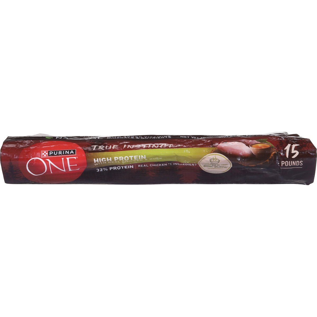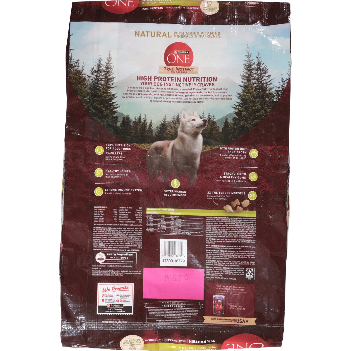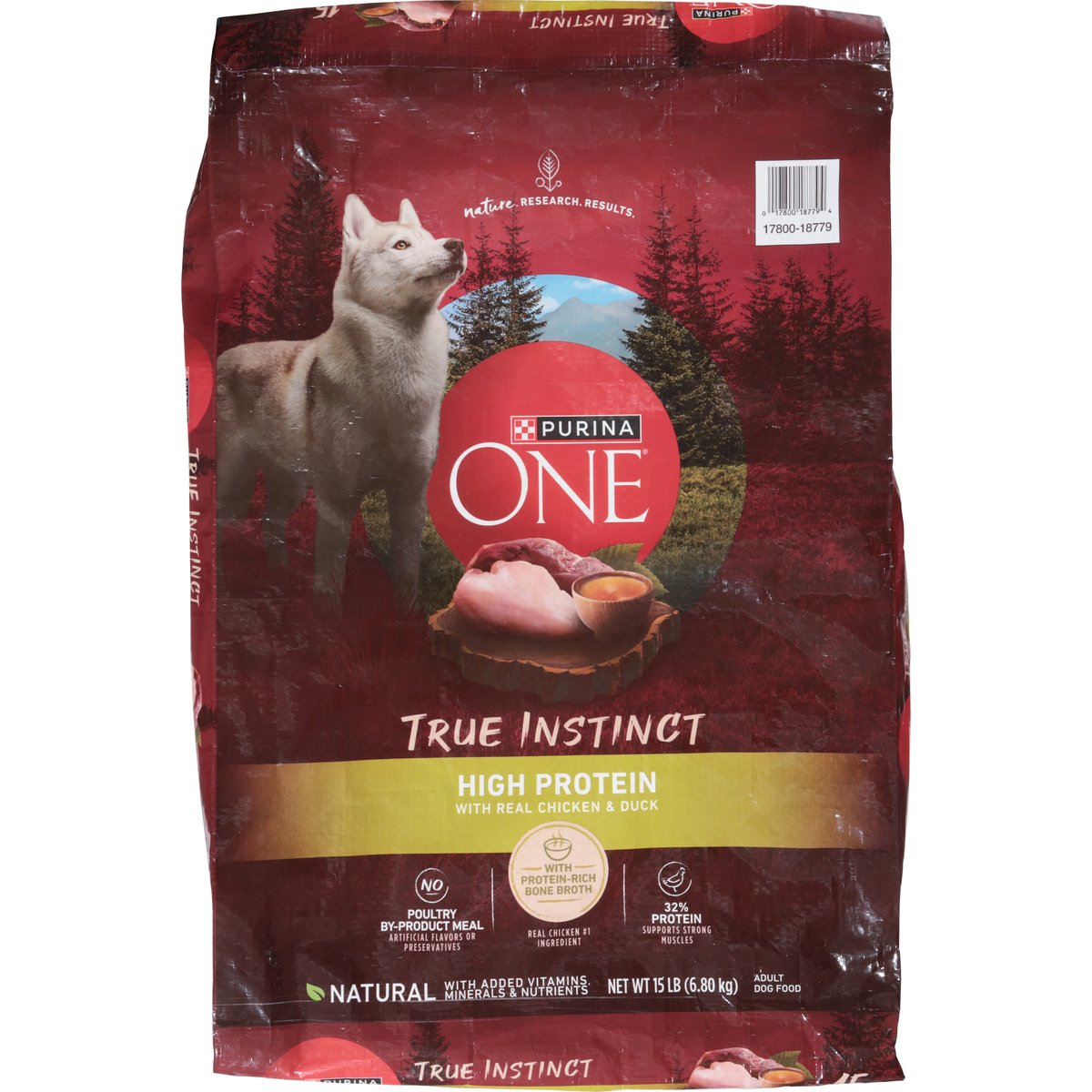 Natural with added vitamins, minerals & nutrients. No artificial flavors or preservatives. High protein. Nature. Research. Results. No poultry by-products meal. With protein-rich bone broth. Dry dog food. High protein nutrition your dog instinctively craves. Crafted to be a dog food closer to what nature intended. Purina One True Instinct High Protein recipes start with a SmartBlend of natural ingredients, backed by research. That means 32% protein, with real chicken & duck, protein-rich bone broth, and no poultry by-product meal, artificial flavors or preservatives. The result is truly healthy nutrition made to support strong muscles and healthy joints. 100% nutrition for adult dogs. 0% Fillers. Every ingredient has a purpose. Healthy Joints: Natural sources of glucosamine. Strong Immune System: 4 antioxidant sources. With Protein-Rich Bone Broth: A naturally-occurring source of collagen. Strong Teeth & Healthy Gums: Crunchy kibble & calcium. 2x The Tender Morsels: Compared to Purina ONE lamb & rice formula. Veterinarian recommended. We Promise: To Enrich pets' lives. To Drive breakthrough innovations. To champion high-quality nutrition. To care for the planet. See The Difference - Guaranteed: We're so sure you'll see a healthy difference in your dog, we're offering a money-back guarantee. If this product has not met your expectations, we will gladly refund your purchase price. Cut out the best if used by date box from this bag. Send within 60 days of date on receipt along with your original purchase receipt with the price circled, a brief explanation of why you were dissatisfied with the product, and your name and street address (PO Box not accepted) to: Nestle Purina PetCare, PO Box 340, Neenah, WI 54957. Offer good only in USA, APOs and FPOs. Purina.com. www.PurinaOne.com. how2recycle.info. Every ingredient has a purpose: PurinaOne.com/ingredients. We're Listening 1-866-787-4621; Purina.com Take the 28-day challenge at Purinaone.com/dog28dc and discover the signs of a healthy pet. Pair with Purina One Wet formulas. Printed in USA. Crafted in Purina-Owned facilities in the USA.