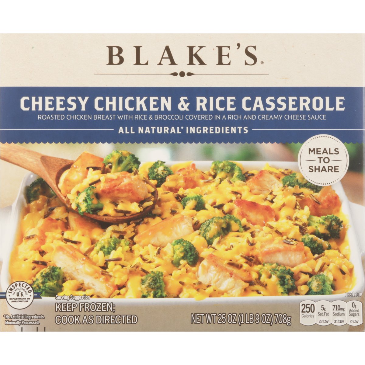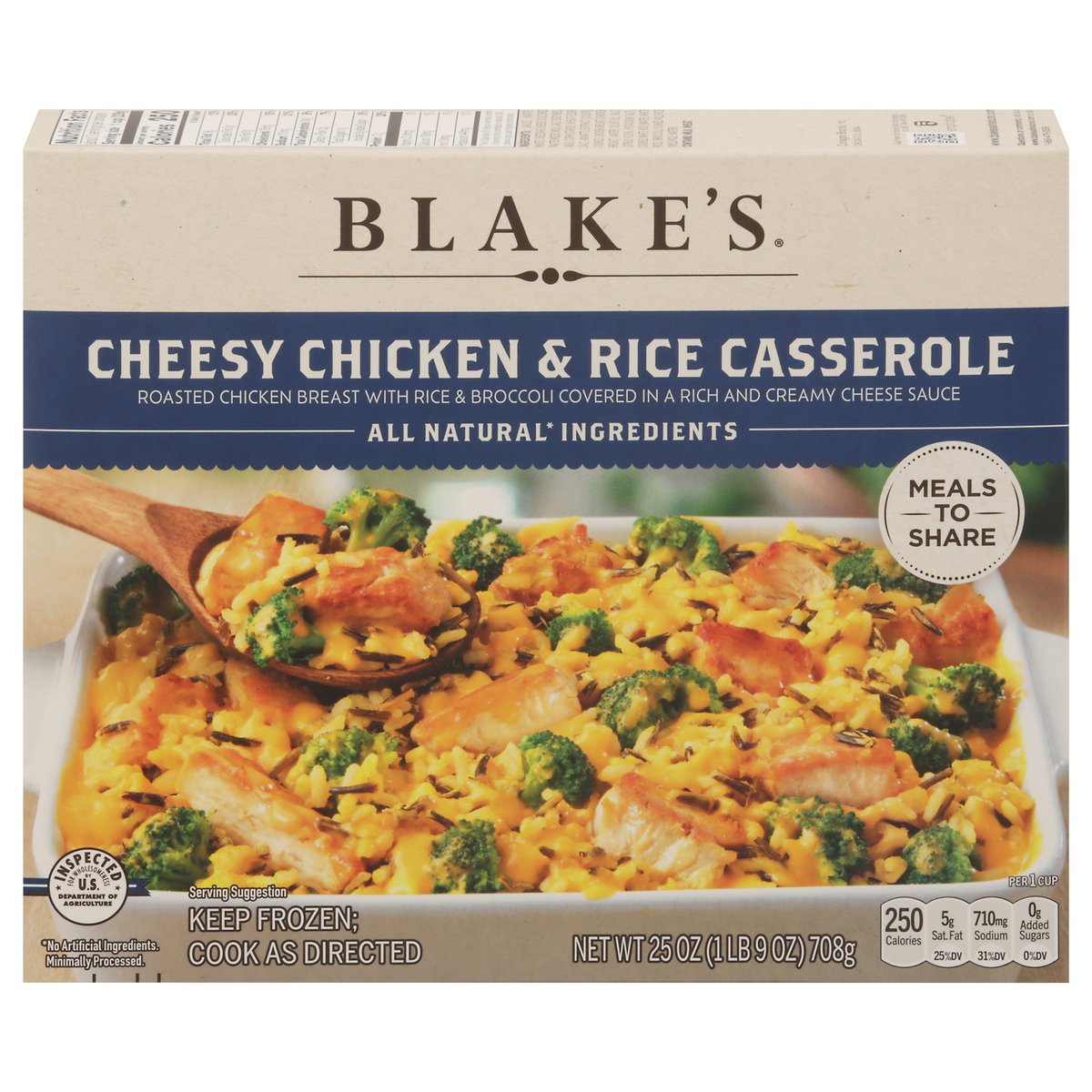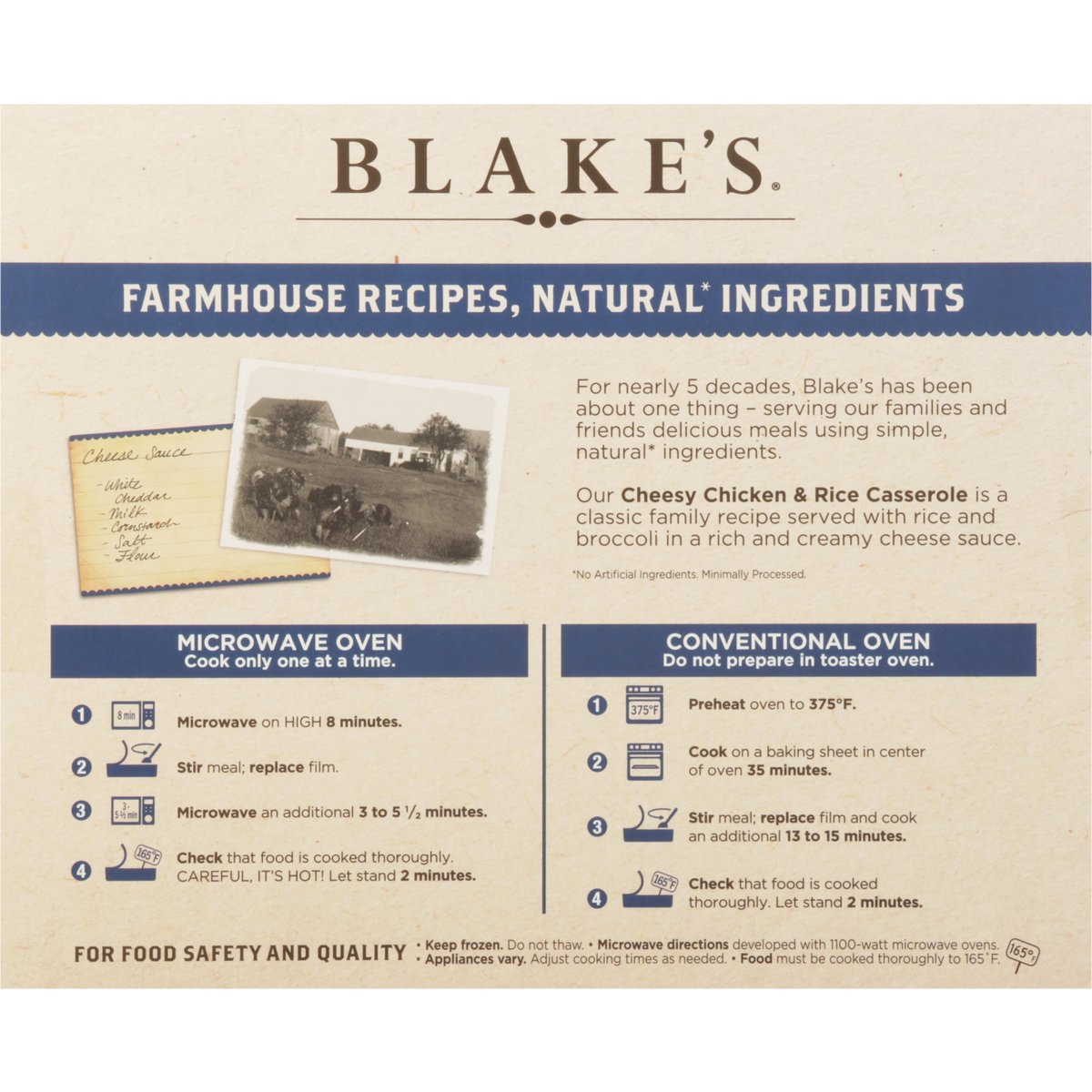 Roasted chicken breast with rice & broccoli covered in a rich and creamy cheese sauce. Per 1 Cup: 250 calories; 5 g sat fat (25% DV); 710 mg sodium (31% DV); 0 g added sugars (0% DV). Meals to share. Farmhouse recipes, natural* ingredients. For nearly 5 decades, Blake's has been about one thing - serving our families and friends delicious meals using simple, natural* ingredients. Our Cheesy Chicken & Rice Casserole is a classic family recipe served with rice and broccoli in a rich and creamy cheese sauce. * No artificial ingredients: Minimally processed. Inspected for wholesomeness by U.S. Department of Agriculture. www.blakesallnatural.com. SmartLabel: Scan for more food information or call 1-866-479-3859. Questions or comments, visit us at www.blakesallnatural.com or call 1-866-479-3859.