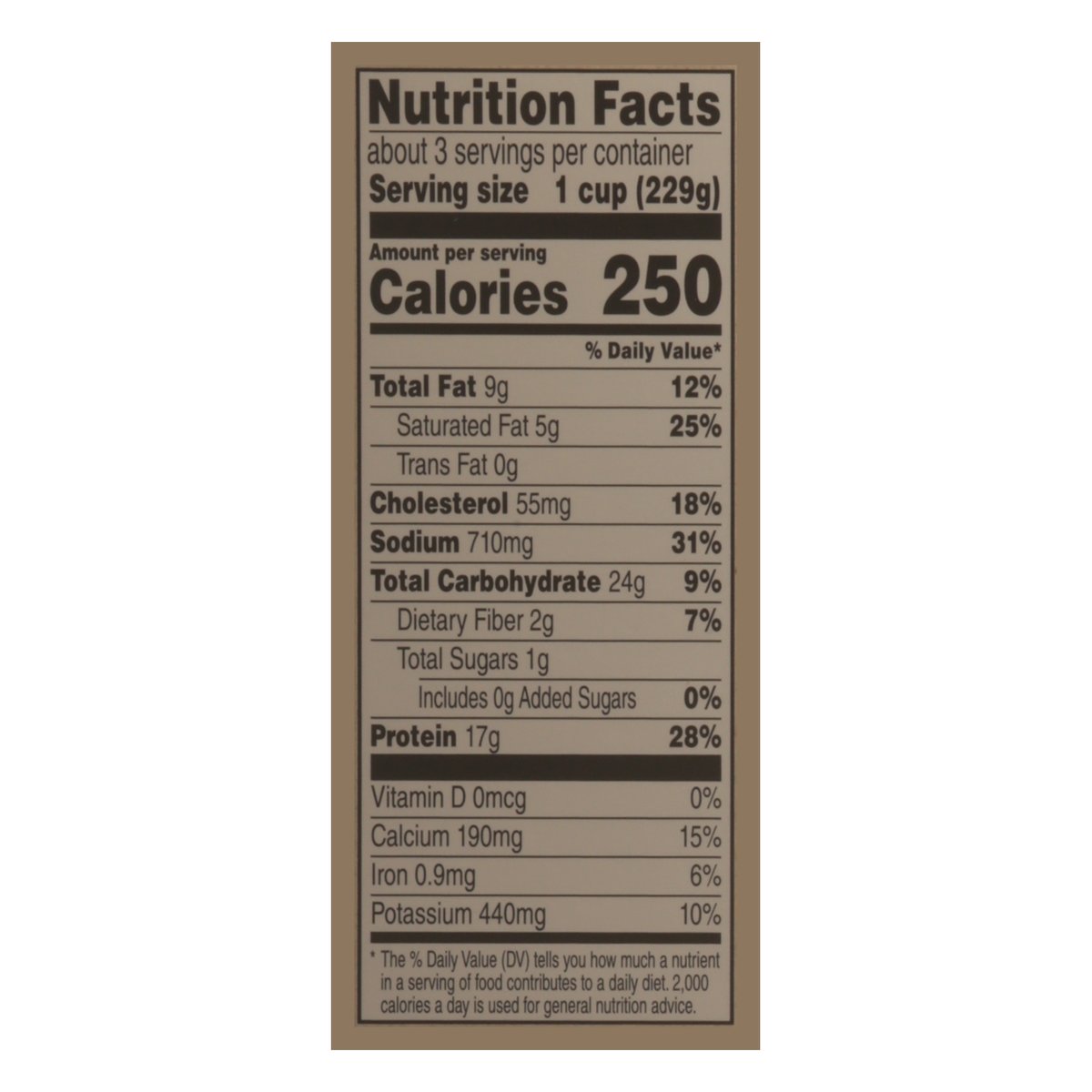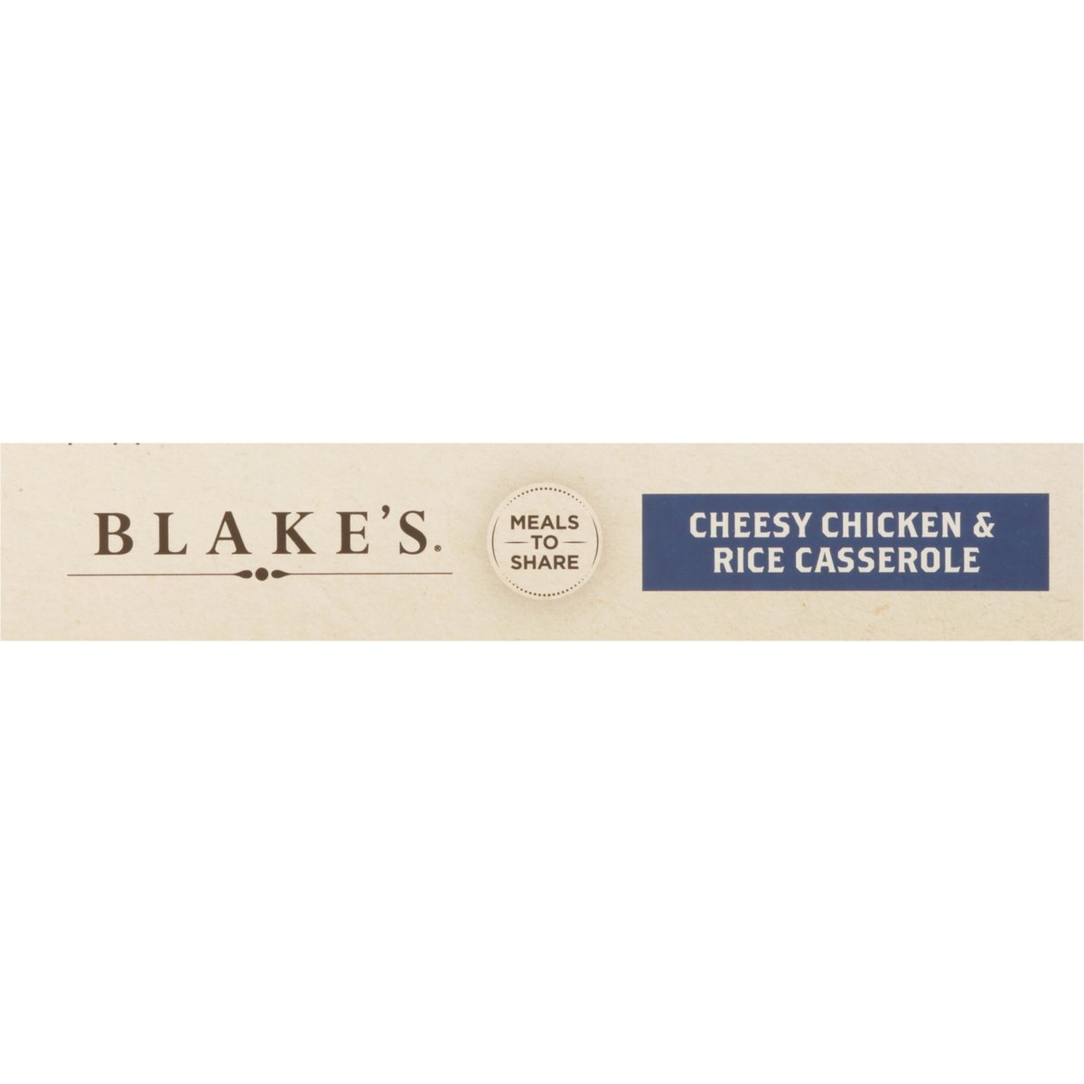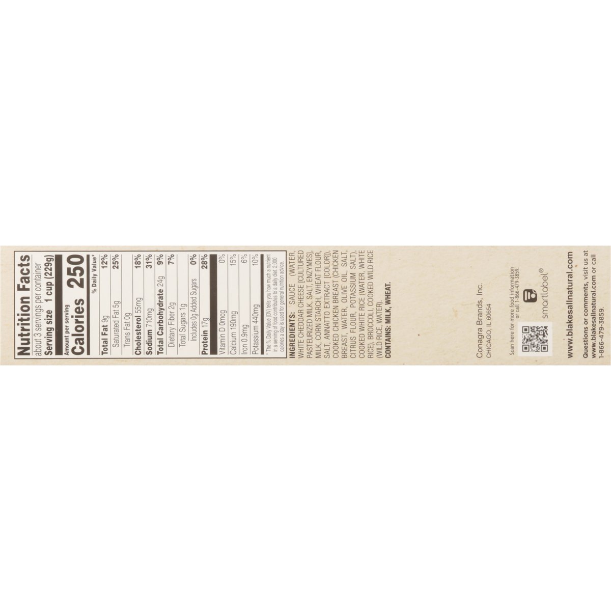 Roasted chicken breast with rice & broccoli covered in a rich and creamy cheese sauce. Per 1 Cup: 250 calories; 5 g sat fat (25% DV); 710 mg sodium (31% DV); 0 g added sugars (0% DV). Meals to share. Farmhouse recipes, natural* ingredients. For nearly 5 decades, Blake's has been about one thing - serving our families and friends delicious meals using simple, natural* ingredients. Our Cheesy Chicken & Rice Casserole is a classic family recipe served with rice and broccoli in a rich and creamy cheese sauce. * No artificial ingredients: Minimally processed. Inspected for wholesomeness by U.S. Department of Agriculture. www.blakesallnatural.com. SmartLabel: Scan for more food information or call 1-866-479-3859. Questions or comments, visit us at www.blakesallnatural.com or call 1-866-479-3859.