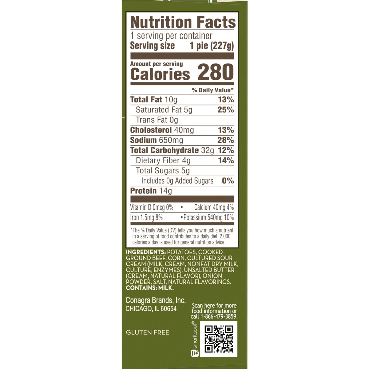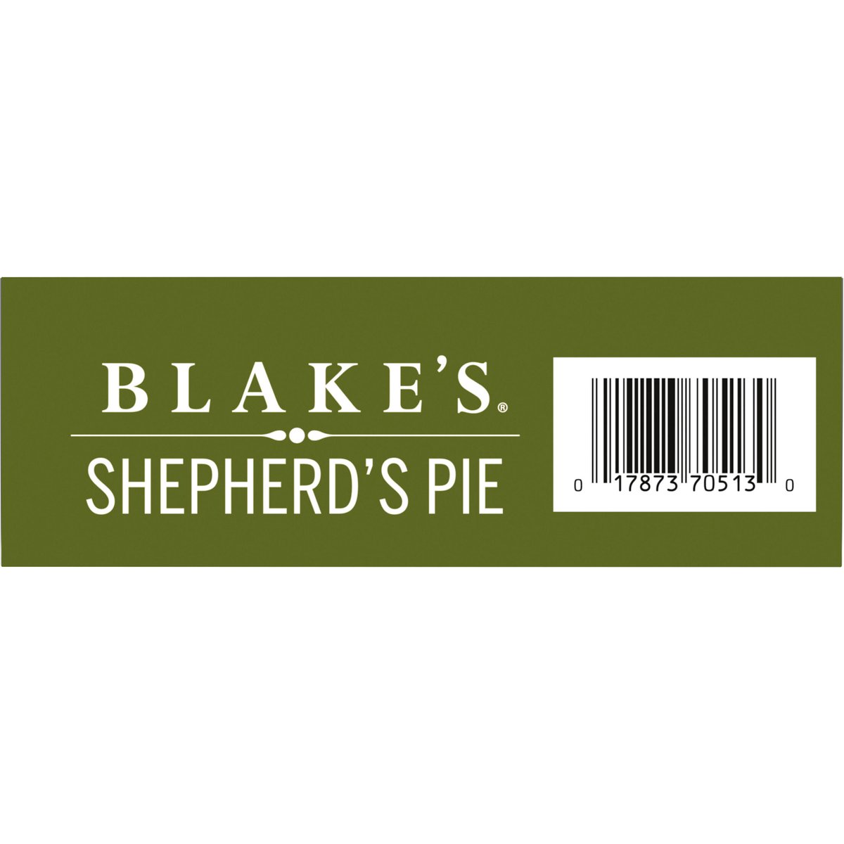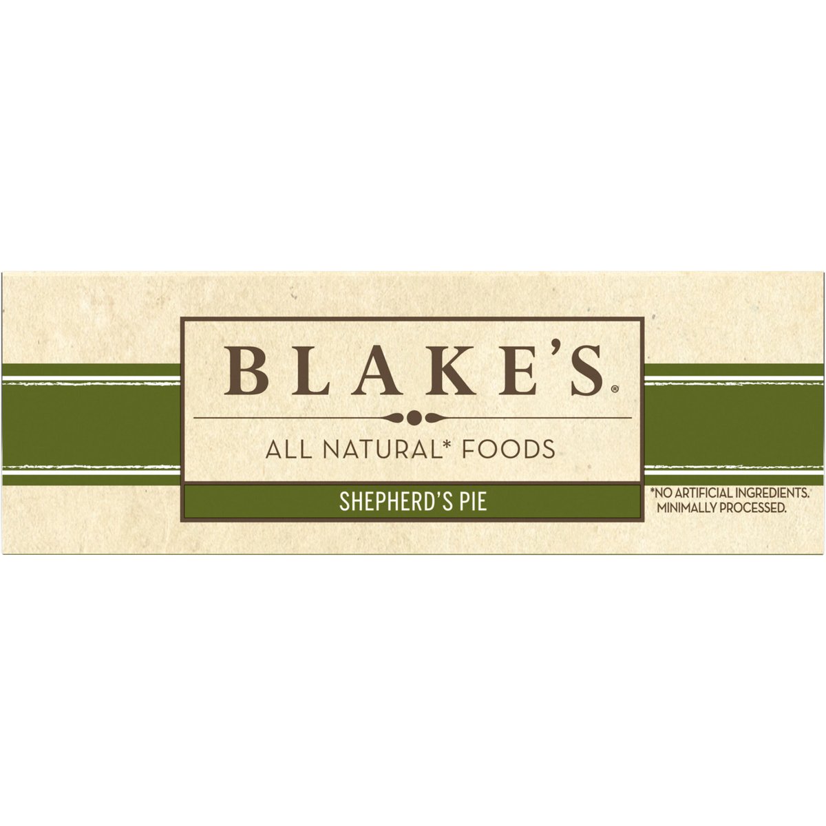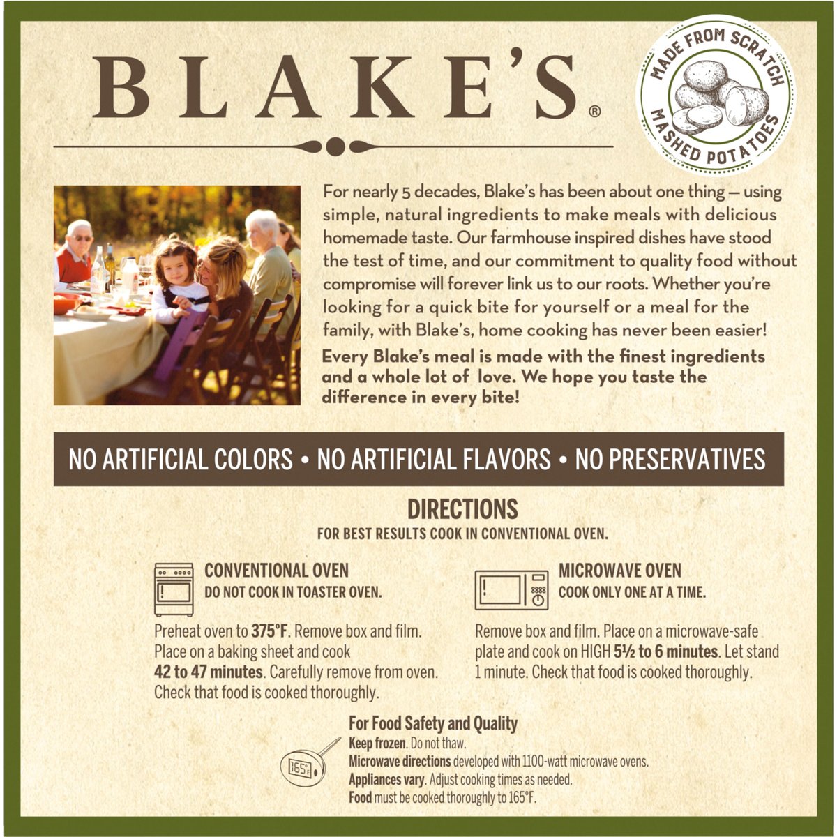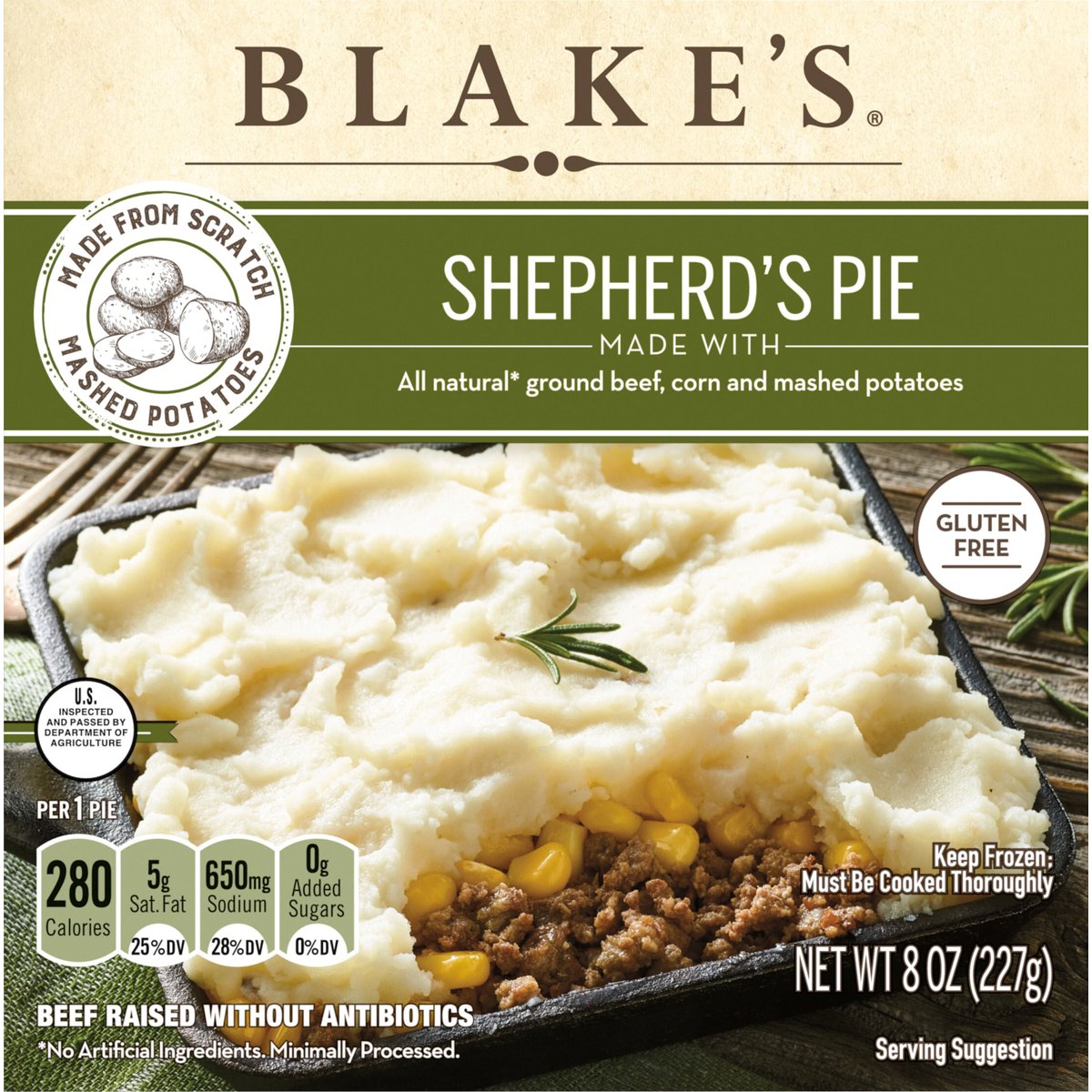 No artificial flavors. Per 1 Pie: 280 calories; 5 g sat fat (25% DV); 650 mg sodium (28% DV); 0 g added sugars (0% DV). Gluten free. Made from scratch mashed potatoes. Beef raised without antibiotics. For nearly 5 decades, Blake's has been about one thing - using simple, natural ingredients to make meals with delicious homemade taste. Our farmhouse inspired dishes have stood the test of time, and our commitment to quality food without compromise will forever link us to our roots. Whether you're looking for a quick bite for yourself or a meal for the family, with Blake's, home cooking has never been easier! Every Blake's meal is made with the finest ingredients and a whole lot of love. We hope you taste the difference in every bite! No artificial colors. No preservatives. U.S. inspected and passed by Department of Agriculture. how2recycle.info. www.blakesallnatural.com. Facebook. Instagram. Twitter. SmartLabel: Scan for more food information or call 1-866-479-3859. Questions or comments, visit us at www.blakesallnatural.com or call 1-866-479-3859.