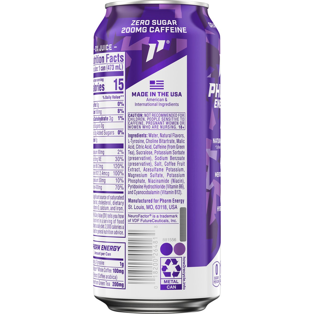 Flavored with other natural flavors. 0 sugar per can. 15 fifteen calories. 0 fat per can. Zero sugar. 200 mg caffeine. Natural energy*. Mental focus. Hydration. * Caffeine from green tea. how2recycle.info. Made in the USA. American & international ingredients.