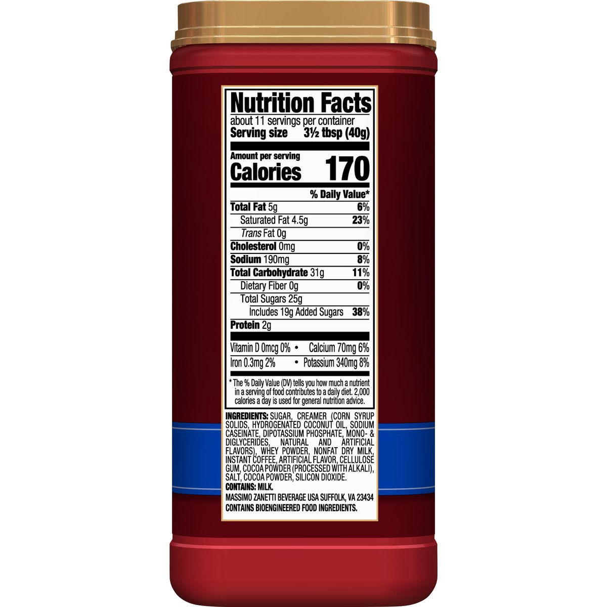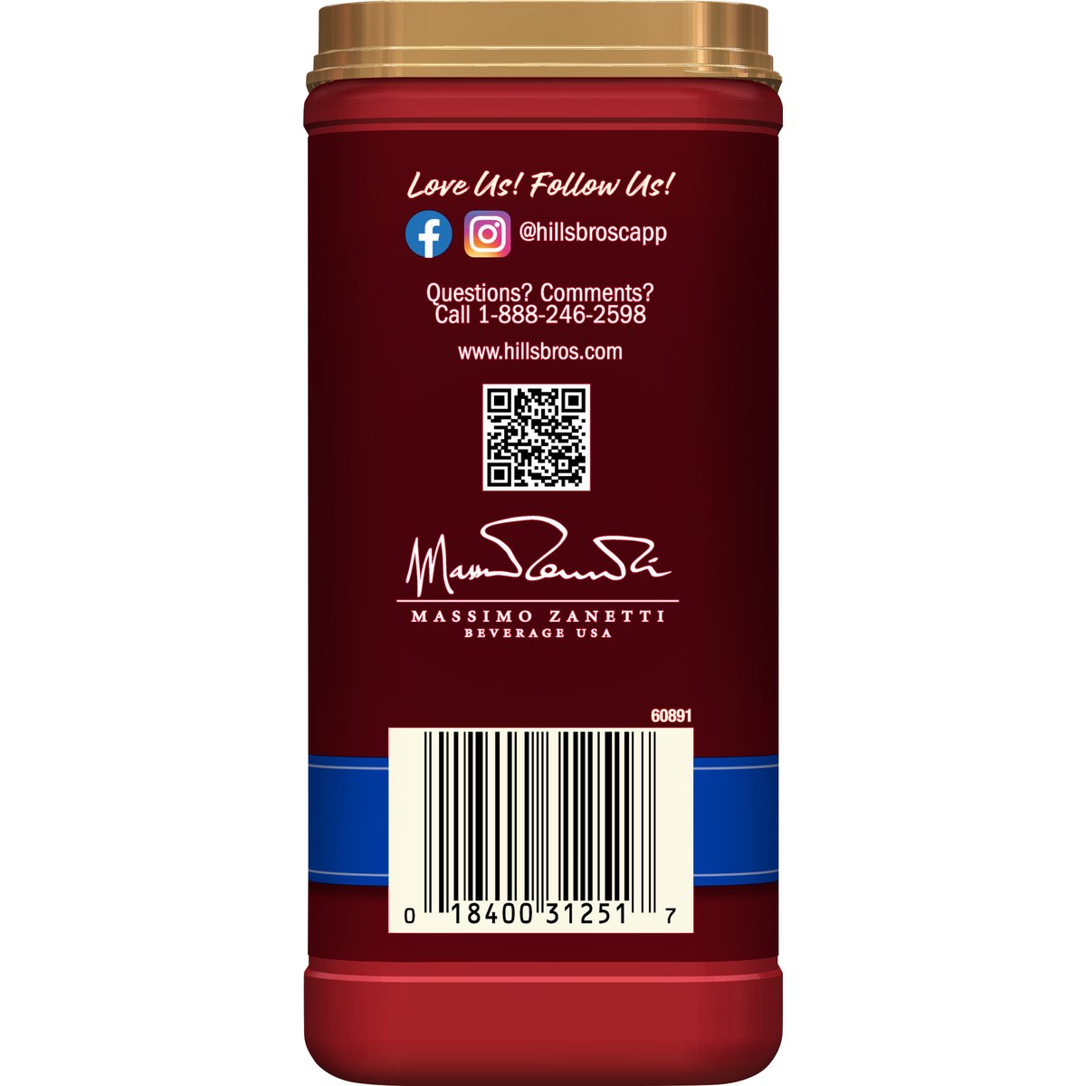 Cafe style drink mix. Artificially flavored. Gluten free. 52 mg caffeine per serving. Contains bioengineered food ingredients. www.hillsbros.com. how2recycle.info. Love us! Follow us! Facebook. Instagram. @hillsbroscapp. For recipes, visit hillsbros.com/recipes. Questions? Comments? Call 1-888-246-2598.