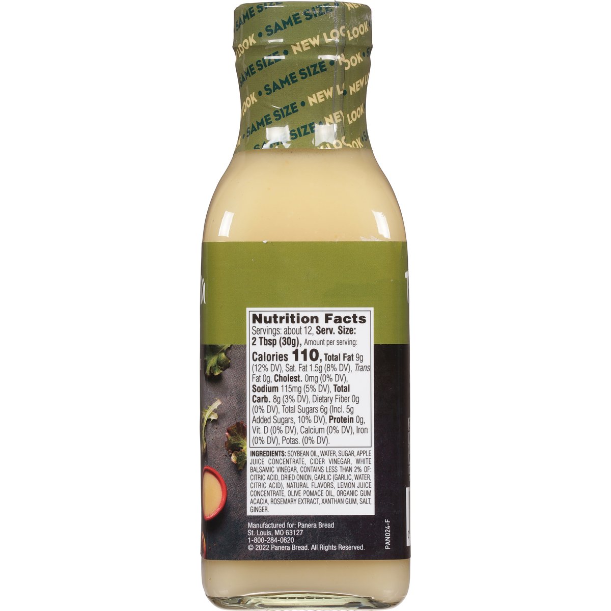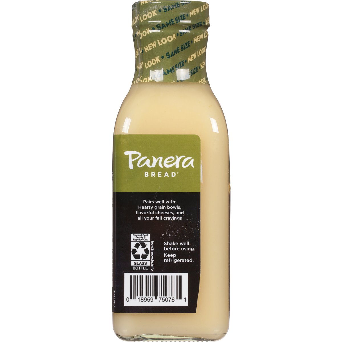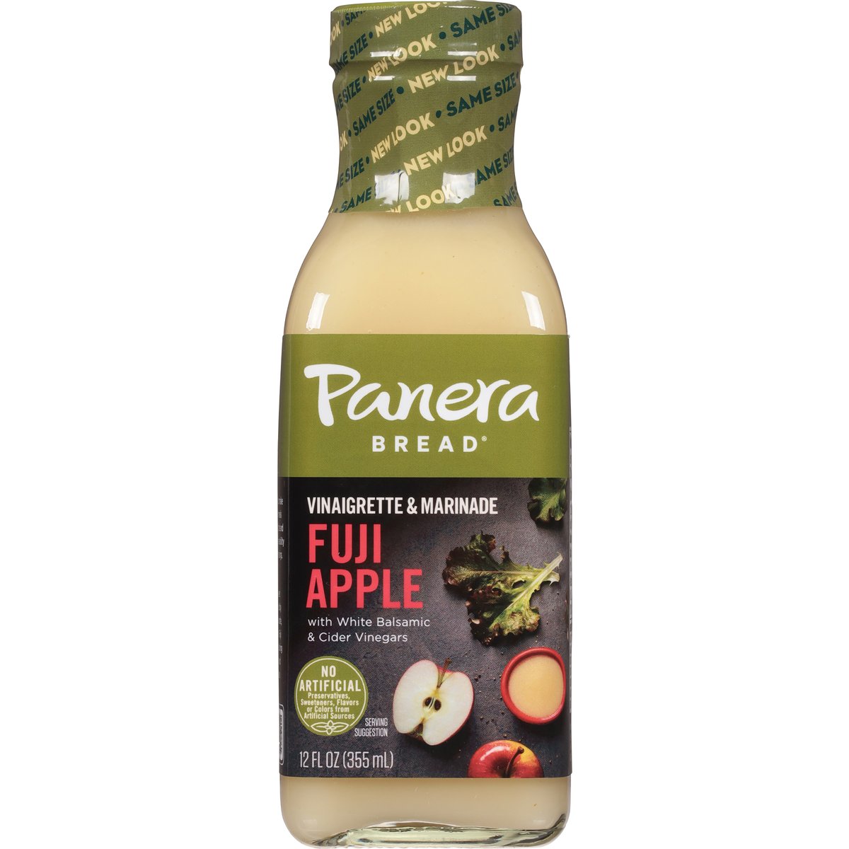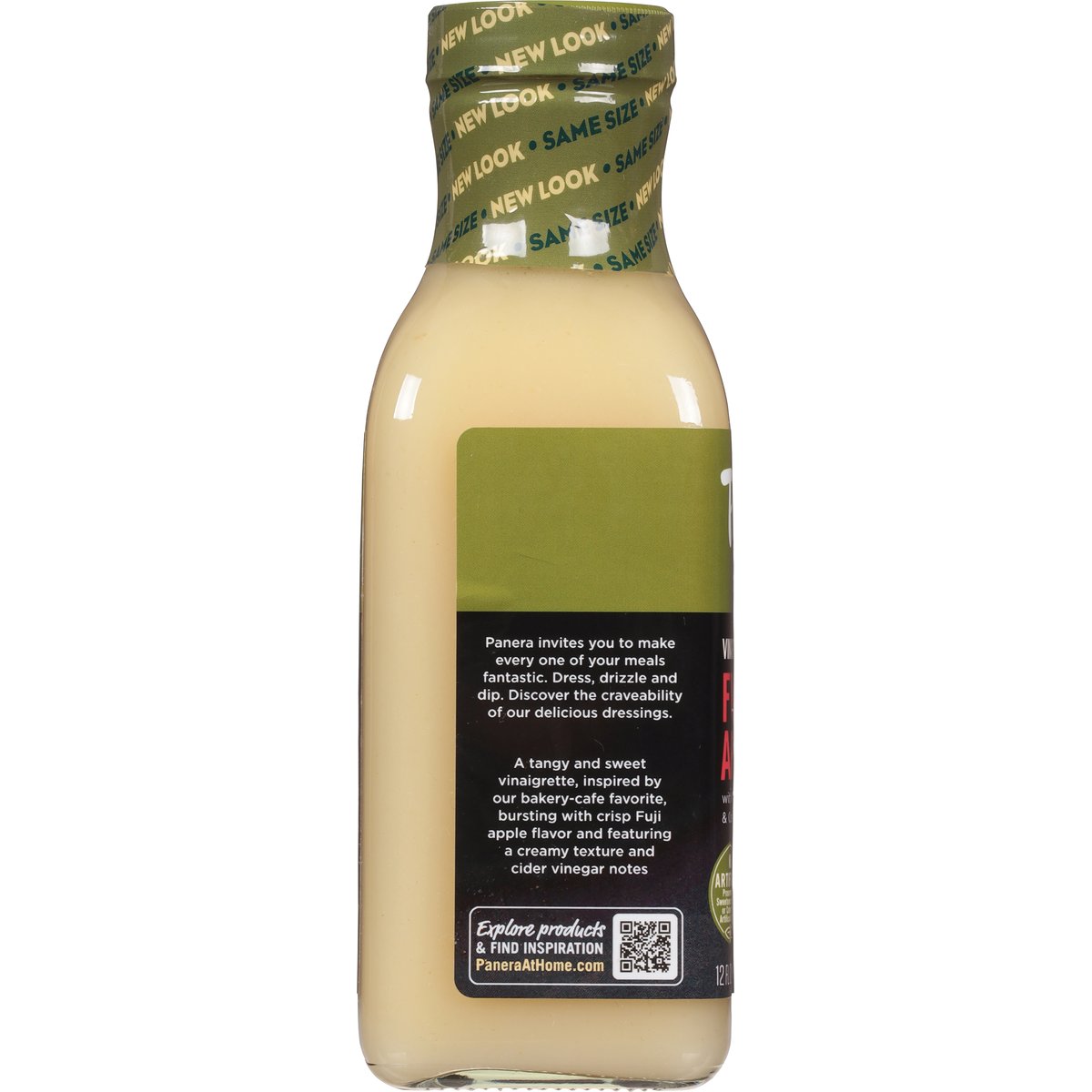 Fuji apple with white balsamic & cider vinegars. No artificial preservatives, sweeteners, flavors or colors from artificial sources. Panera invites you to make every one of your meals fantastic. Dress, drizzle and dip. Discover the craveability of our delicious dressings. A tangy and sweet vinaigrette, inspired by our bakery-cafe favorite, bursting with crisp Fuji apple flavor and featuring a creamy texture and cider vinegar notes. how2recycle.info. PaneraAtHome.com. Explore products & find inspiration PaneraAtHome.com. 1-800-284-0620.