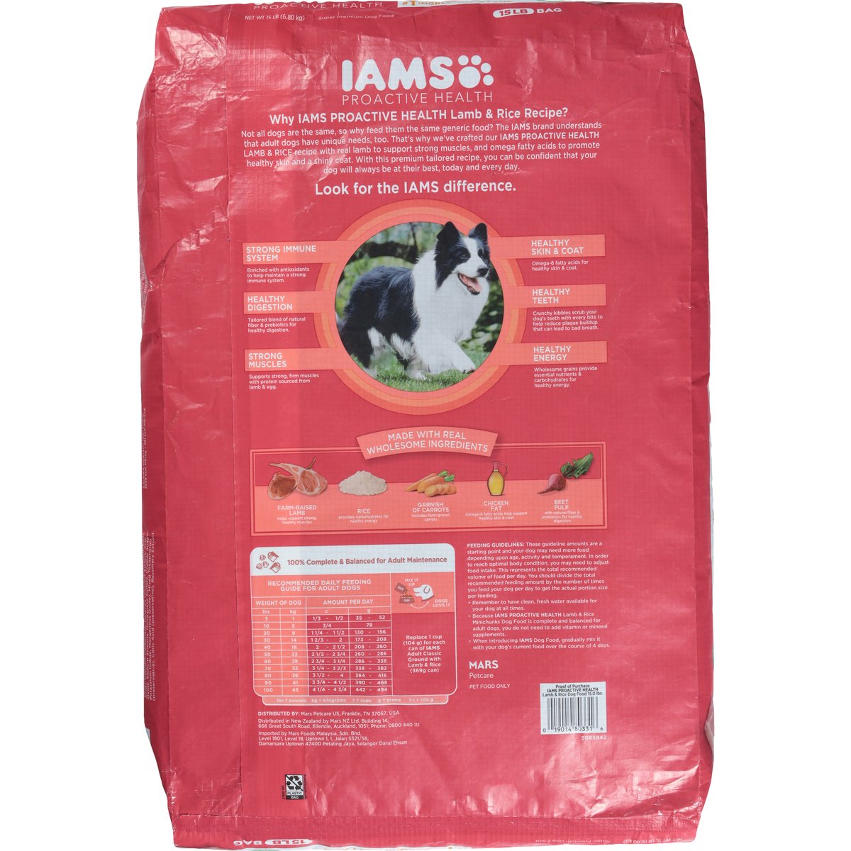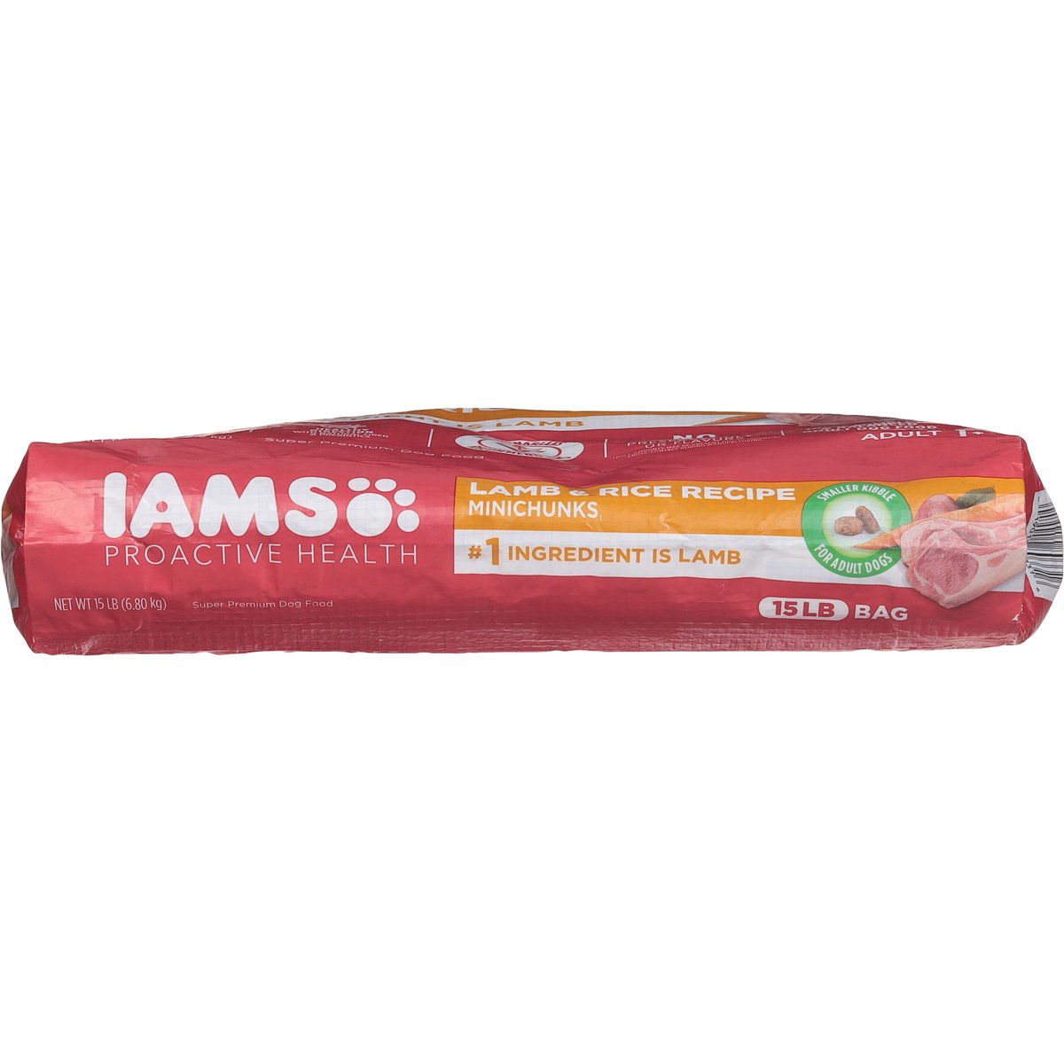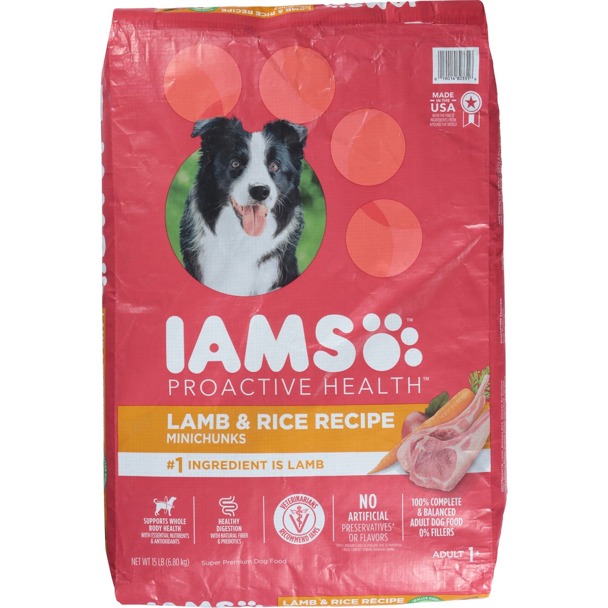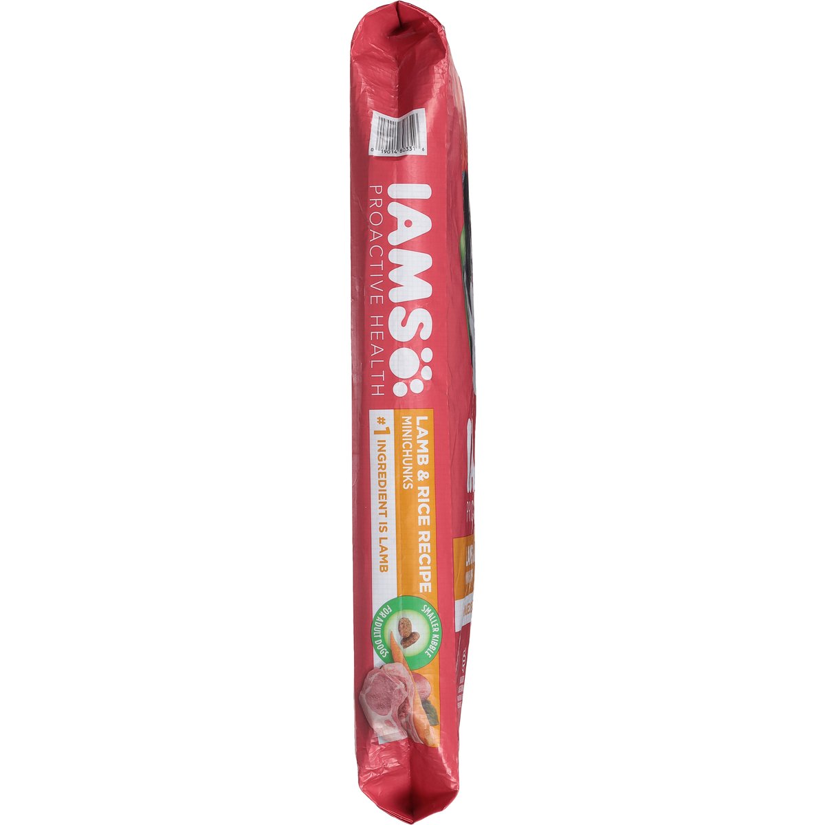 Calorie Content (Calculated): 3656 kcal ME/kg, 381 kcal ME/cup. IAMS Proactive Health Lamb & Rice Minichunks Recipe Adult Dog Food is formulated to meet the nutritional levels established by the AAFCO Dog Food Nutrient Profiles for Maintenance. Adult 1+. 100% complete & balanced adult dog food. No artificial preservatives* or flavors. * trace amounts may be present due to potential cross contact during manufacturing. Supports whole body health with essential nutrients & antioxidant. Healthy digestion with natural fiber & prebiotics. Veterinarians recommended IAMS. 100% complete & balanced adult dog food. 0% fillers. Why IAMS Lamb & Rice Recipe? Not all dogs are the same, so why feed them the same generic food? The IAMS brand understands that adult dogs have unique needs, too. That's why we've crafted our IAMS Adult Lamb & Rice recipe with real lamb to promote strong muscles, and omega fatty acids to promote healthy skin and a shiny coat. With this premium tailored recipe, you can be confident that your dog will always be at their best, today and every day. Look for the IAMS Difference. Strong Immune System: Enriched with antioxidants to help maintain a strong immune system. Healthy Digestion: Tailored blend of natural fiber & prebiotics for healthy digestion. Strong Muscles: Supports strong, firm muscles with protein sourced from lamb and egg. Healthy Skin and Coat: Omega 6 fatty acids for healthy skin & coat. Healthy Teeth: Crunchy kibbles scrub your dog's teeth with every bite, to help reduce plaque buildup that can lead to bad breath. Health Energy: Wholesome grains provide essential nutrients & carbohydrates for healthy energy. Pet food only. Iams Dog Foods offer a 100% guarantee. Questions? Comments? Call us at 1-800-525-4267. If you are not satisfied with this product, simply save the unused portion, together with the proof of purchase, and call us. We will gladly replace the product or refund your money. how2recycle.info. http://www.iams.com. Find out more about Tailored Nutrition at: http://www.iams.com. Made in the USA with the finest ingredients from around the world.