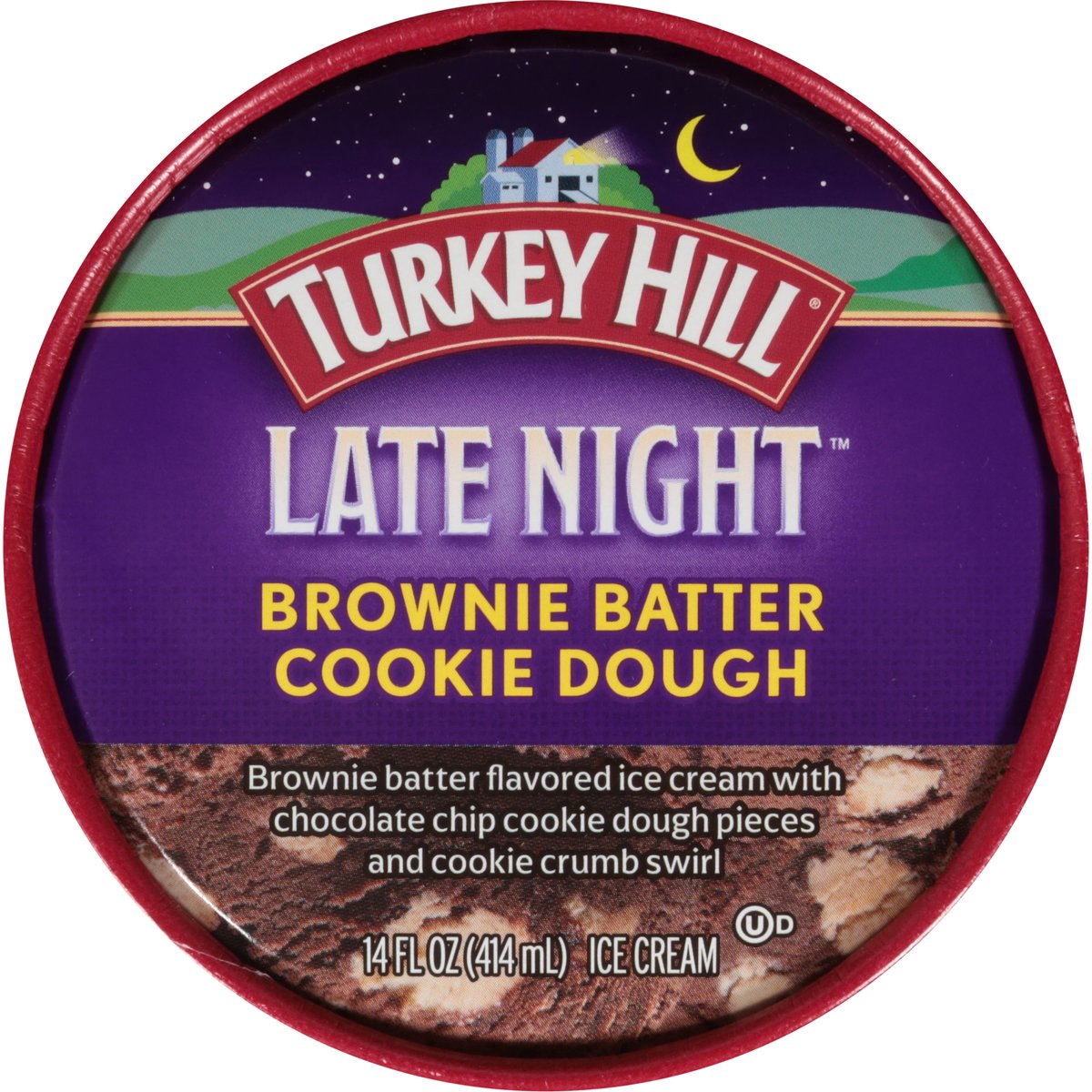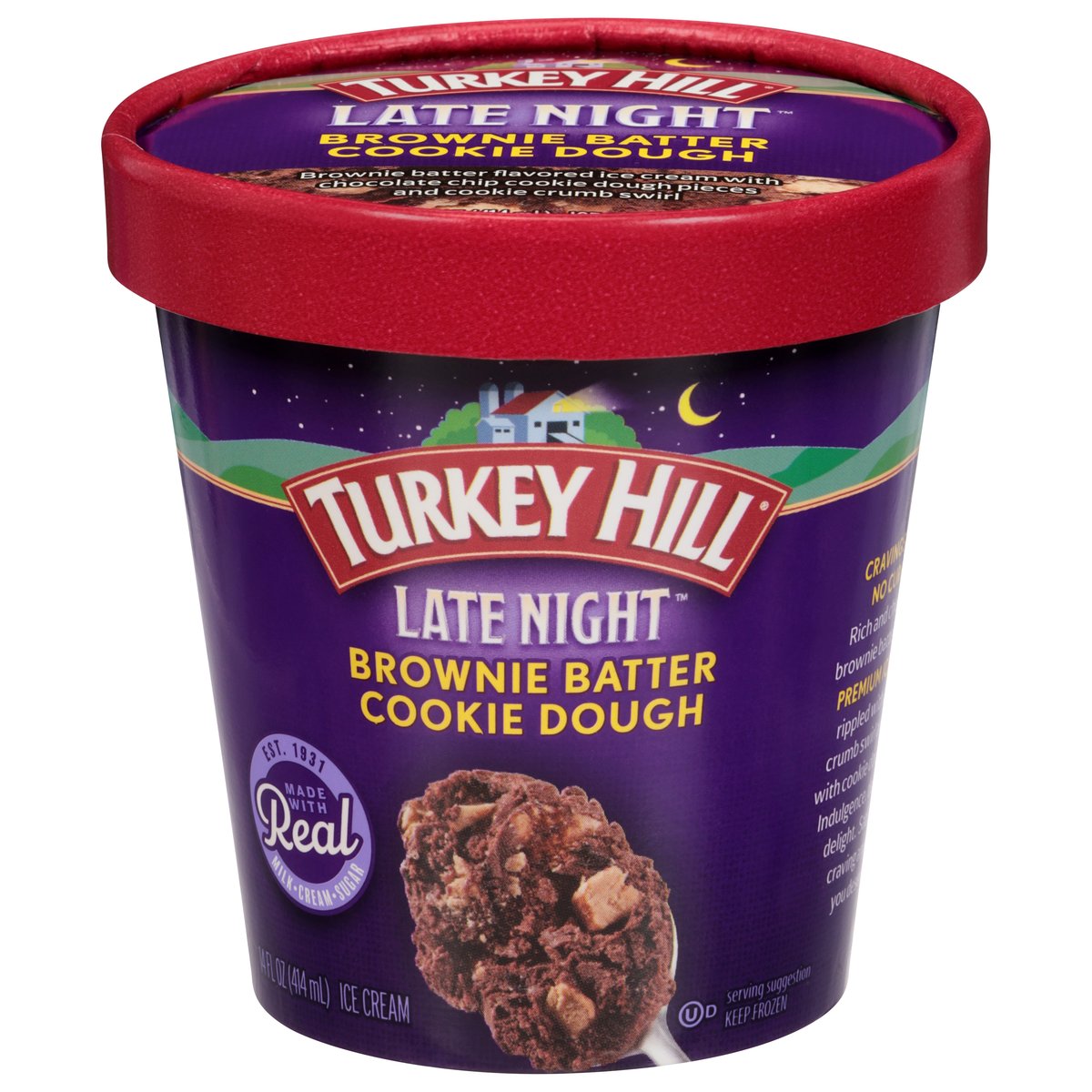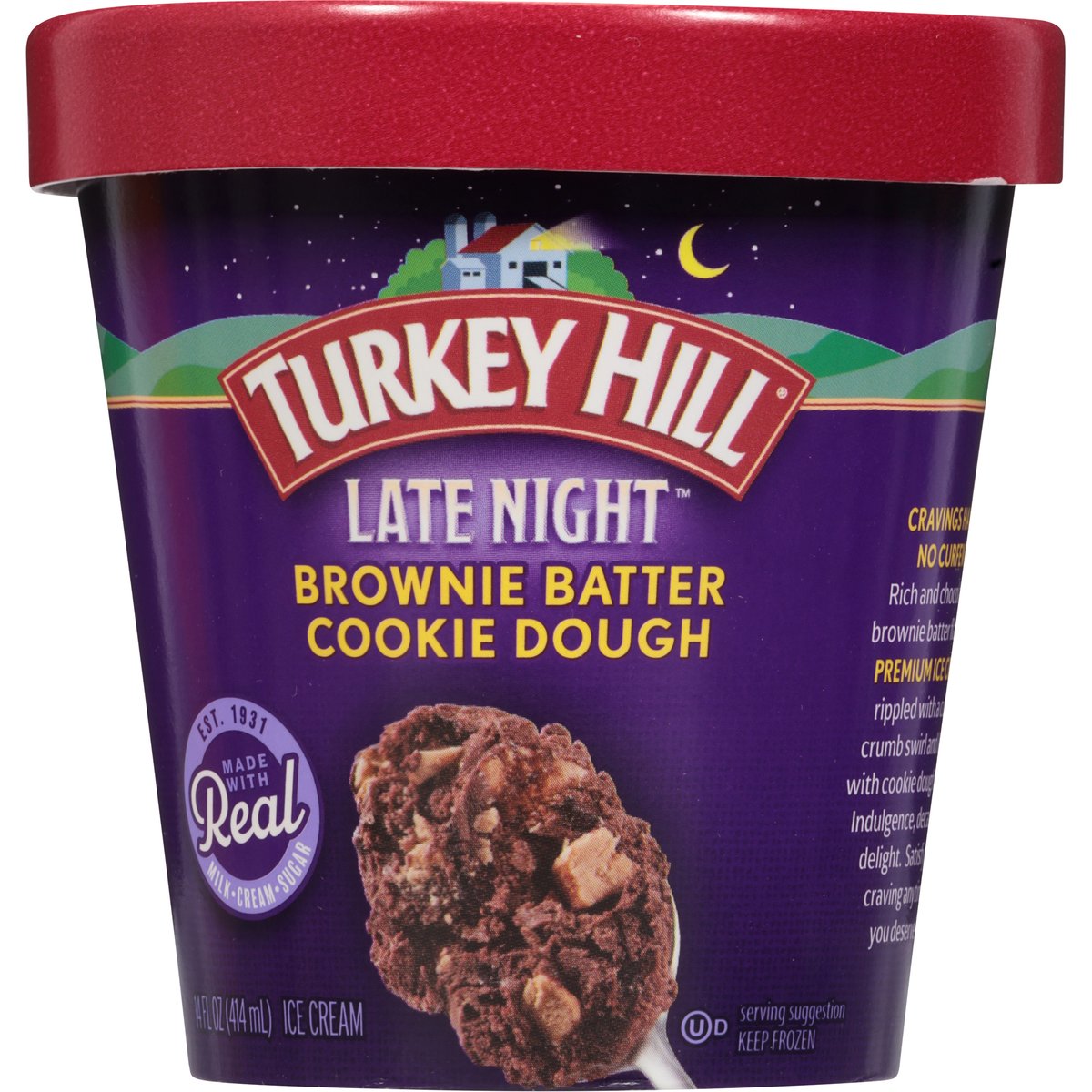 Brownie batter flavored ice cream with chocolate chip cookie dough pieces and cookie crumb swirl. Est. 1931. Cravings have no curfew! Rich and chocolatey brownie batter flavored premium ice cream rippled with a cookie crumb swirl and loaded with cookie dough pieces. Indulgence, decadence, delight. Satisfy your craving anytime - you deserve it! www.turkeyhill.com. Scan or call 1-(877) 992-9737 for more food information. Thank you for your purchase. We welcome your questions or comments at 800-My Dairy (M-F, 8-5 ET) or visit www.turkeyhill.com.