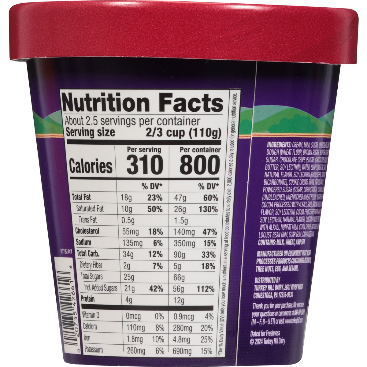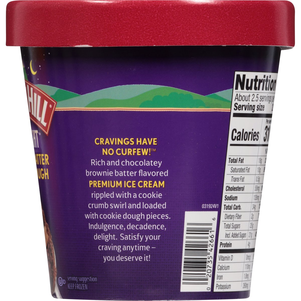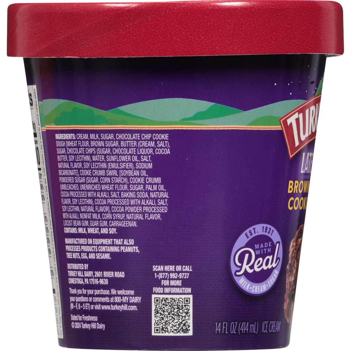 Brownie batter flavored ice cream with chocolate chip cookie dough pieces and cookie crumb swirl. Est. 1931. Cravings have no curfew! Rich and chocolatey brownie batter flavored premium ice cream rippled with a cookie crumb swirl and loaded with cookie dough pieces. Indulgence, decadence, delight. Satisfy your craving anytime - you deserve it! www.turkeyhill.com. Scan or call 1-(877) 992-9737 for more food information. Thank you for your purchase. We welcome your questions or comments at 800-My Dairy (M-F, 8-5 ET) or visit www.turkeyhill.com.