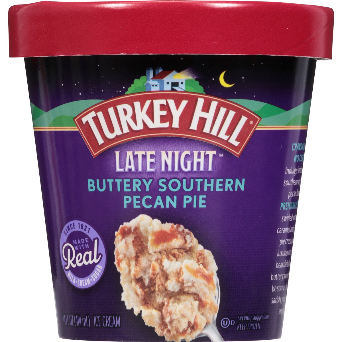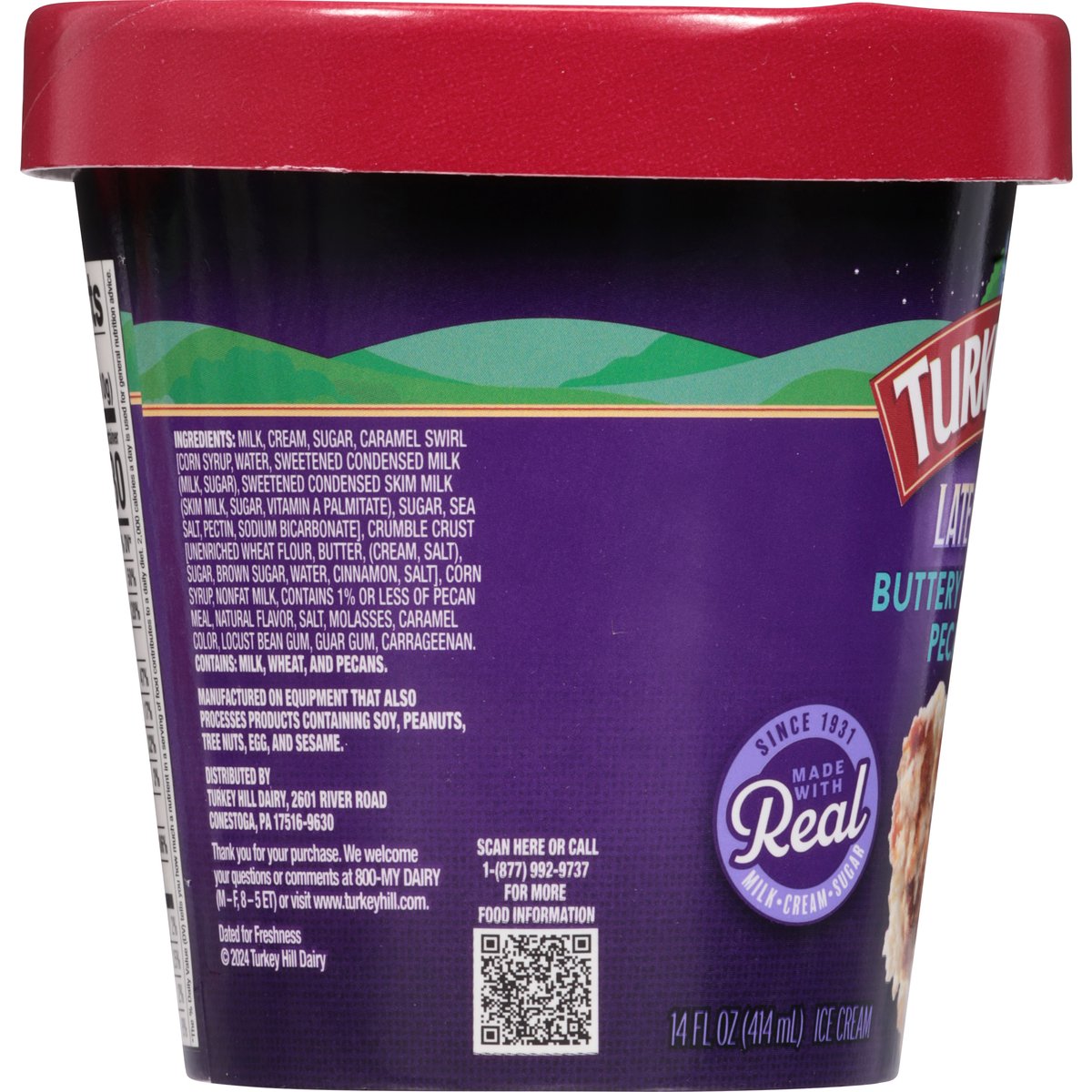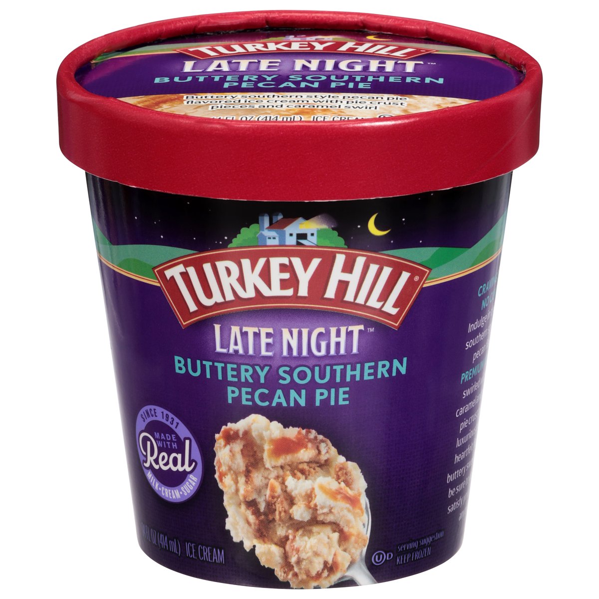 Buttery southern style pecan pie flavored ice cream with pie crust pieces and caramel swirl. Since 1931. Cravings have no curfew! Indulge in this classic Southern style butter pecan flavored premium ice cream swirled with sweet caramel and piled with pie crust pieces. A luxurious twist on a heartfelt flavor, this buttery sweet treat will be sure to delight and satisfy your cravings anytime! www.turkeyhill.com. Scan or call 1-(877) 992-9737 for more food information. Thank you for your purchase. We welcome your questions or comments at 800-My Dairy (M-F, 8-5 ET) or visit www.turkeyhill.com.