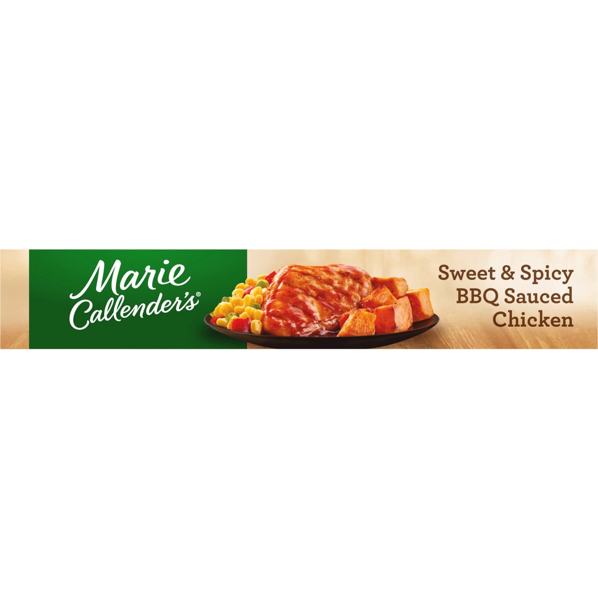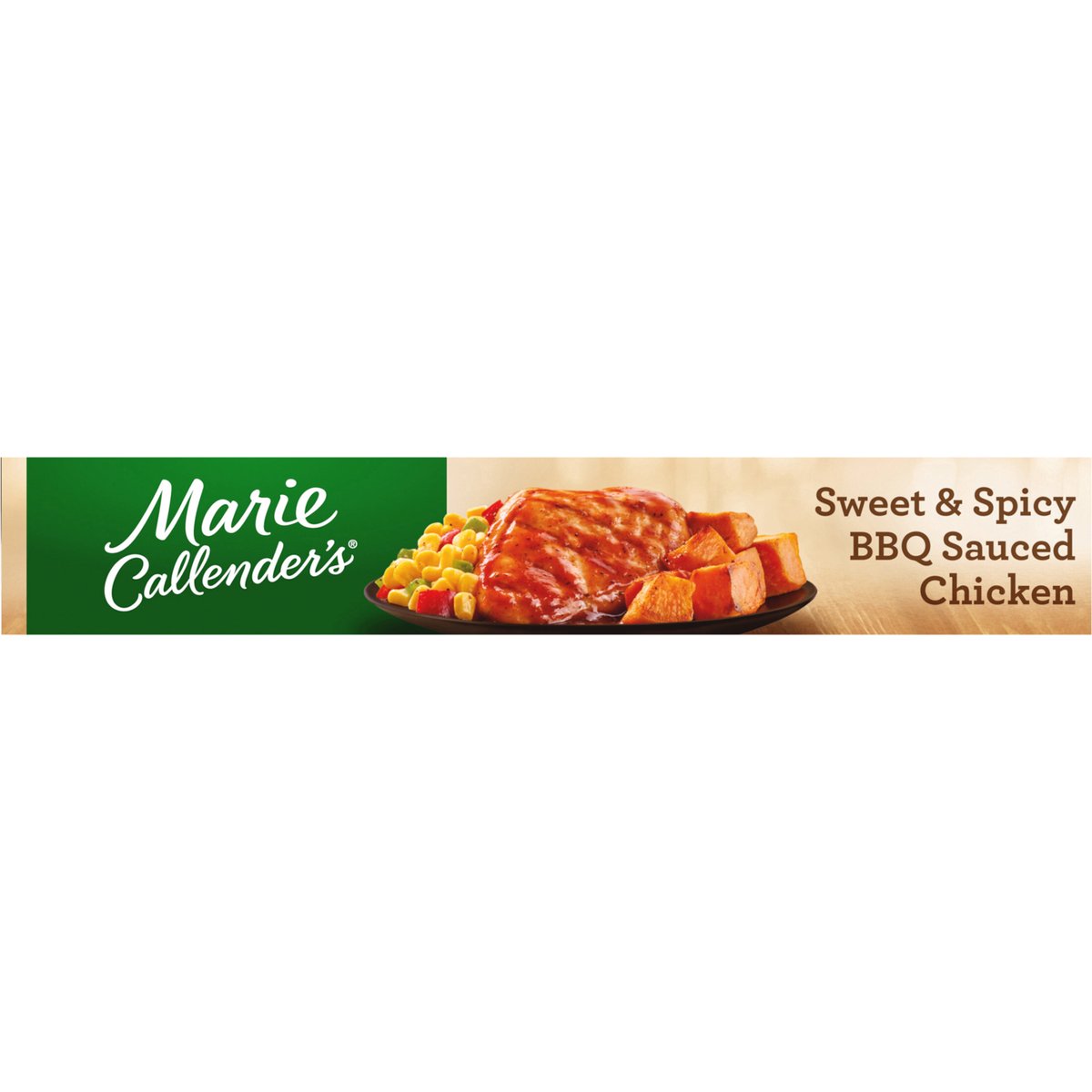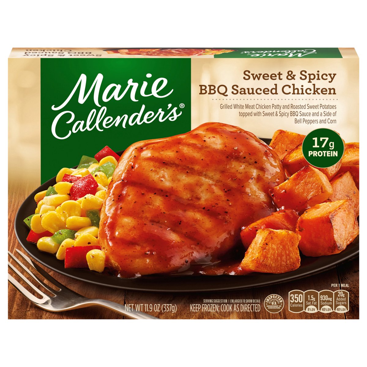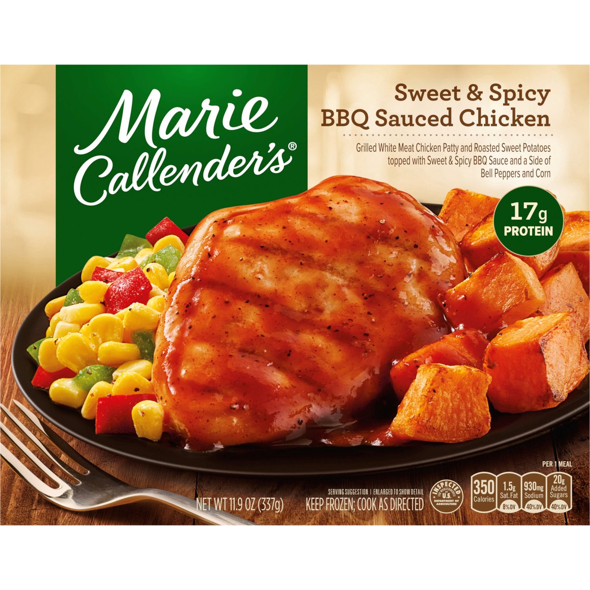 Grilled white meat chicken patty and roasted sweet potatoes topped with sweet & spicy bbq sauce and a side of bell peppers and corn. 17 g protein. Per 1 Meal: 350 calories; 1.5 g sat fat (8% DV); 930 mg sodium (40% DV); 20 g added sugars (40% DV). Vibrant medley of bell peppers and corn drizzled in a buttery sweet sauce. Smokey sweet & spicy bbq sauce made from scratch. No artificial colors. No preservatives. Inspected for wholesomeness by U.S. Department of Agriculture. www.mariecallendersmeals.com. SmartLabel: Scan for more food information or call 1-800-595-7010. Questions or comments, visit us at www.mariecallendersmeals.com or call 1-800-595-7010.