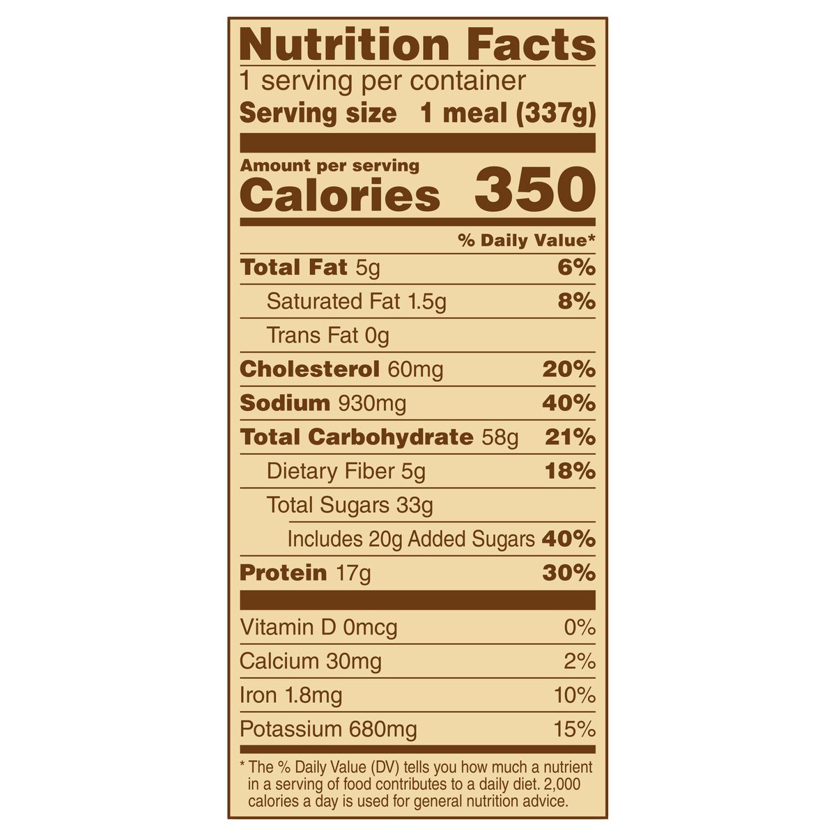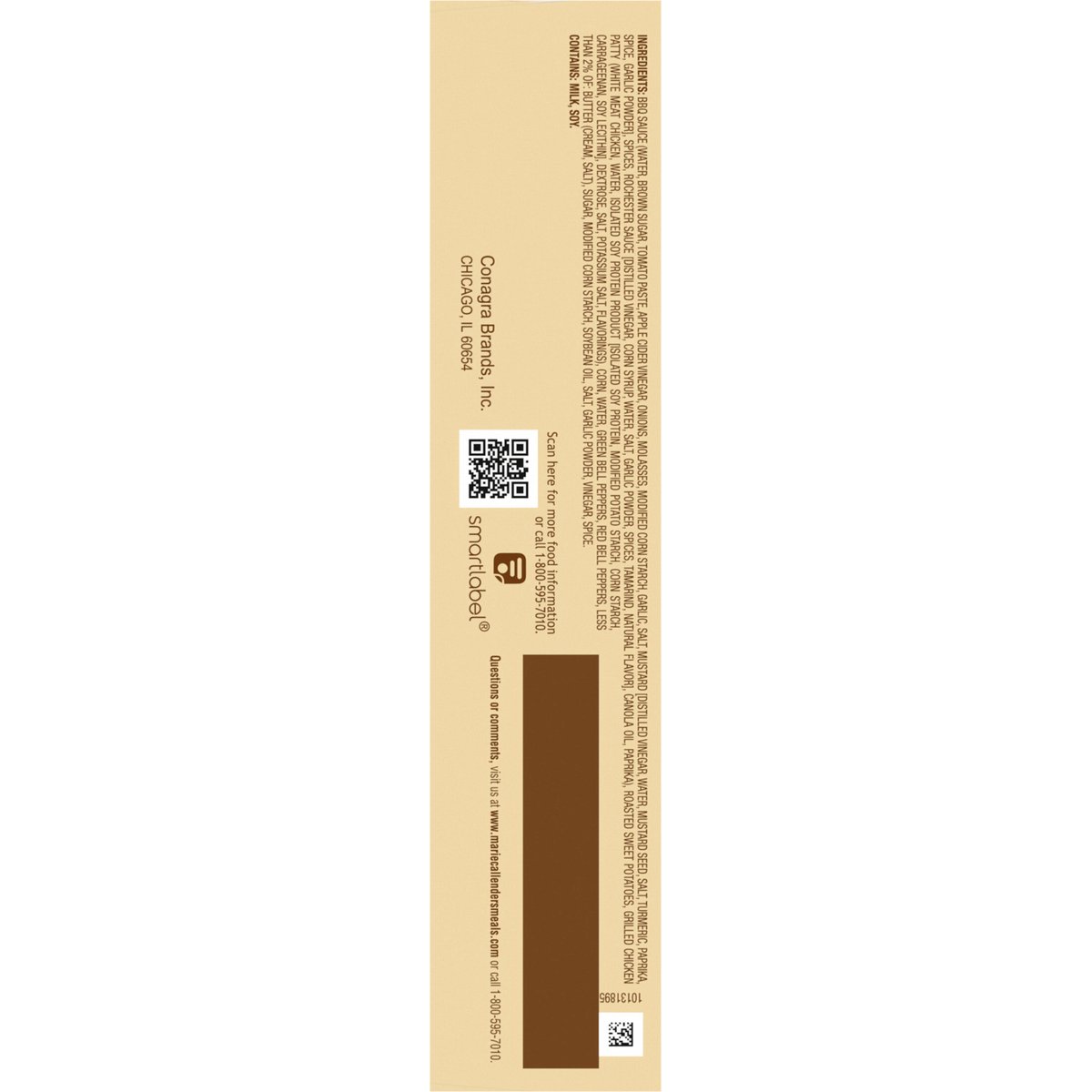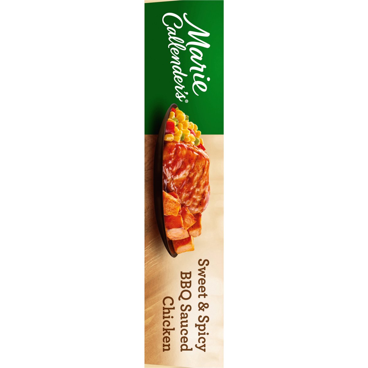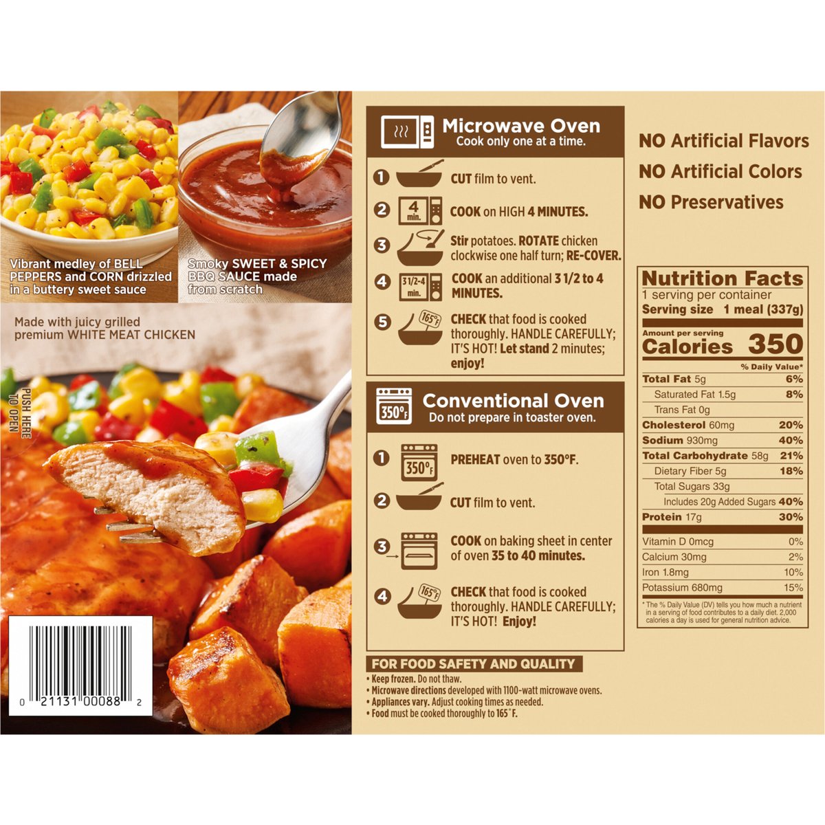 Grilled white meat chicken patty and roasted sweet potatoes topped with sweet & spicy bbq sauce and a side of bell peppers and corn. 17 g protein. Per 1 Meal: 350 calories; 1.5 g sat fat (8% DV); 930 mg sodium (40% DV); 20 g added sugars (40% DV). Vibrant medley of bell peppers and corn drizzled in a buttery sweet sauce. Smokey sweet & spicy bbq sauce made from scratch. No artificial colors. No preservatives. Inspected for wholesomeness by U.S. Department of Agriculture. www.mariecallendersmeals.com. SmartLabel: Scan for more food information or call 1-800-595-7010. Questions or comments, visit us at www.mariecallendersmeals.com or call 1-800-595-7010.