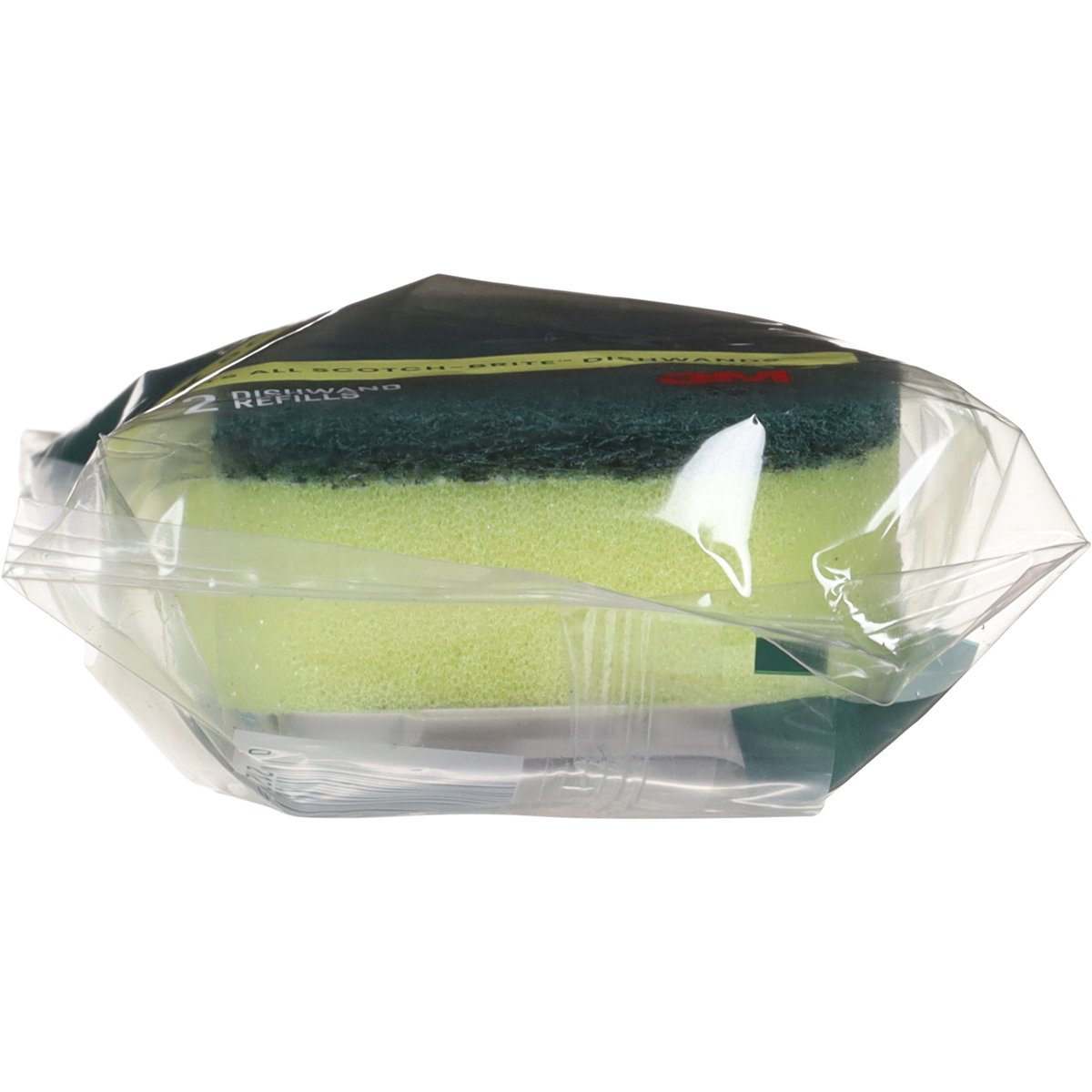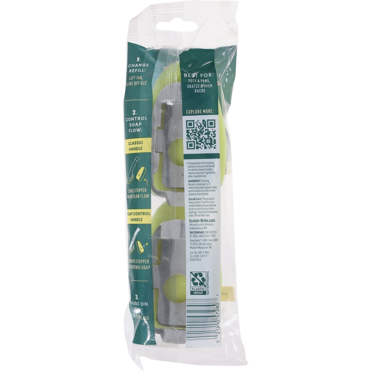 Fits all Scotch-Brite dishwands! Powerful scrubbing for non-coated cookware. Scrubber suds up with new design! Scotch-Brite.com. Questions? 1-800-846-8887. Made in Canada for 3M with globally sourced materials.