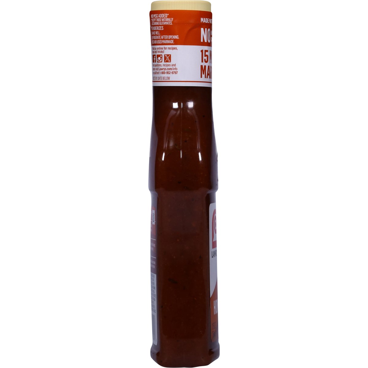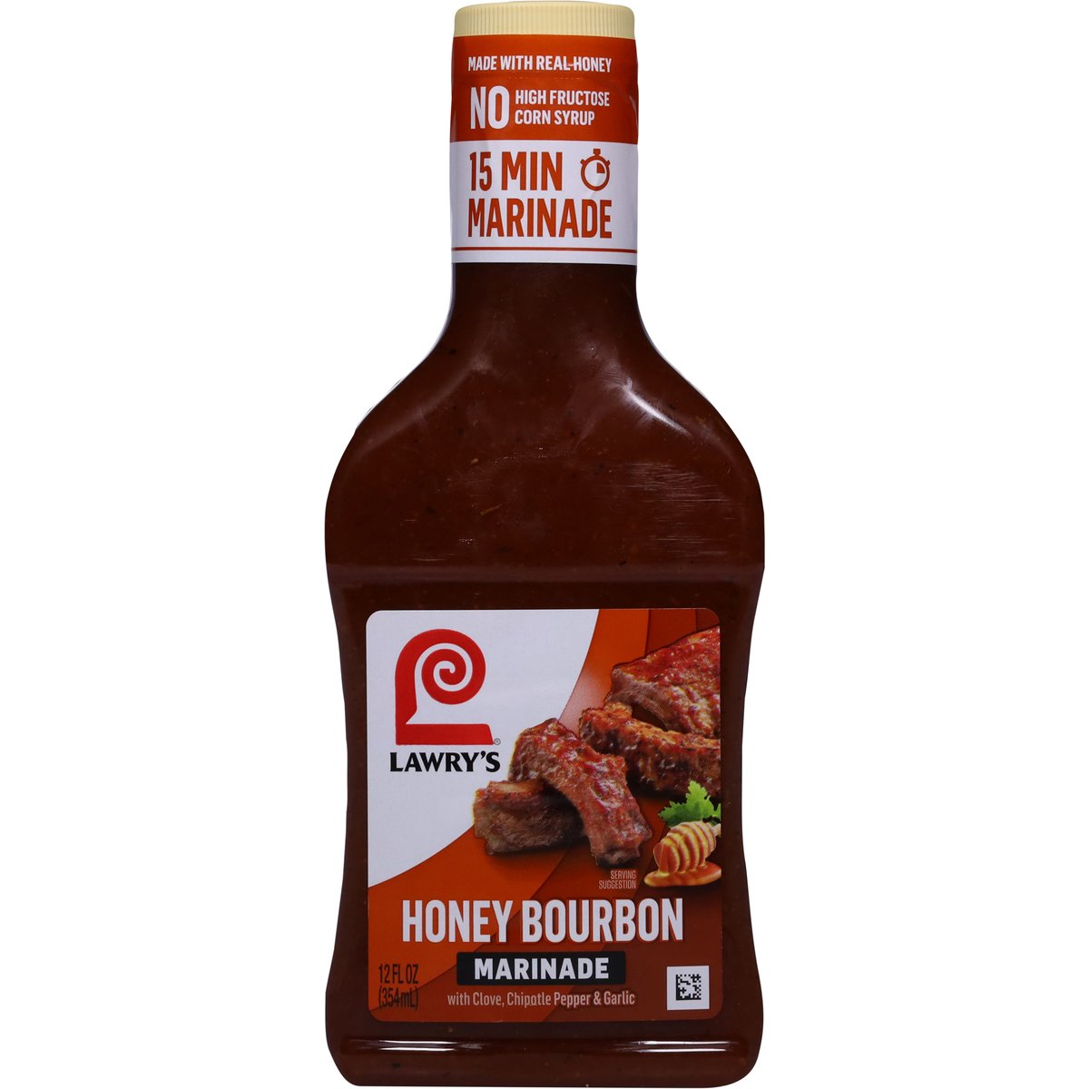 Honey bourbon marinade with clove, chipotle pepper & garlic. No high fructose corn syrup. 15 min marinade. Lawry's Marinades work great no matter how you use them! No MSG added*. *Except those naturally occurring glutamates. Lawrys.com/info. Facebook. Instagram. X. Visit us online for recipes, tips and tricks! For questions, recipes and more visit Lawrys.com/info call/text 1-800-952-9797. Packed in U.S.A.