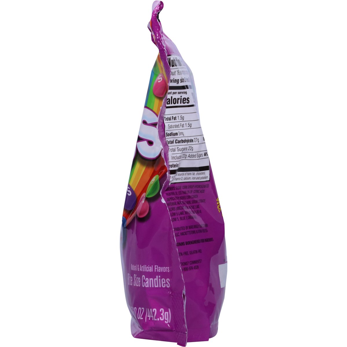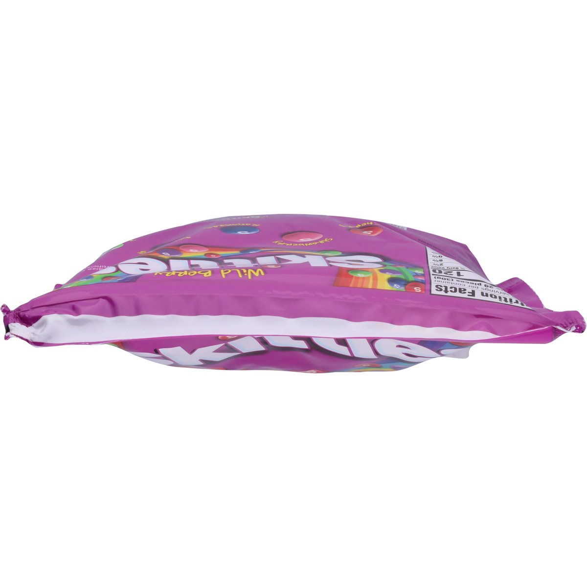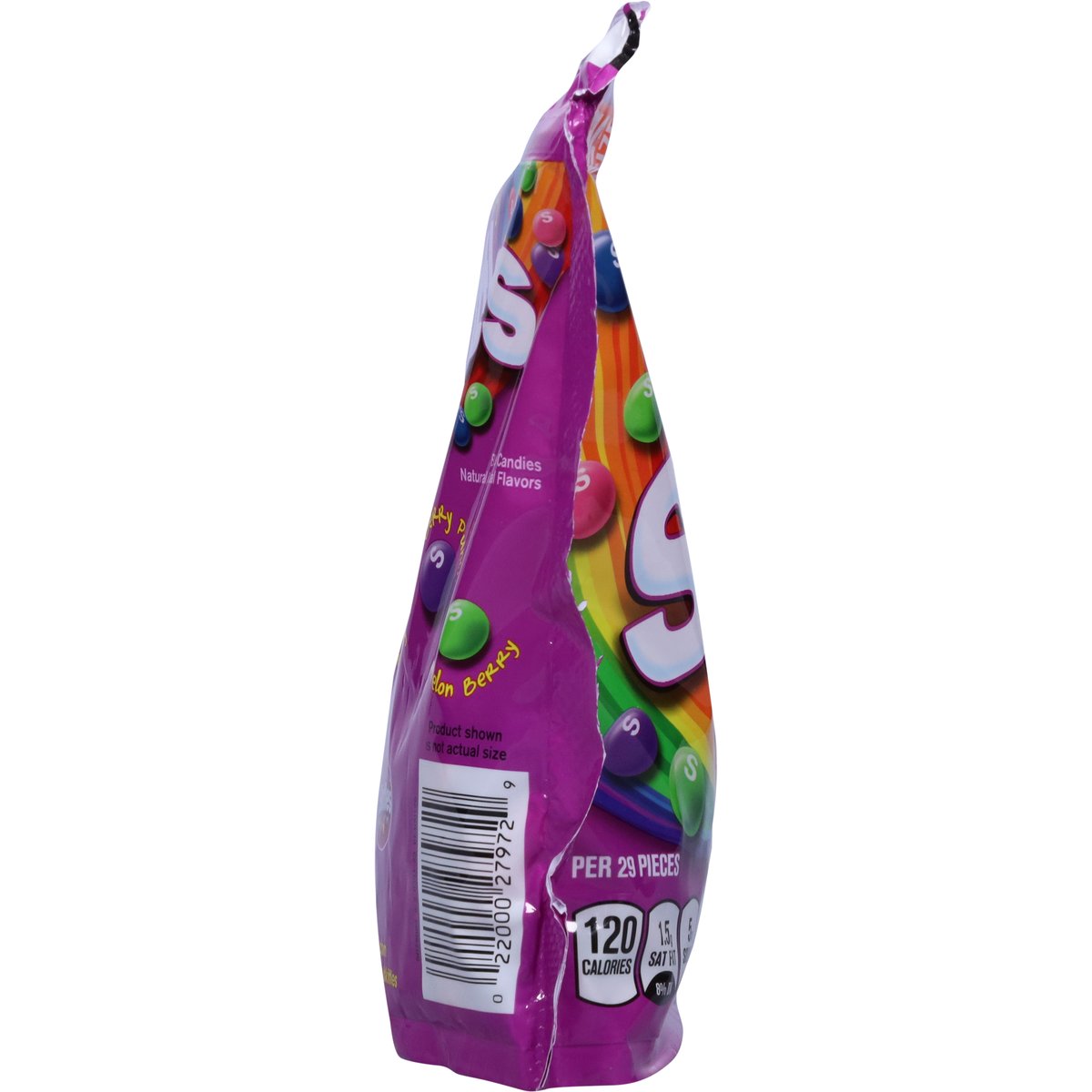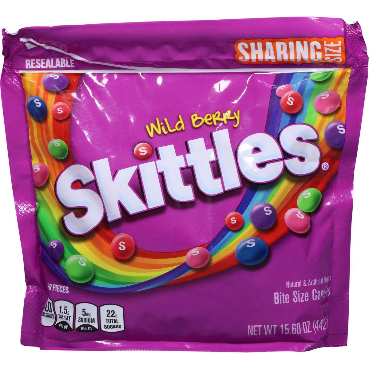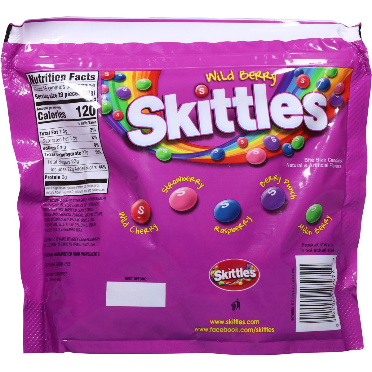 Wild cherry. Strawberry. Raspberry. Berry punch. Melon berry. Natural & artificial flavors. Per Serving: 110 calories; 1 g sat fat (5% DV); 5 mg sodium (0% DV); 21 g total sugars. About 16 servings per bag. Gluten-free. Contains bioengineered food ingredients. Gelatin-free. www.skittles.com. www.facebook.com/skittles. Questions? Comments? Call 1-800-974-4539. Resealable. Dispose of properly.
