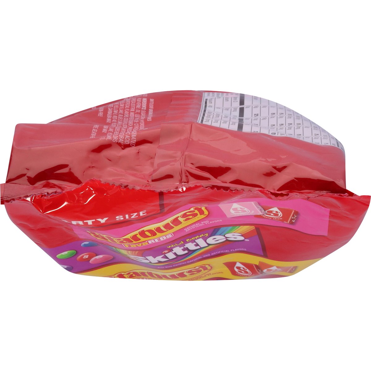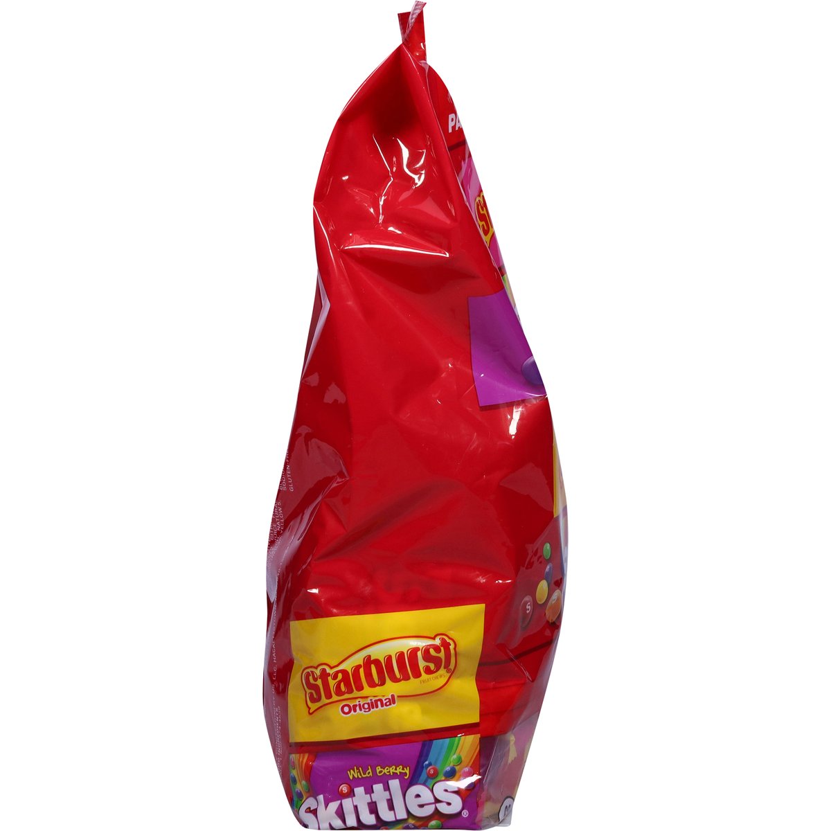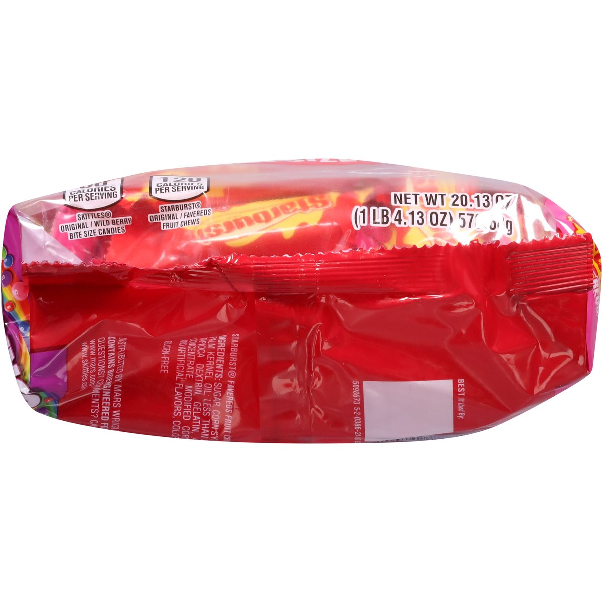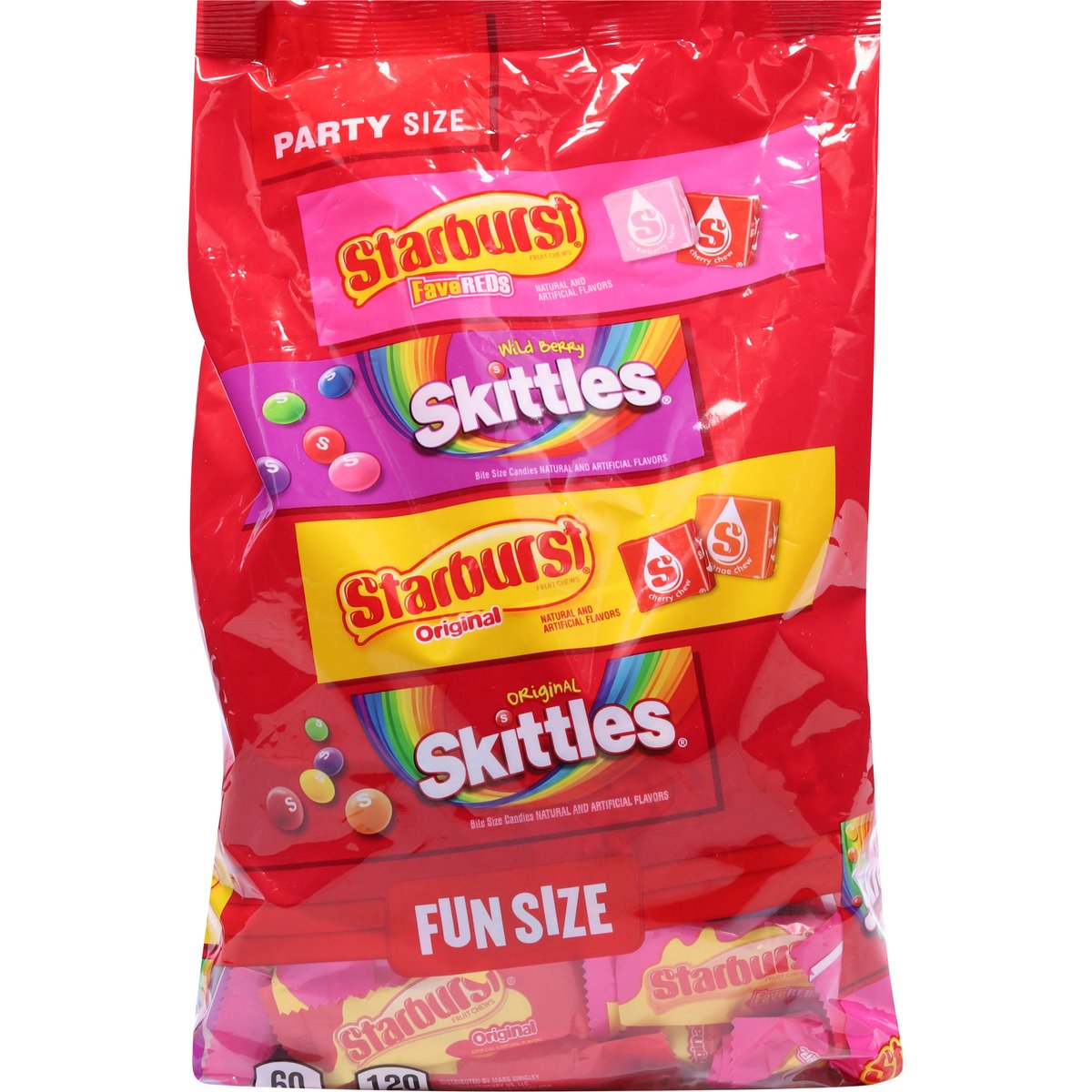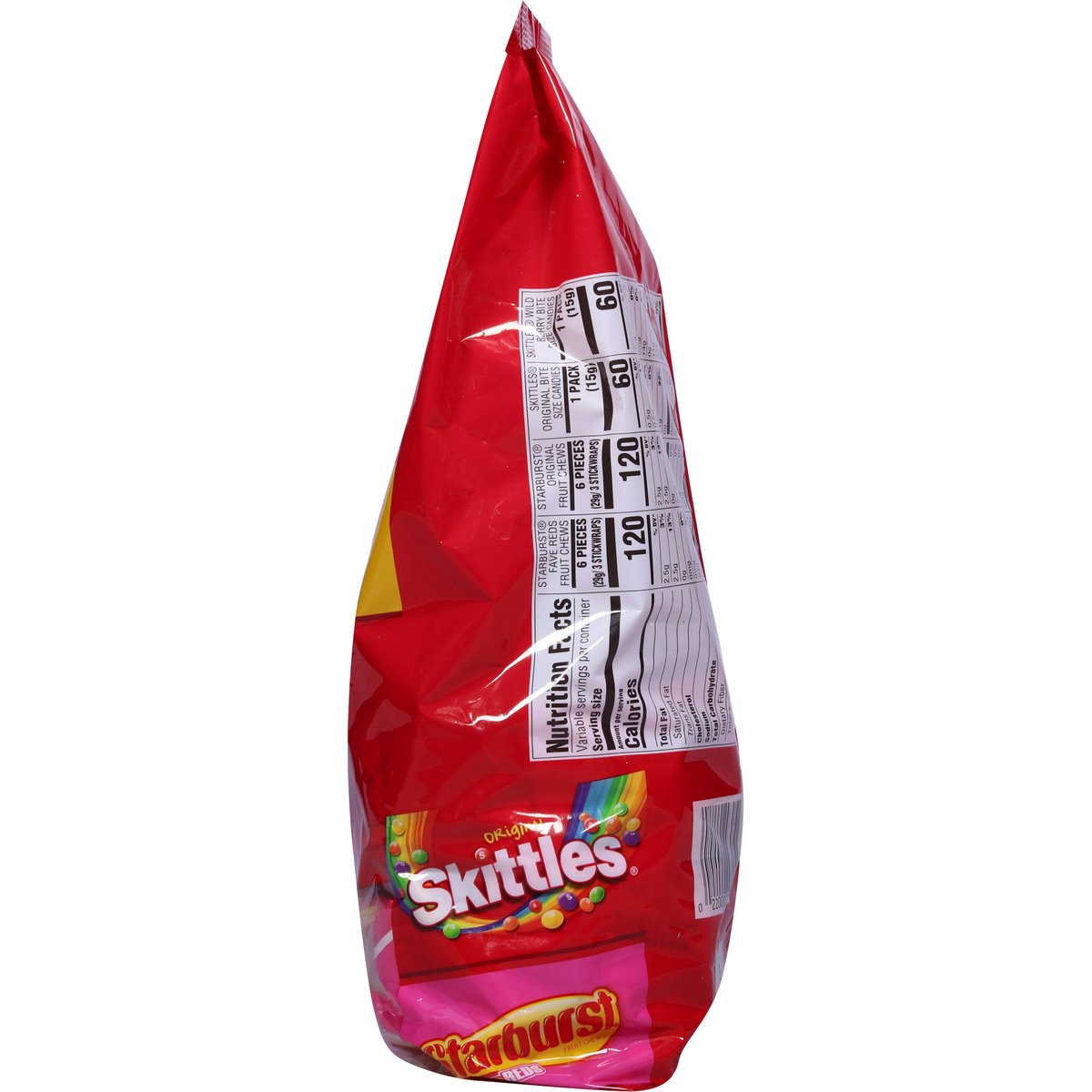 Strarburst Fave reds fruit chews; Skittles Wild berry bite size candies; Starburst Original fruit chews; Skittle Original bite size candies. Strarburst Fave Reds Fruit Chews: Natural and artificial flavors. Skittles Wild Berry Bite Size Candies: Natural and artificial flavors. Starburst Original Fruit Chews: Natural and artificial flavors. Skittle Original Bite Size Candies: Natural and artificial flavors. Skittle Original/Wild Berry: 60 calories per serving. Starburst Original/Fave Reds: 120 calories per serving. Strarburst Fave Reds Fruit Chews: Gluten free.Skittles Wild Berry Bite Size Candies: Gluten free, gelatin free. Starburst Original Fruit Chews: Gluten free. Skittle Original Bite Size Candies: Gluten free, gelatin free. Contains bioengineered food ingredients. www.mars.com. Questions? Comments? Call 1-800-974-4539.