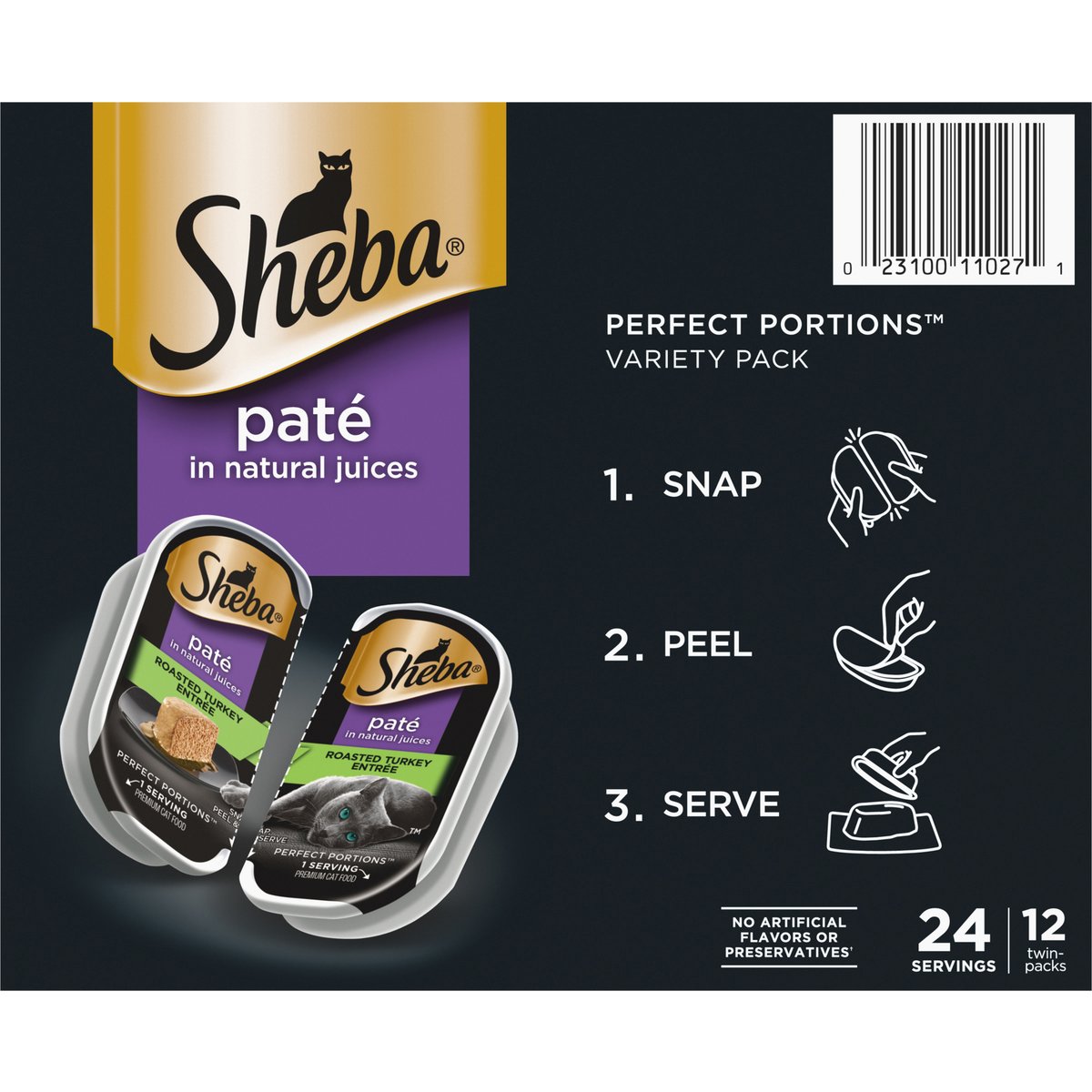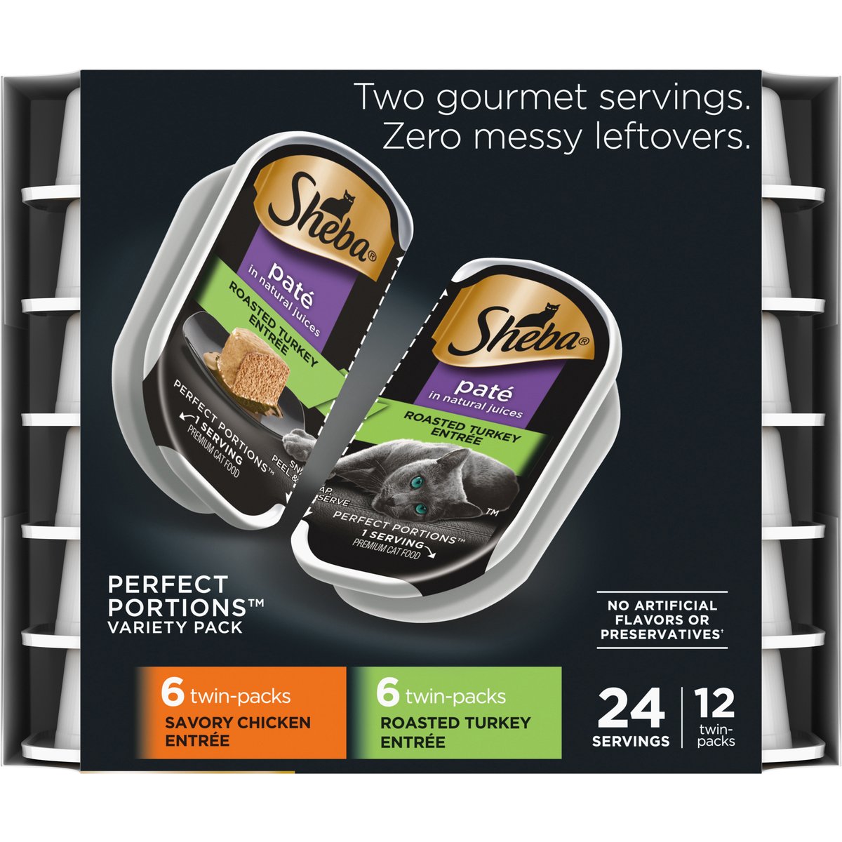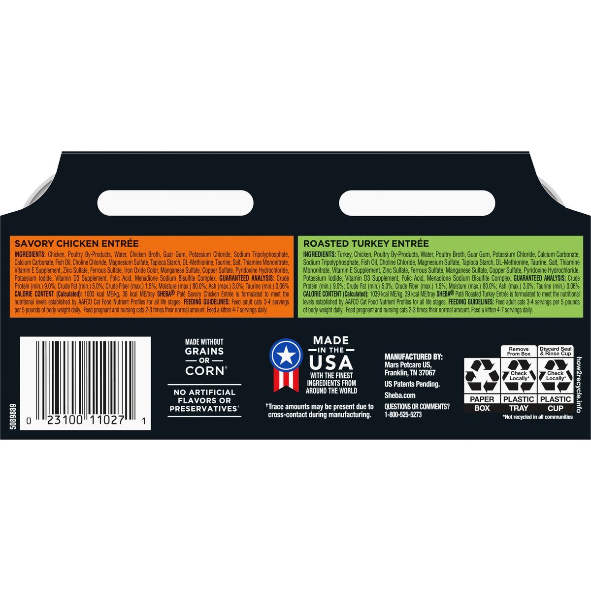 24 Servings. 12 Twin-packs. 6 Twin-packs Savory Chicken Entree. 6 Twin-packs Roasted Turkey Entree. No artificial flavors or preservatives (Trace amounts may be present due to cross-contact during manufacturing). Pate in natural juices. Two gourmet meals. Zero messy leftovers. Made without grains or corn (Trace amounts may be present due to cross-contact during manufacturing). Sheba.com. how2recycle.info. Questions or comments? 1-800-525-5273. Made in the USA with the finest ingredients from around the world.