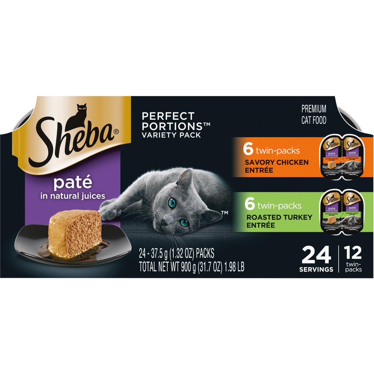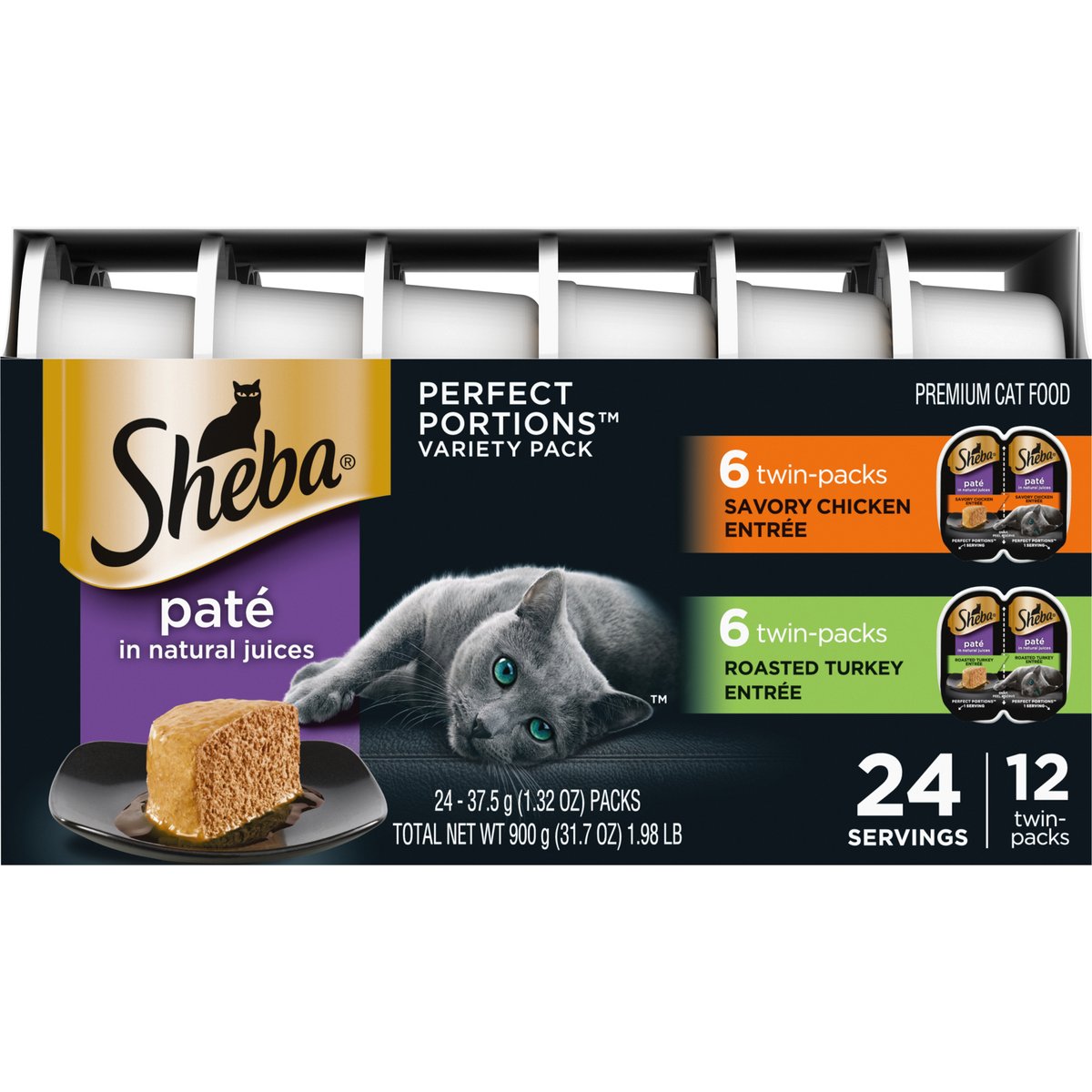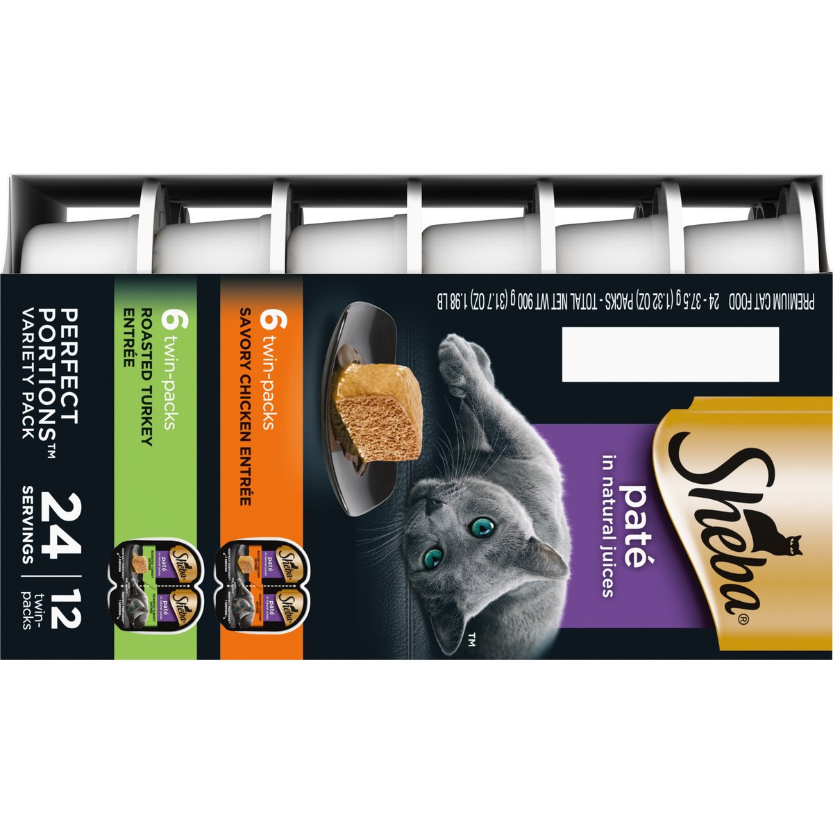 24 Servings. 12 Twin-packs. 6 Twin-packs Savory Chicken Entree. 6 Twin-packs Roasted Turkey Entree. No artificial flavors or preservatives (Trace amounts may be present due to cross-contact during manufacturing). Pate in natural juices. Two gourmet meals. Zero messy leftovers. Made without grains or corn (Trace amounts may be present due to cross-contact during manufacturing). Sheba.com. how2recycle.info. Questions or comments? 1-800-525-5273. Made in the USA with the finest ingredients from around the world.