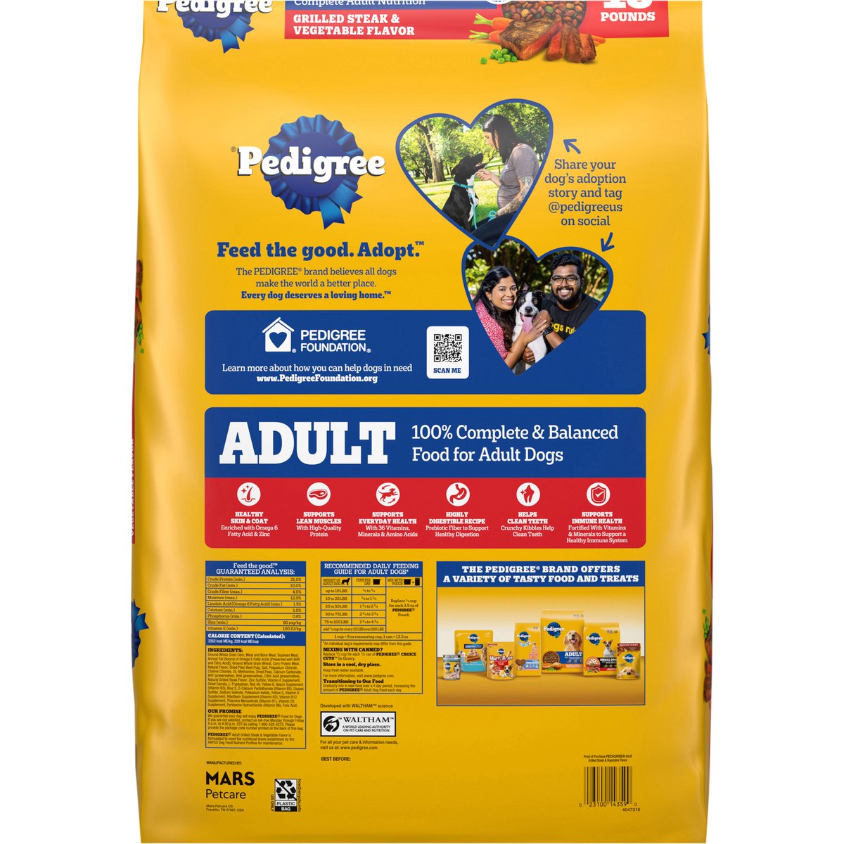 100% Complete & balanced food for adult dogs. No artificial flavors. No added sugar. No high fructose corn syrup. No added sugar. Great tasting recipe with whole grains, protein & accents of vegetables. 36 Vitamins, minerals & amino acids. Enriched with omega 6 fatty acids and zinc to help nourish skin & coat. Our Promise: We guarantee your dog will enjoy Pedigree Food for Dogs. If you are not satisfied, contact us toll-free Monday through Friday 8 a.m. to 4:30 p.m. CST by calling 1-800-525-5273. Please provide the package code number printed on the back of this bag. www.pedigree.com. how2recycle.info. Learn more about how you can help dogs in need www.PudigreeFoundation.org. Smartlabel: Scan me. For all your pet care & information needs, visit us at: www.pedigree.com. Feed the good. Adopt. The Pedigree brand believes all dogs make the world a better place. Everyday dog deserves a loving home. Pedigree Foundation: Learn more about how you can help dogs in need www.PedigreeFoundation.org. Share your dog's adoption story and tag (at)pedigreeus on social. Developed with Waltham Science. Waltham - A world leading authority on pet care and nutrition. For all your pet care & information needs, visit us at: www.pedigree.com. The Pedigree brand offers a variety of tasty food and treats: Made in the USA with the world's finest ingredients.