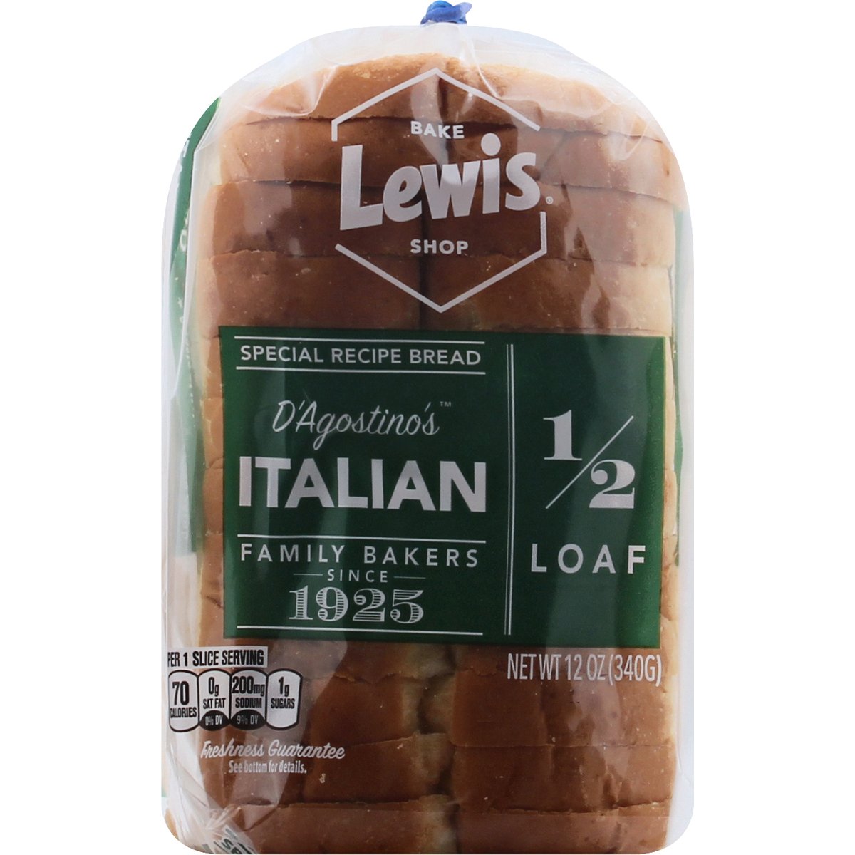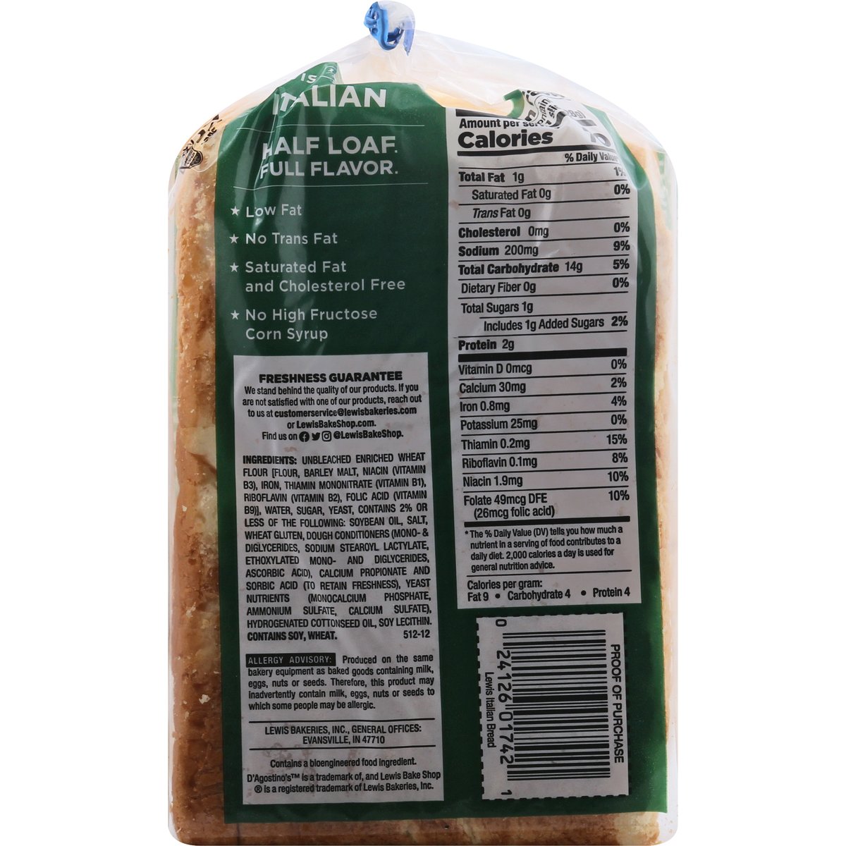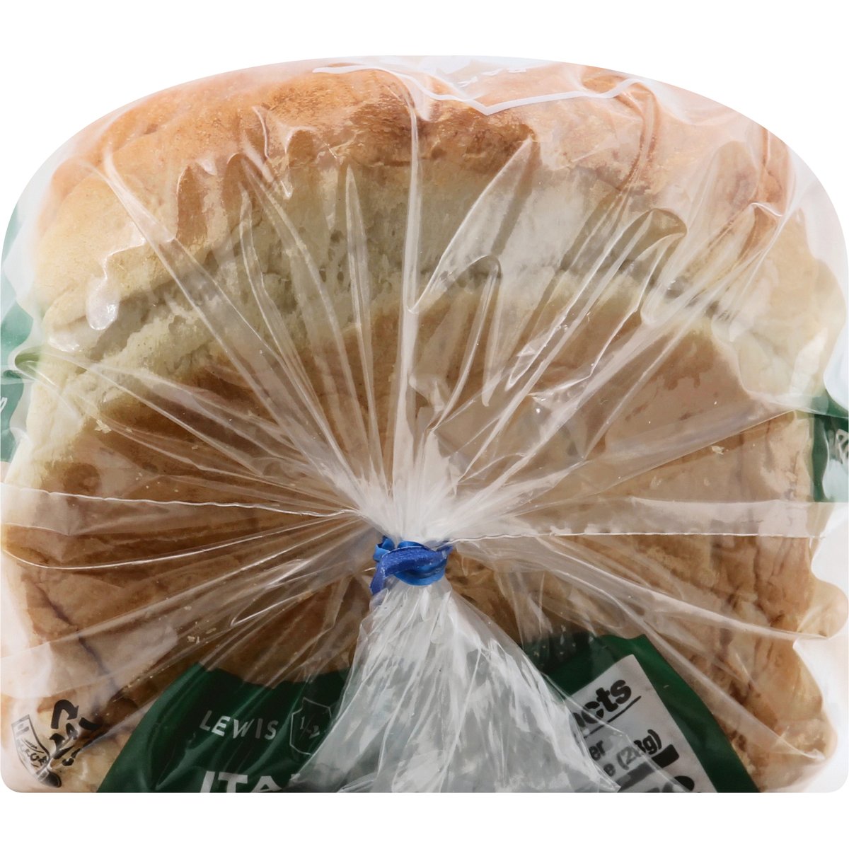Per 1 Slice Serving: 70 calories; 0 g sat fat (0% DV); 200 mg sodium (9% DV); 1 g sugars. Low fat. No trans fat. Saturated fat and cholesterol free. Contains a bioengineered food ingredient. Special recipe bread. Family bakers since 1925. A taste of Italy. No high fructose corn syrup. Half loaf. Full flavor. Freshness guarantee. We stand behind the quality of our products. If you are not satisfied with one of our products, reach out to us at customerservice(at)lewisbakeries.com or LewisBakeShop.com. LewisBakeShop.com. Find us on Facebook; Twitter; Instagram: (at)LewisBakeShop. BCTGM: Bakery Confectionery Tobacco Workers & Grain Millers union made. AFL CIO CLC.
