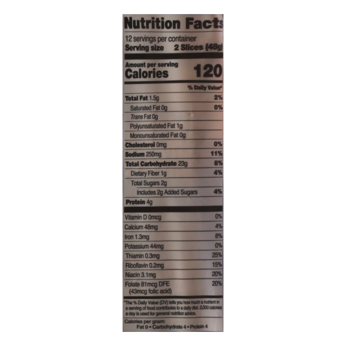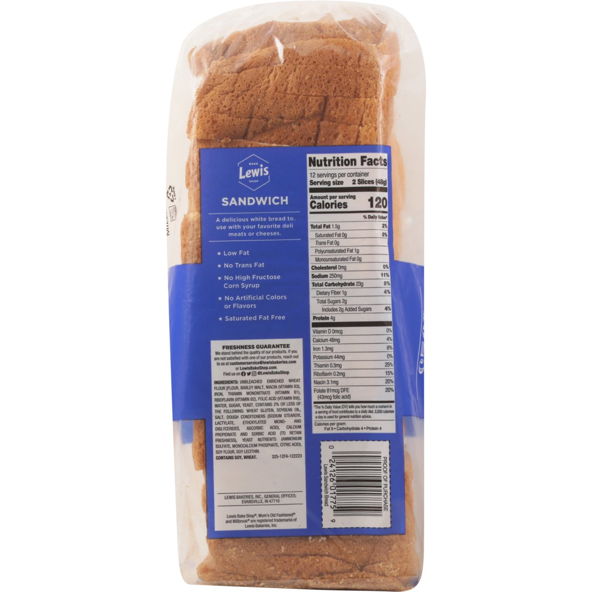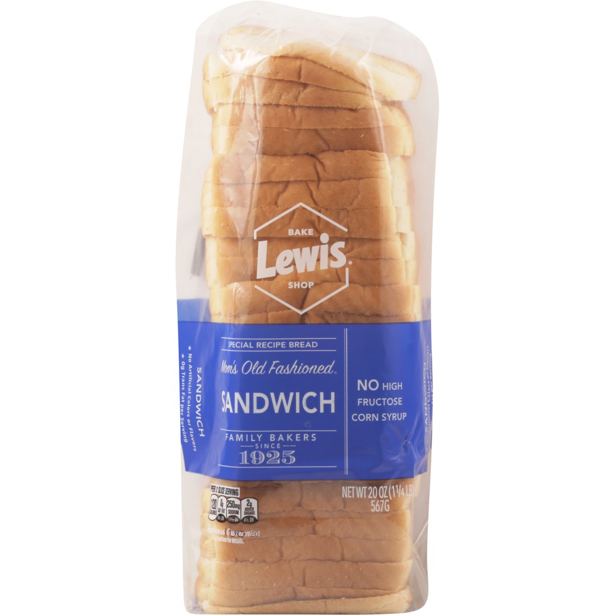 No artificial colors or flavors Per 2 Slice Serving: 120 calories; 0 g sat fat (0% DV); 250 mg sodium (11% DV); 2 g added sugars (4% DV). 0 g trans fat per serving. Low fat. No trans fat. Saturated fat free. Mom's old fashioned sandwich. Family bakers since 1925. Special recipe bread. No high fructose corn syrup. A delicious white bread to use with your favorite deli meats or cheeses. Freshness Guarantee. See bottom for details. Freshness Guarantee: We stand behind the quality of our products. If you are not satisfied with one of our products, reach out to us at customerservice@lewisbakeries.com or lewisbakeshop.com. BCTGM: Bakery Confectionery Tobacco Workers & Grain Millers. Union Made. APL-CIO CLC. lewisbakeshop.com. Find us on: Facebook; Twitter; Instagram: @LewisBakeShop.