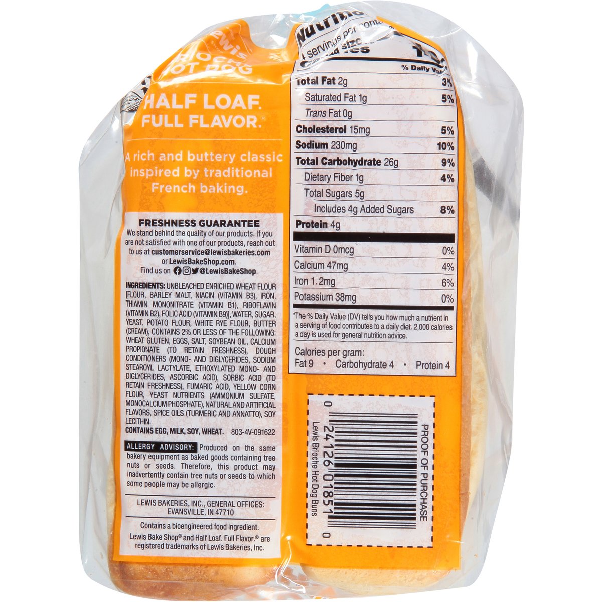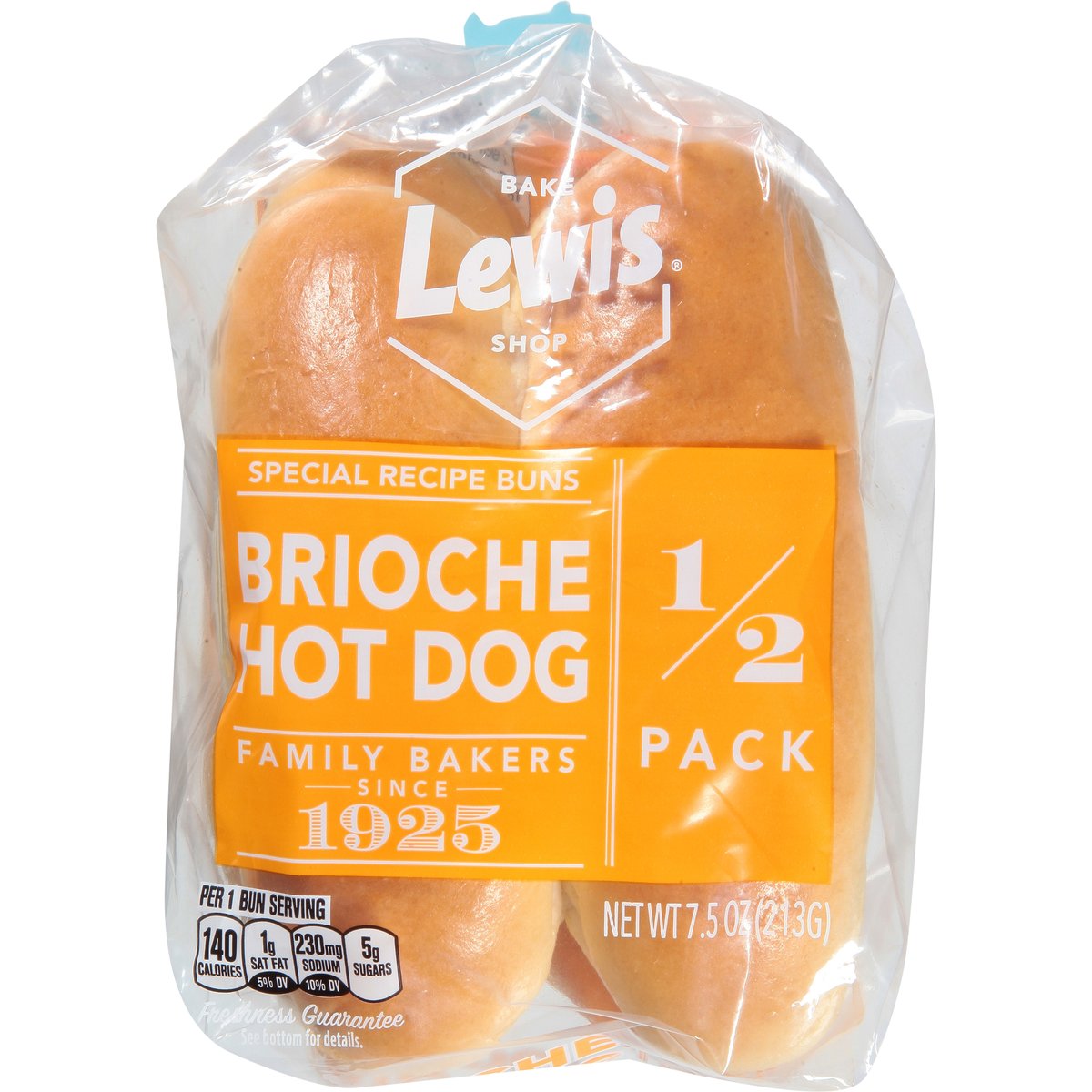 Per 1 Bun Serving: 140 calories; 1 g sat fat (5% DV); 230 mg sodium (10% DV); 5 g sugars. Contains a bioengineered food ingredient. Special recipe buns. Family bakers since 1925. 1/2 Pack. Half loaf. Full flavor. A rich and buttery classic inspired by traditional French baking. Freshness Guarantee: We stand behind the quality of our products. If you are not satisfied with one of our products, reach out to us at customerservice(at)lewisbakeries.com or LewisBakeShop.com. LewisBakeShop.com. Find us on: Facebook. Instagram. Twitter. (at)LewisBakeShop. BCTGM: Bakery Confectionery Tobacco Workers & Grain Millers union made. AFL CIO CLC.